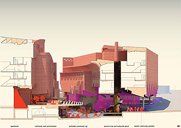 The project explores the idea of threshold by understanding these large urban gestures as an architectural envelope and container for activity. A detailed understanding of the articulate edges of street interior with parapets, elevation profile, cornicing, plaster moldings and verandahs inspired me to furnish exterior public space and create tactile living space around the edges of the buildings. Form has been achieved through negotiating site relationships and by pushing and pulling the programs against interior courtyard public spaces that weave between them.