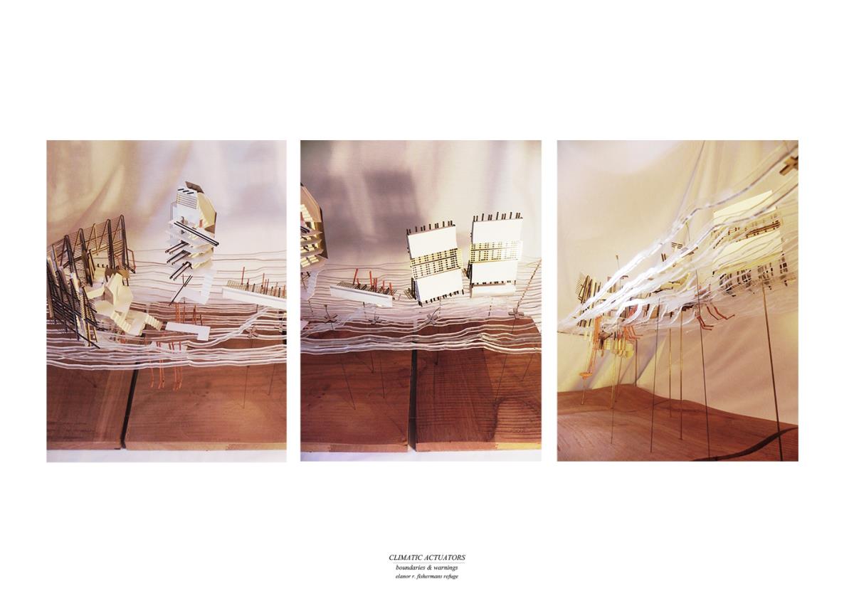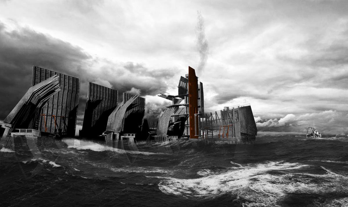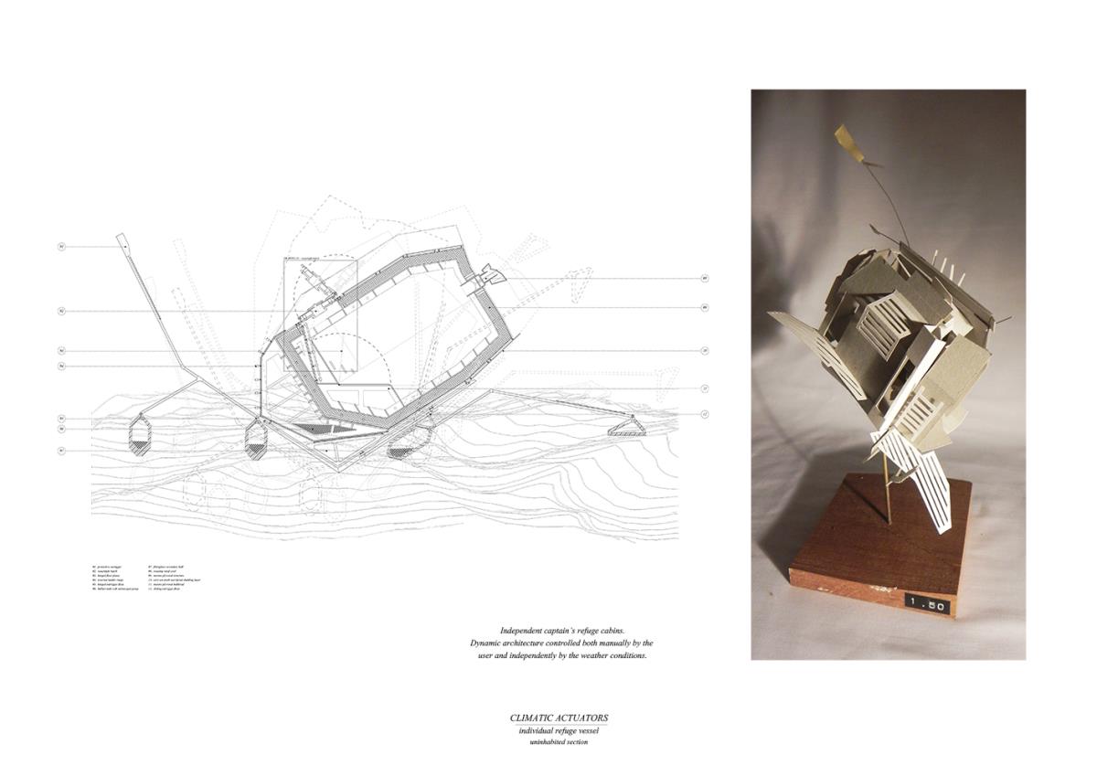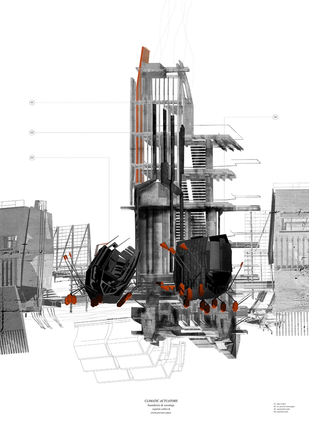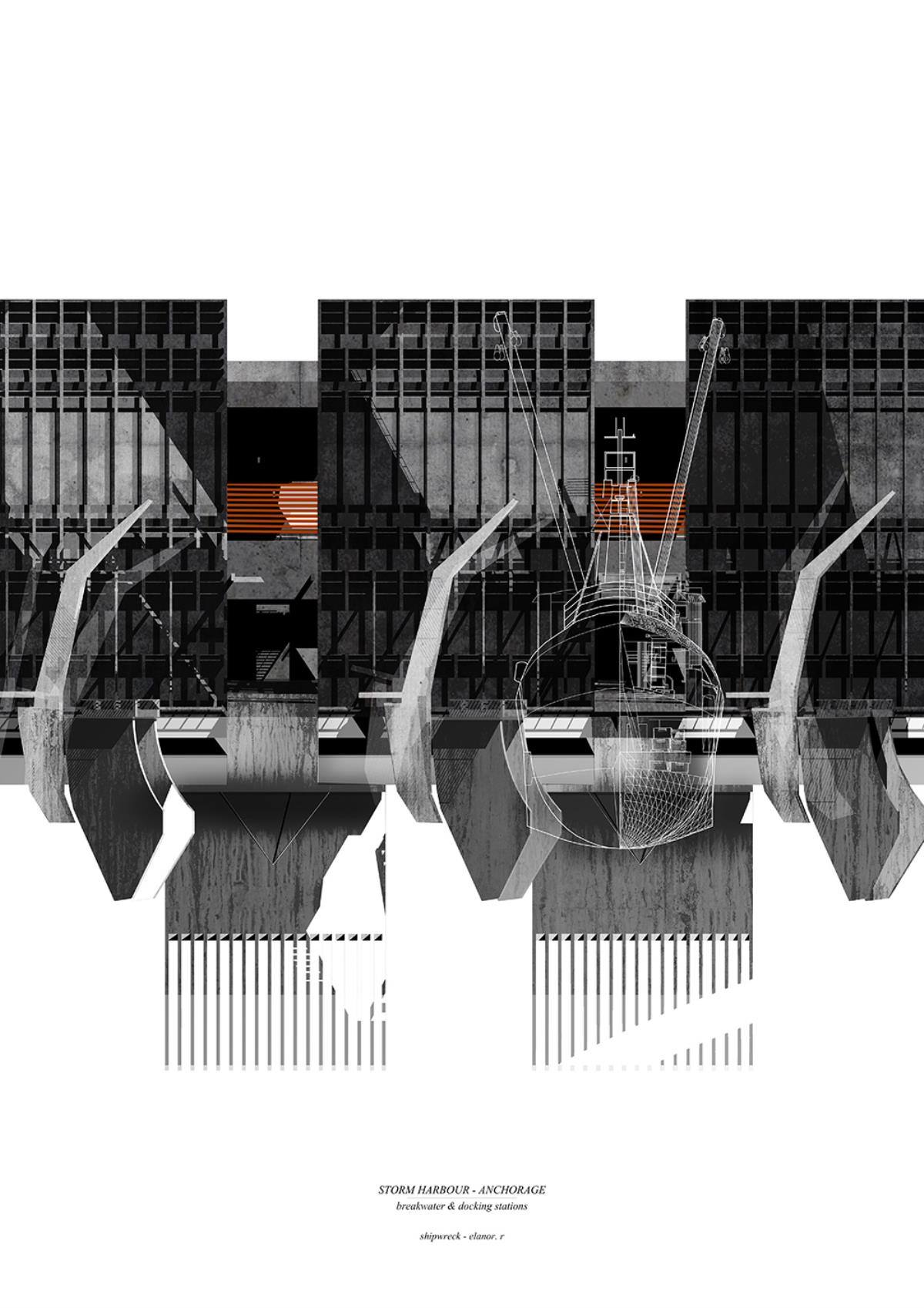 Responsive to specific weather conditions and changing environments, climatic actuators endeavour to protect the marine traffic and it inhabitants. Each of the refuges respond to the specific conditions directly linked to the date and month in which the ship was wrecked; such as tide heights, wind speed and pressure, thus are unique to each situation. Whilst static and monumental during calm weather, storms expose the spectacle of the architecture. Mooring docks rise open and whistle their warning, as ballasts fill with storm waves, allowing boats to enter the building. Low pressure pipes steam as the water level rises as indication of an incoming storm, whilst individual refuges snap into upright positions to protect their inhabitants and provide an illusion of the safety of land.