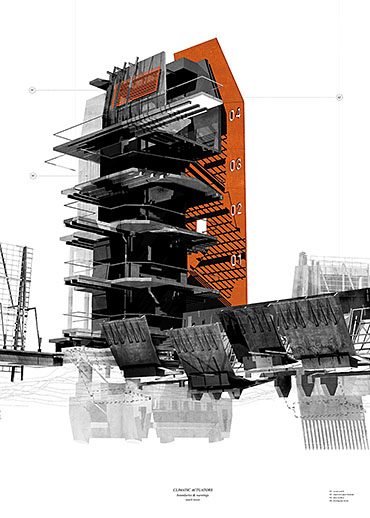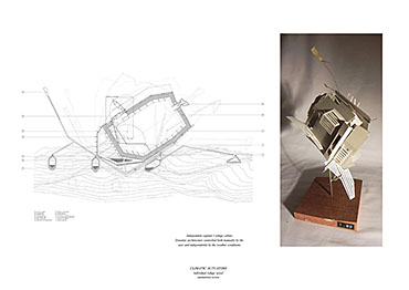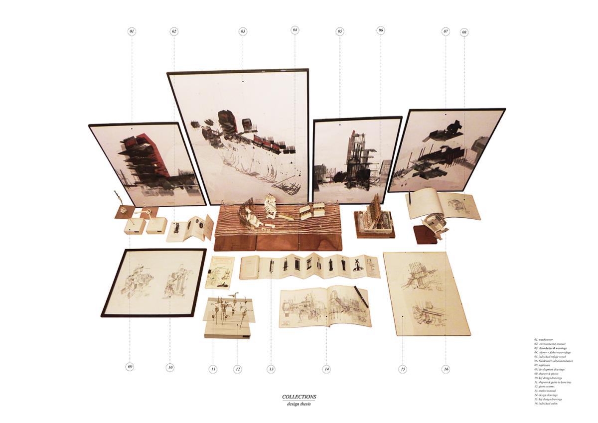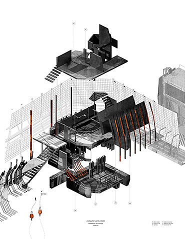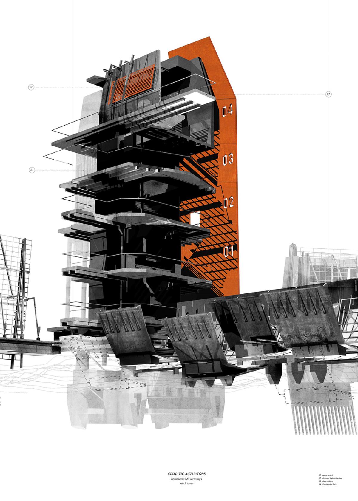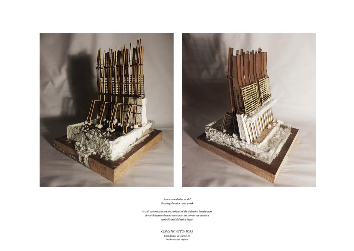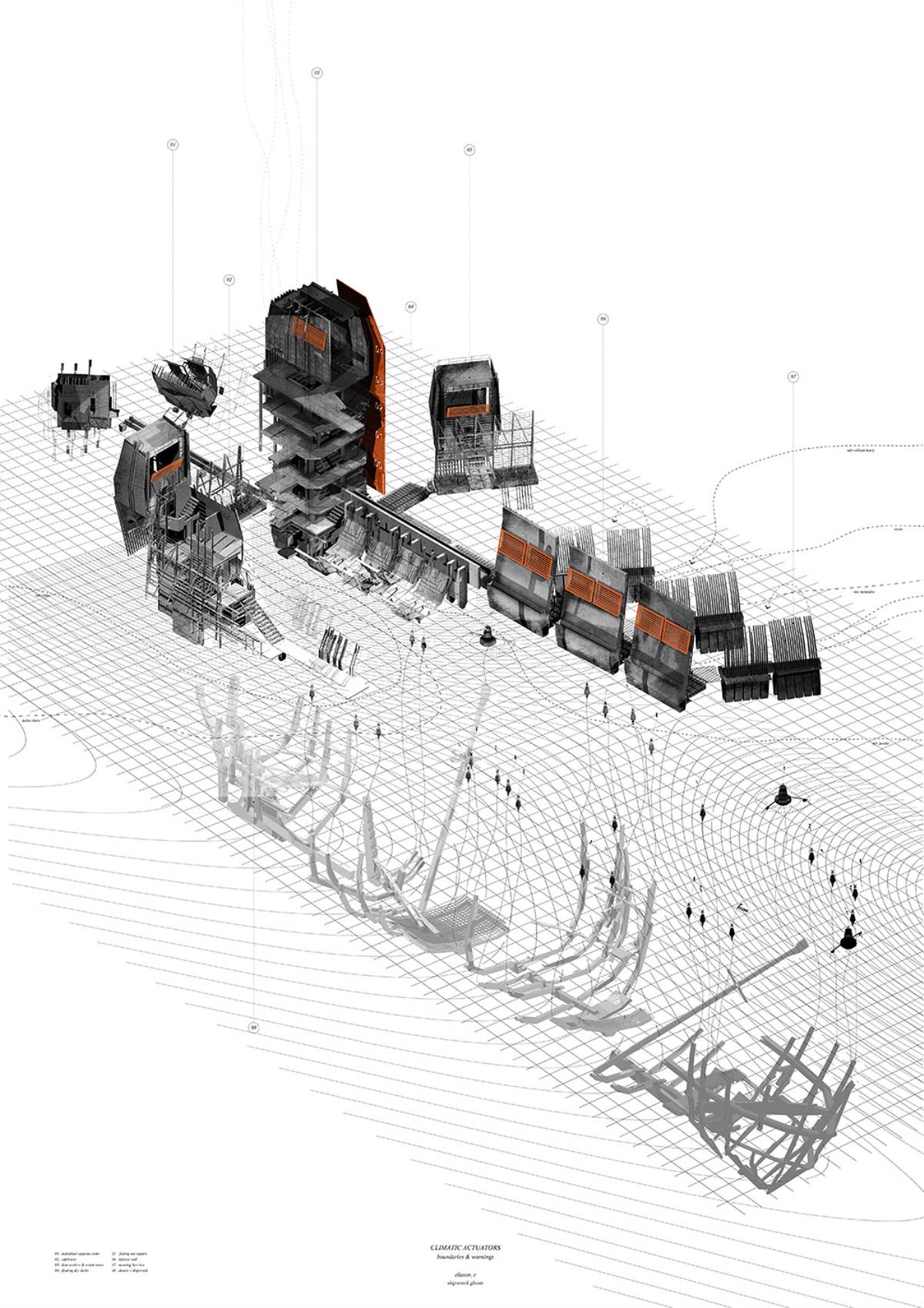 Responsive to specific weather conditions and changing environments, climatic actuators endeavour to protect the marine traffic and it inhabitants. Each of the refuges respond to the specific conditions directly linked to the date and month in which the ship was wrecked; such as tide heights, wind speed and pressure, thus are unique to each situation. Whilst static and monumental during calm weather, storms expose the spectacle of the architecture. Mooring docks rise open and whistle their warning, as ballasts fill with storm waves, allowing boats to enter the building. Low pressure pipes steam as the water level rises as indication of an incoming storm, whilst individual refuges snap into upright positions to protect their inhabitants and provide an illusion of the safety of land.