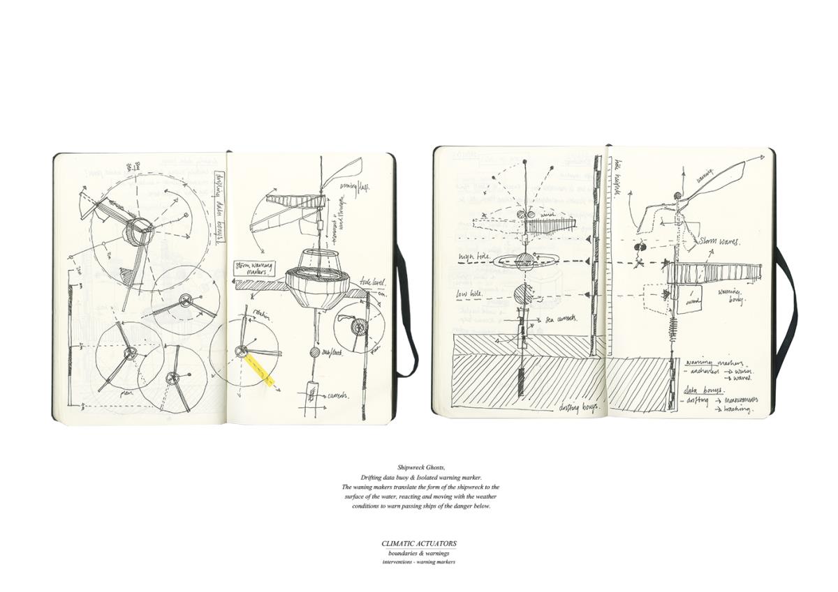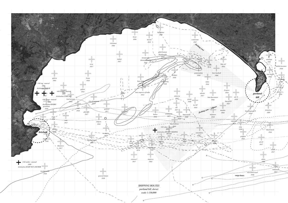 Anchored to specific shipwrecks based upon the Shipwreck Guide to Lyme Bay, disparate storm refuges aim to enhance the relationship between the sea and its boundaries: the sea floor, the water’s surface, the land and the atmosphere. Danger markers translate the form of the wreck as shipwreck ghosts; both a visual defence on the surface of the water for passing boats and symbolic tombstones of the disaster below.