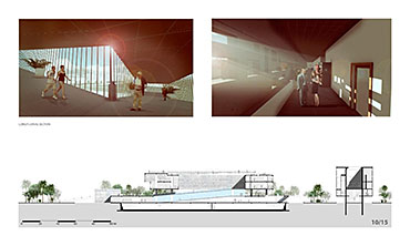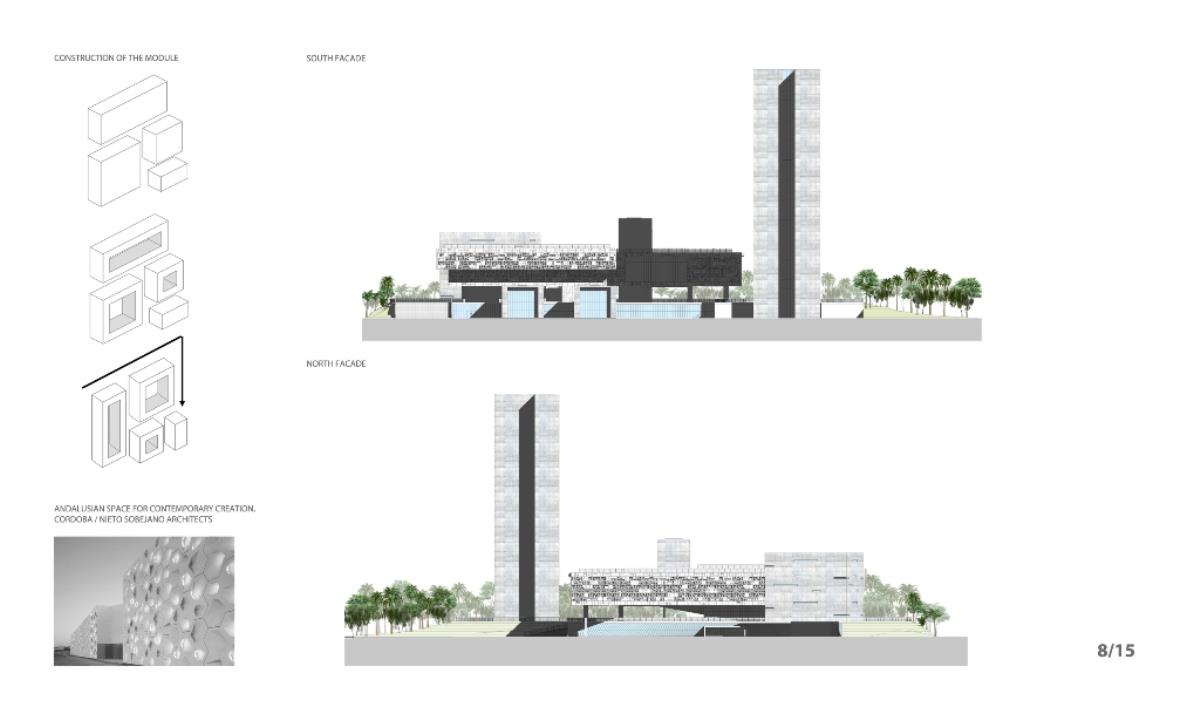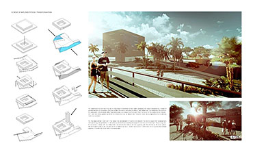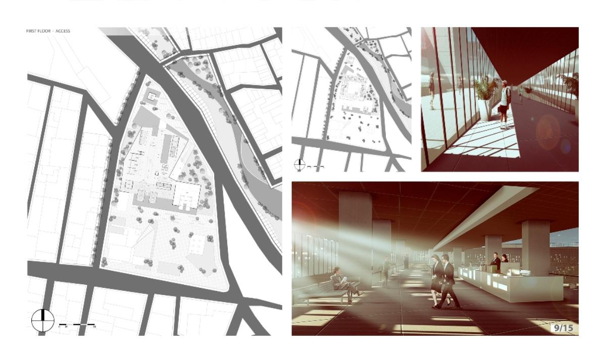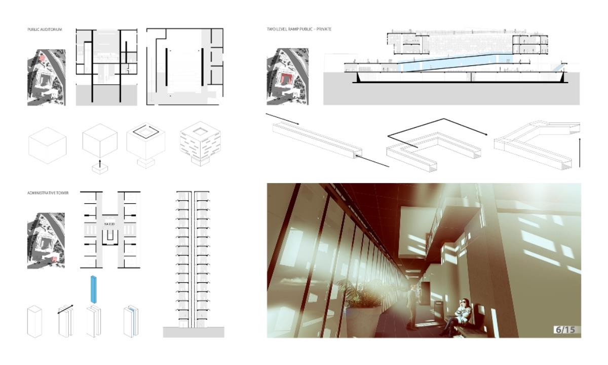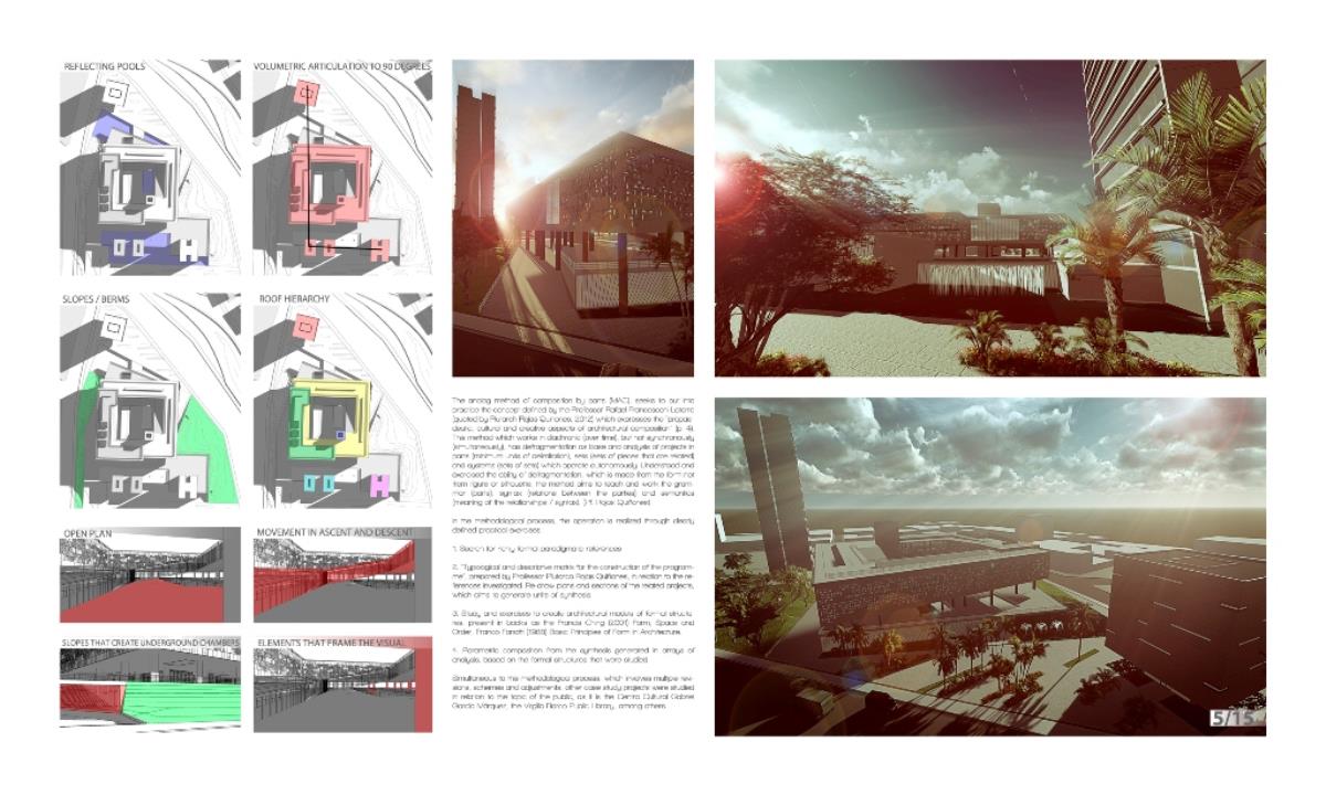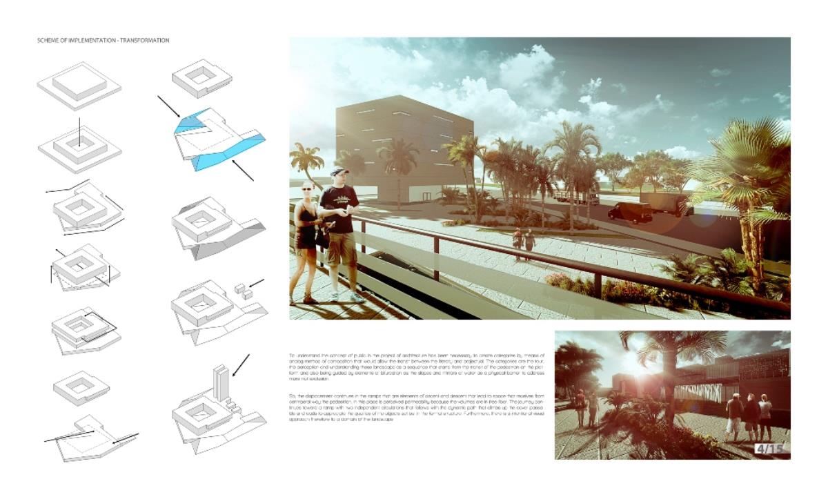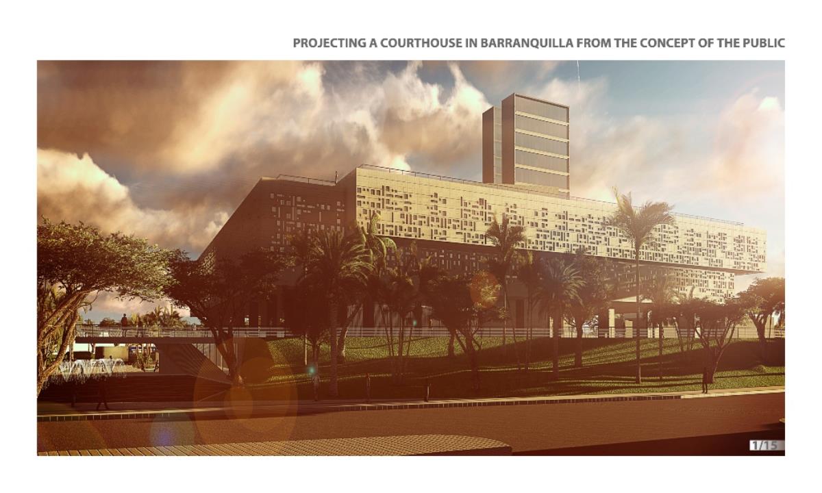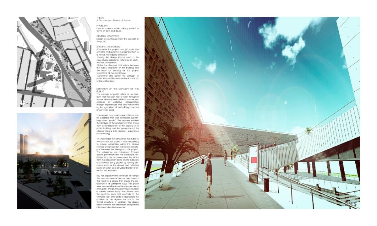 Projecting a Courthouse in Barranquilla from the Concept of the Public Part 2 Project 2014 Yesid Fabian Bernal OchoaJuan Pablo Guiza ChevezMaria Camila Torres Briceño Pilot University of Colombia Bogota | Colombia THEME:A Courthouse – Palace of JusticePROBLEM: How to make a public building public? In terms of form and figure.GENERAL OBJECTIVE: Design a courthouse from the concept of the public. DEFINITION OF THE CONCEPT OF THE PUBLIC The concept of public refers to the freedom that the user has to walk through a space, allowing the inhabitant to raise perceptions of collective appropriation through experiences that are transmitted by the symbolism of the building or space of common good.This project is a courthouse in Barranquilla, Colombia that was developed by thinking about “public”. The process entailed the analysis of the predicament that arises from a consideration of the security of a public building and the perception of the citizens (taking into account experience and memory). To understand the concept of the public in the architectural project it was necessary to create categories using the analog method of composition that allows a dialogue between the literary and the project. The categories are movement through space, perception and the landscape, understanding this as a sequence that starts from the pedestrian traffic on the sidewalk and likewise being guided by forking elements such as the slopes and reflecting pools of water as a physical barrier of direction not exclusion.So, the displacement continues on ramps that are elements of ascent and descent that lead to a space that greets the pedestrian in a centripetal way. This place feels permeability since the volumes are in open plan. The journey continues towards a curved central ramp that follows with the dynamic path that ascends to the walkable roof and leads to appreciate the qualities of the objects set out in the formal structure. In addition, the design looks to frame the landscape and provide intentional visual experiences.The analog method of composition by parts (MAC), seeks to put into practice the concept defined by the Professor Rafael Francesconi Latorre (quoted by Plutarch Rojas Quinones, 2012) which expresses the "propaedeutic, cultural and creative aspects of architectural composition" (p. 4). This method which works in diachronic (over time), but not synchronously (simultaneously), has defragmentation as base and analysis of projects in parts (minimum units of delimitation), sets (sets of pieces that are related) and systems (sets of sets) which operate autonomously. Understood and exercised the ability of defragmentation, which is made from the Tutor(s) Plutarco Eduardo Rojas Quiñones