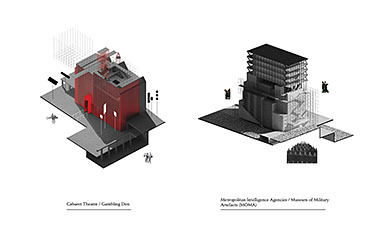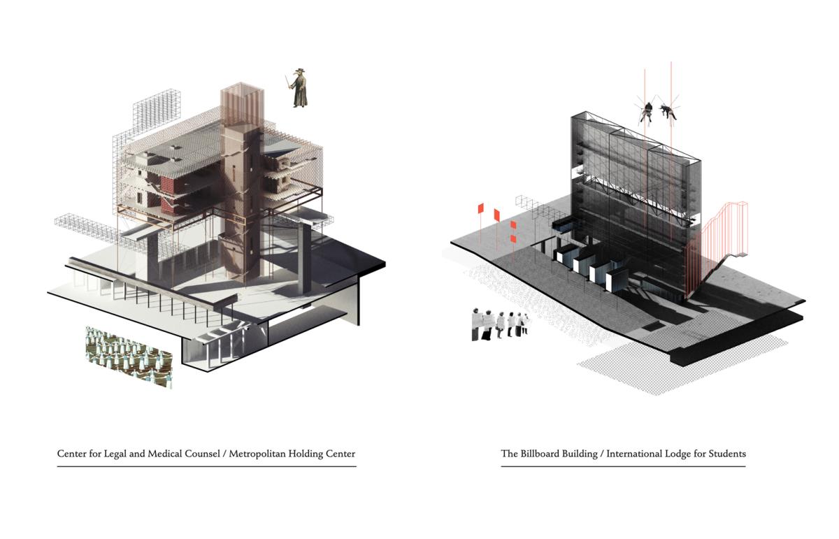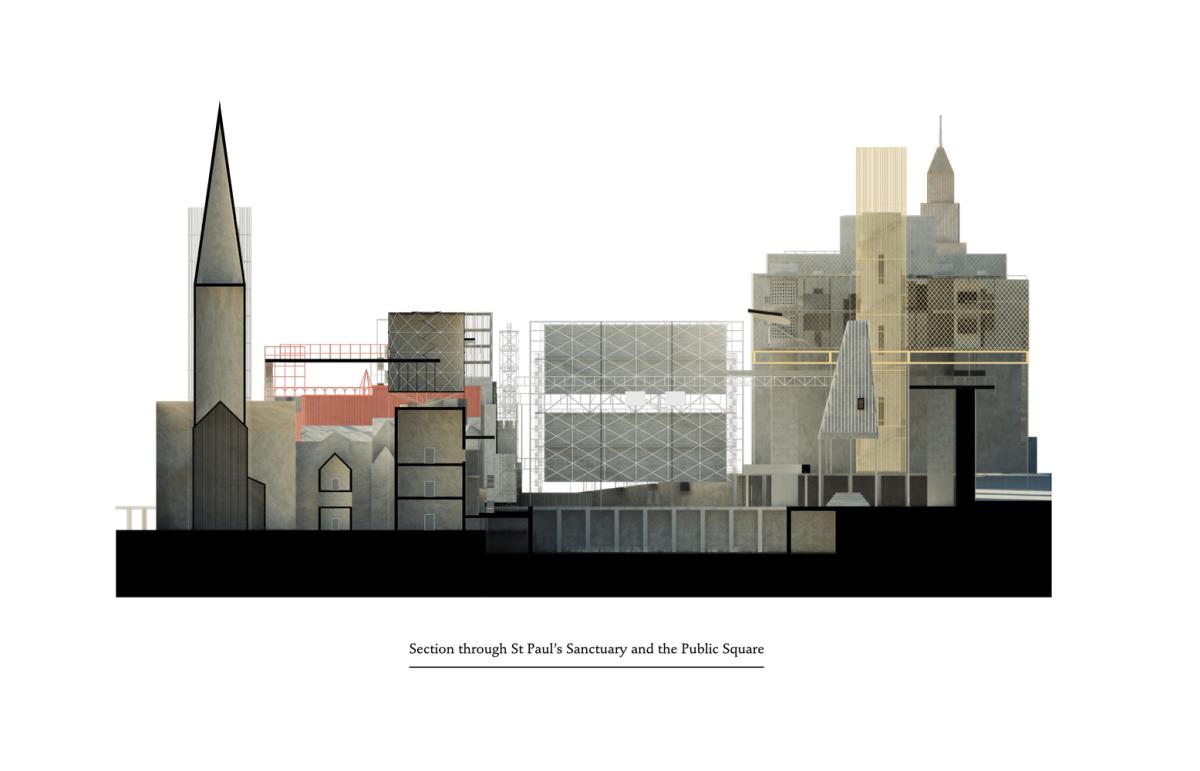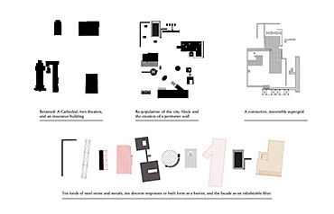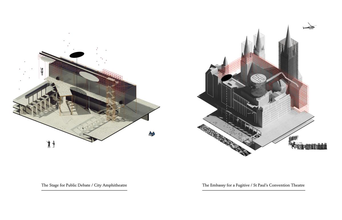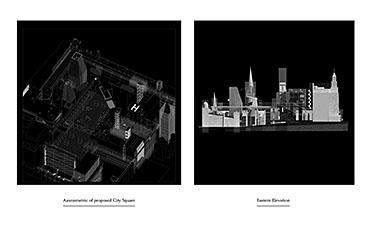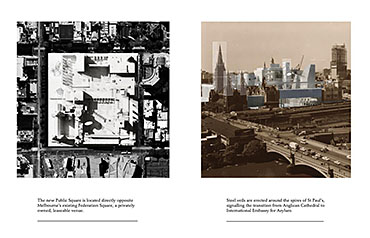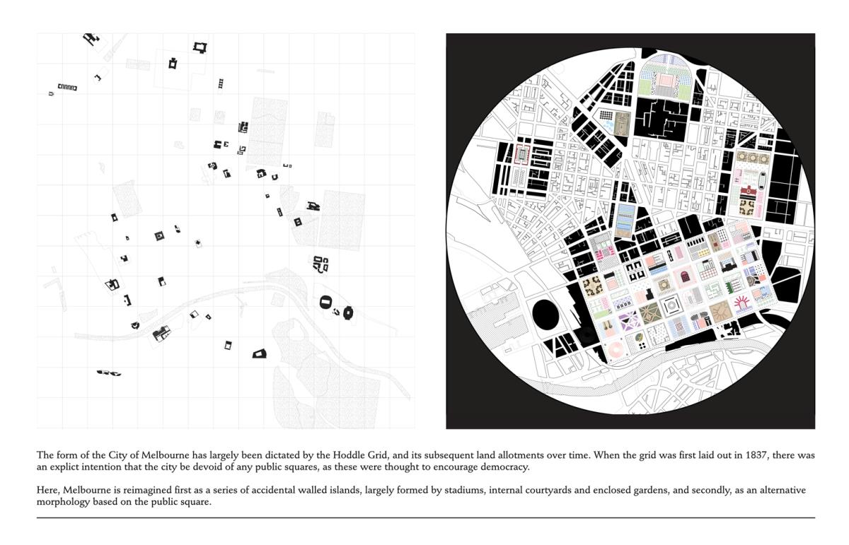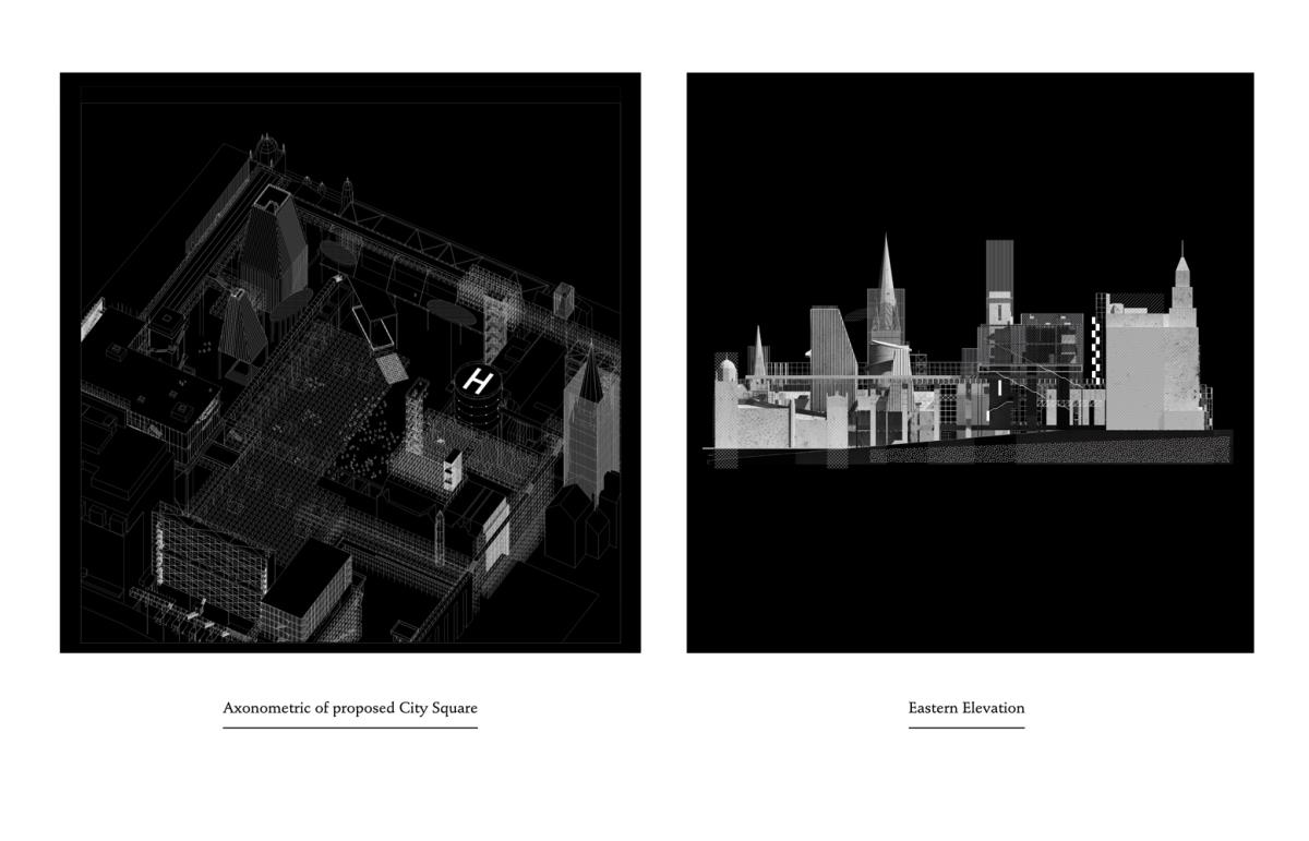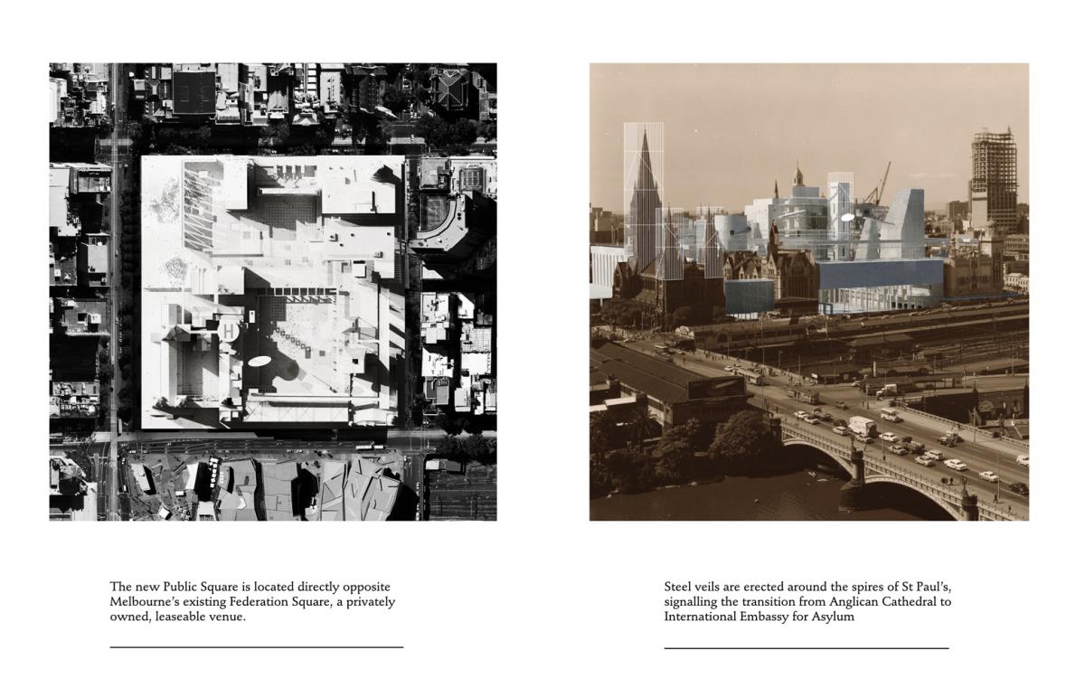 "Steel Veils, Stone Islands and Gold Corrals is a reactionary project to the absence of a true public square in the City of Melbourne, Australia. The strategy for proposing a new square adopts the notion of the architecture of the city as inherently political, and as a composition of several parts suspended somewhere between imagined scenarios and physical reality.