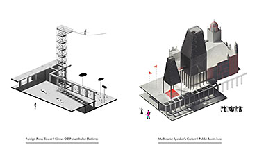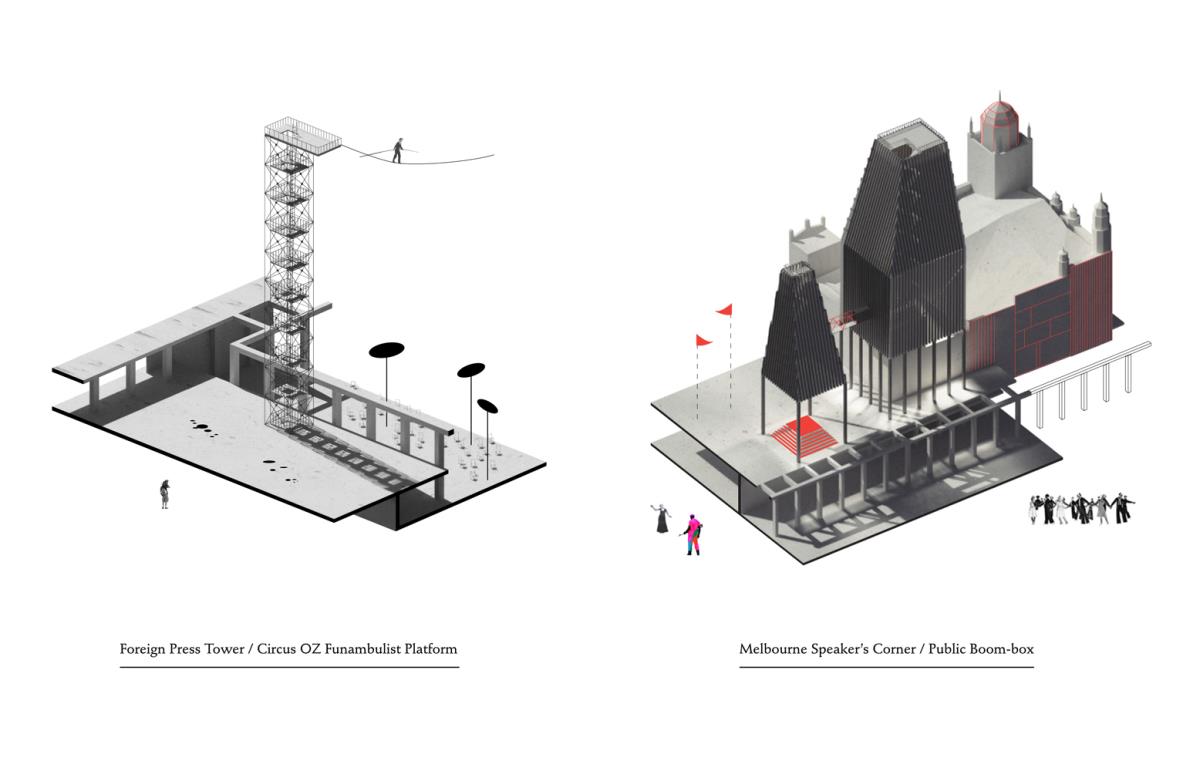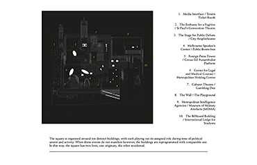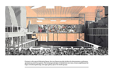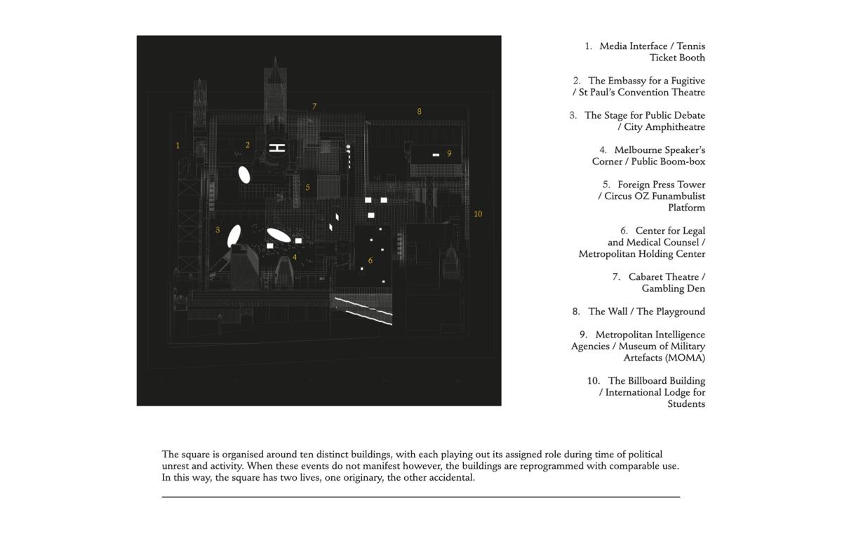 Melbourne is a decidedly peaceful city. This project addresses the lack of a true public square as opportunistic rather than antagonistic. A new square, imagined as a city within a city, with provision for protest, debate, demonstration, spectacle is the single most exemplary act of architectural diplomacy. The square for spectacle is also a theatre for the city where buildings are scripted as characters to play out their respective roles.