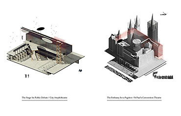 Steel Veils, Stone Islands and Gold Corrals Part 2 Project 2014 Mikhail Rodrick University of Melbourne | Australia "Steel Veils, Stone Islands and Gold Corrals is a reactionary project to the absence of a true public square in the City of Melbourne, Australia. The strategy for proposing a new square adopts the notion of the architecture of the city as inherently political, and as a composition of several parts suspended somewhere between imagined scenarios and physical reality. The new Square is intended to operate simultaneously as cultural artefact, political exercise and a speculative place of social and ideological transfer. As an archipelago of ten laboratories, the project takes cue from the recent observable reprogramming of the city square, first during the Occupy movement, and subsequently the Arab Spring. The architecture of the Square draws from a syntax of territorial lines, their physical manifestation as borders, walls and the political archipelago as a product of this process. The Public square in Melbourne has a peculiar history. in 1837, the city was drawn without one, the Governor at the time convinced that they encouraged undesirable democracy. Over the last two decades, a nominal city square was first halved in size due to lack of activity, and then subsequently turned into a hotel forecourt. Today, Melbourne's only public square is a privatised space that must be leased in order to be used for civic use. It possesses none of the historical, ideological or political significance that belong to any of the better known squares worldwide. Melbourne is a decidedly peaceful city. This project addresses the lack of a true public square as opportunistic rather than antagonistic. A new square, imagined as a city within a city, with provision for protest, debate, demonstration, spectacle is the single most exemplary act of architectural diplomacy. The square for spectacle is also a theatre for the city where buildings are scripted as characters to play out their respective roles. This project is intentionally ambiguous in its visual representation of activity within the square, acknowledging that there is in fact very little that separates party from protest, confetti from smoke particles." Tutor(s) Alex Selenitsch