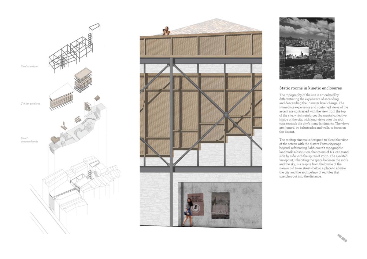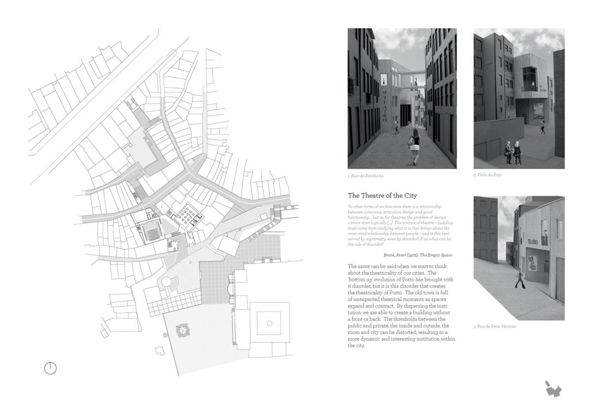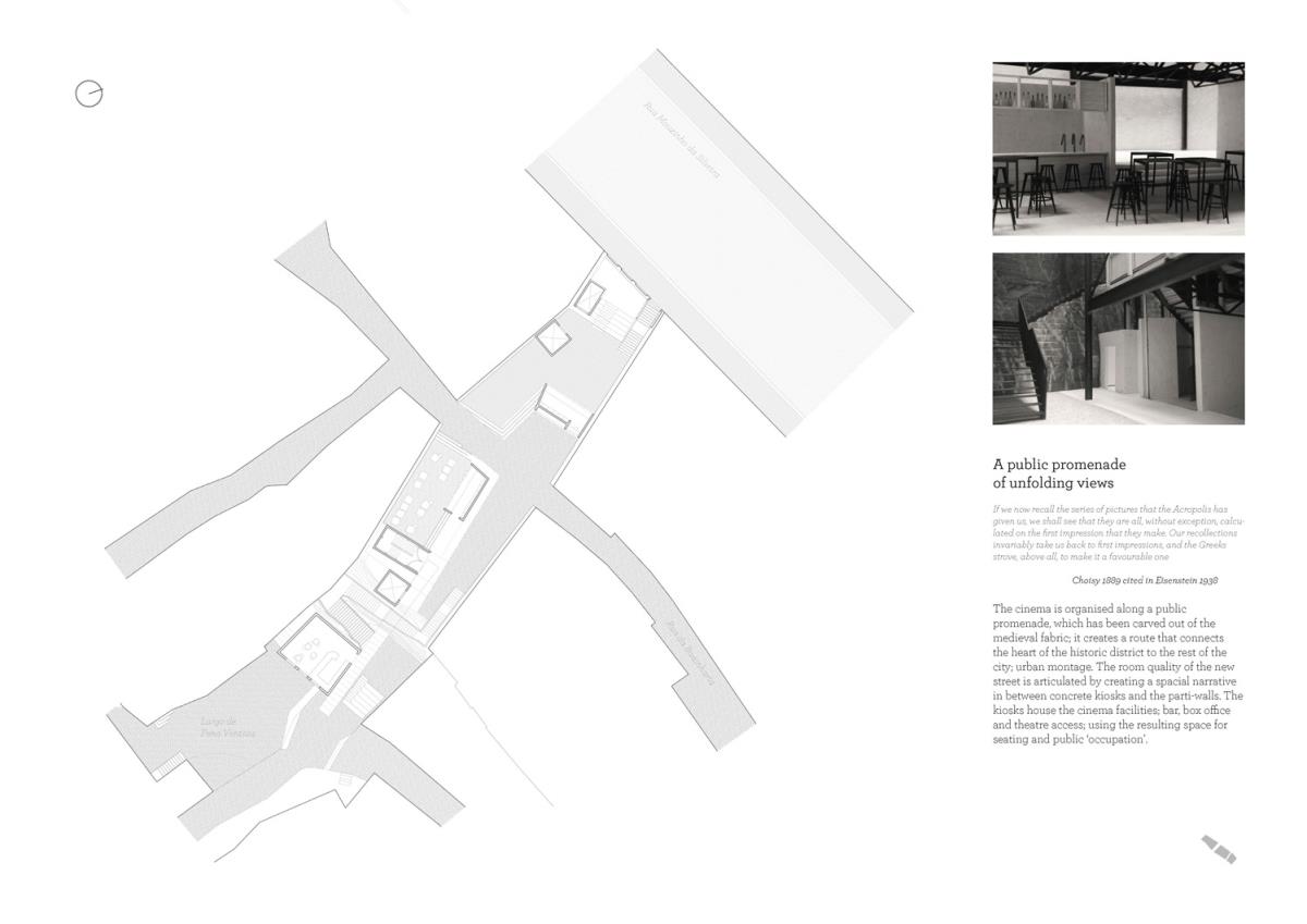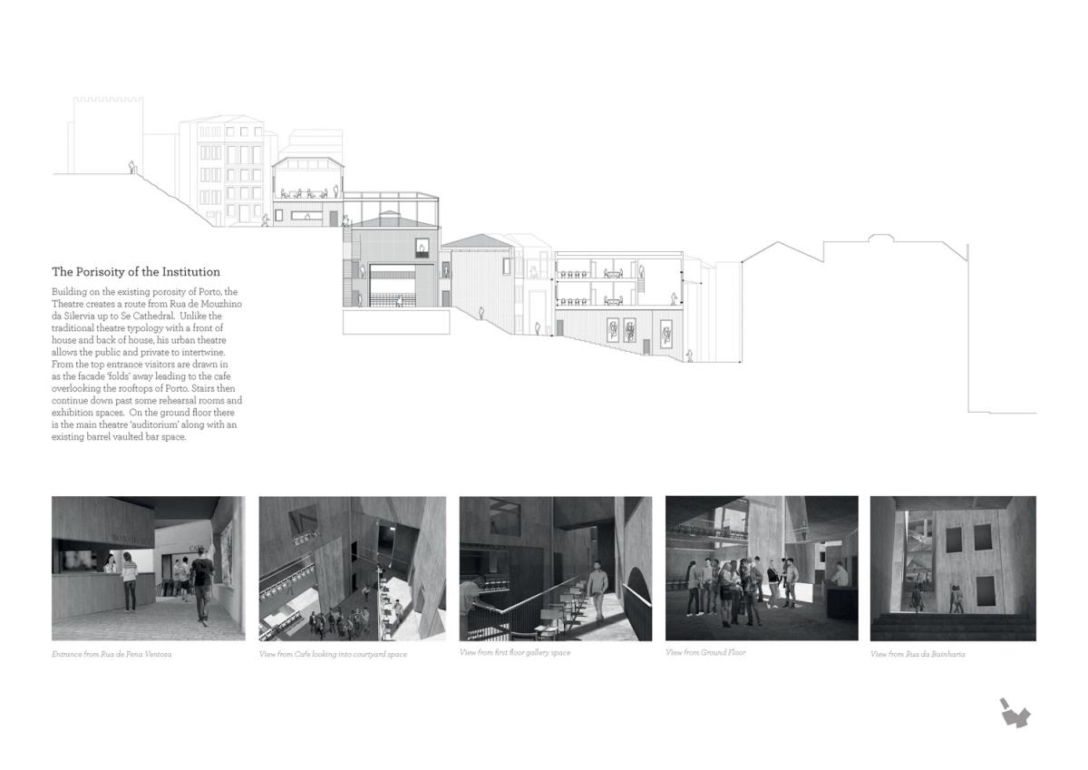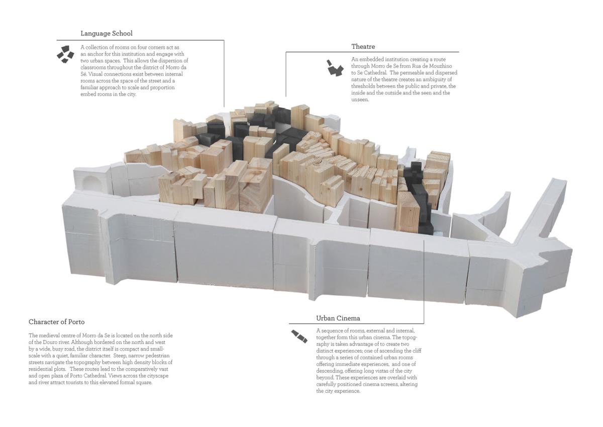 Rooms + Cities: a strategy for dispersed institutions in Porto’s historic centre Part 2 Project 2014 Artom TsapkovLouise PattersonHannah Beatty University of Dundee | UK The extraordinary natural and constructed topography of Porto is the context for this investigation into the relationship between room and city. The projects began with a discussion around the theme of ‘place of exchange’ or ‘place of representation’ and an exploration of the oppositions of inside and outside, public and private, small and large, intimate and distant. Working with models and drawings, a dialogue was developed between the interior and the urban scale. This process was essential to understand the complexity of Porto sites with respect to geometry and topography. The three proposals are intellectually interwoven; yet examine different briefs – cinema, theatre and language school. Together they form an urban strategy which tests the concept of threshold, façade and room. The projects are located in the district of Morro da Sé in the Medieval heart of Porto. The urban strategy was to embed public rooms physically and culturally within this residential context. Much of the fabric is derelict and in disrepair - the current practice is to either retain the facades or to knock the ruin down and rebuild a concrete replica. Our approach was to maintain the heterogeneous nature of Morro da Sé by introducing dispersed public institutions that responded to the particular character of place and created new informal public spaces. It is a conscious decision not to resist Porto's topography and geometry but to work with it and integrate into it. Informed by the existing typology, our urban proposals reflect the scale and proportions of the area to create a sense of familiarity between old and new. A series of urban rooms connect to create new routes and increase the cities permeability. Tutor(s) Lorens Holm Helen O'Connor