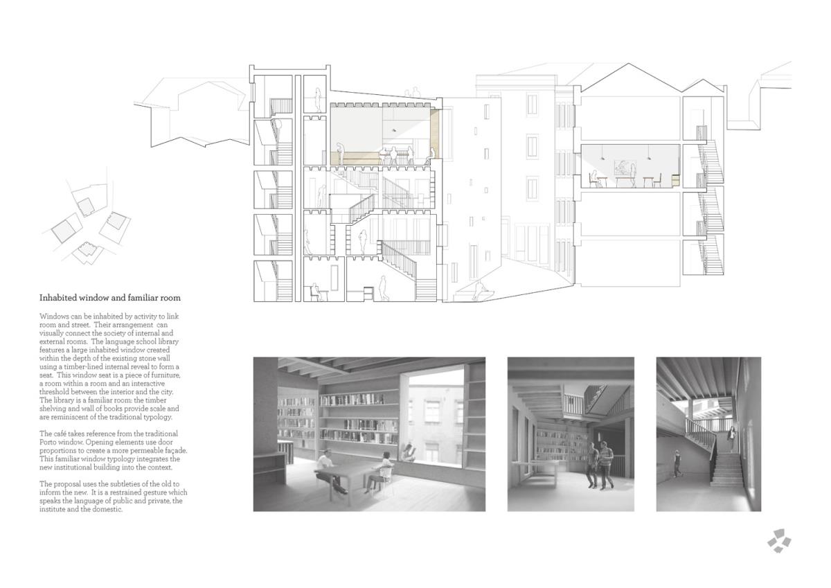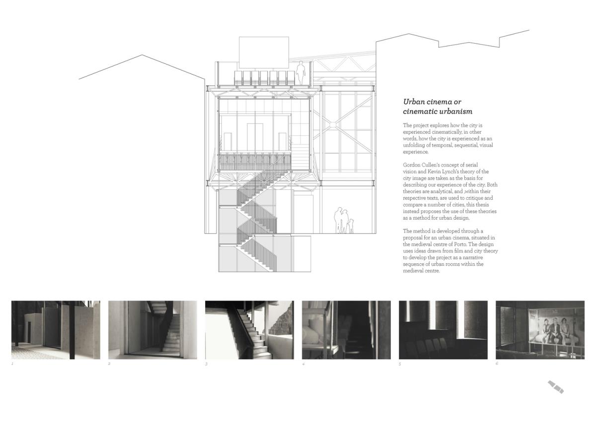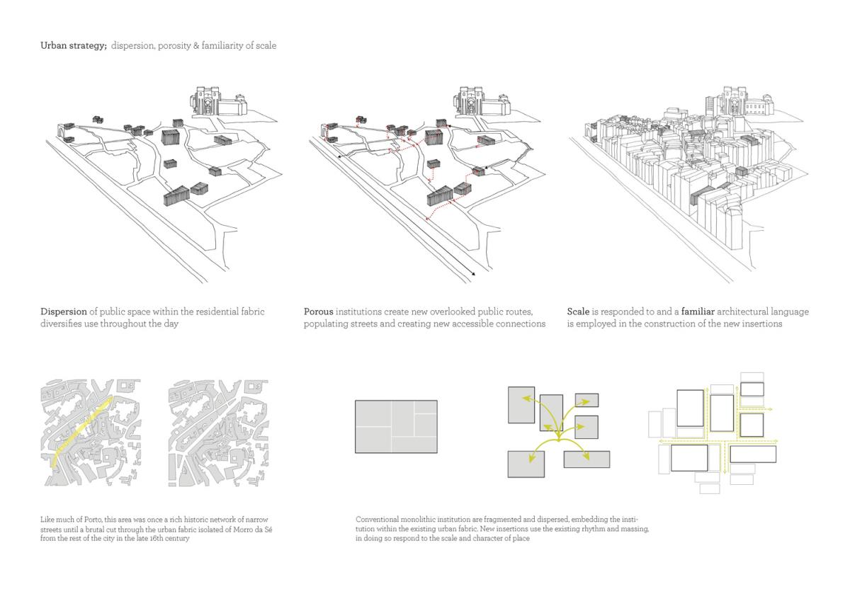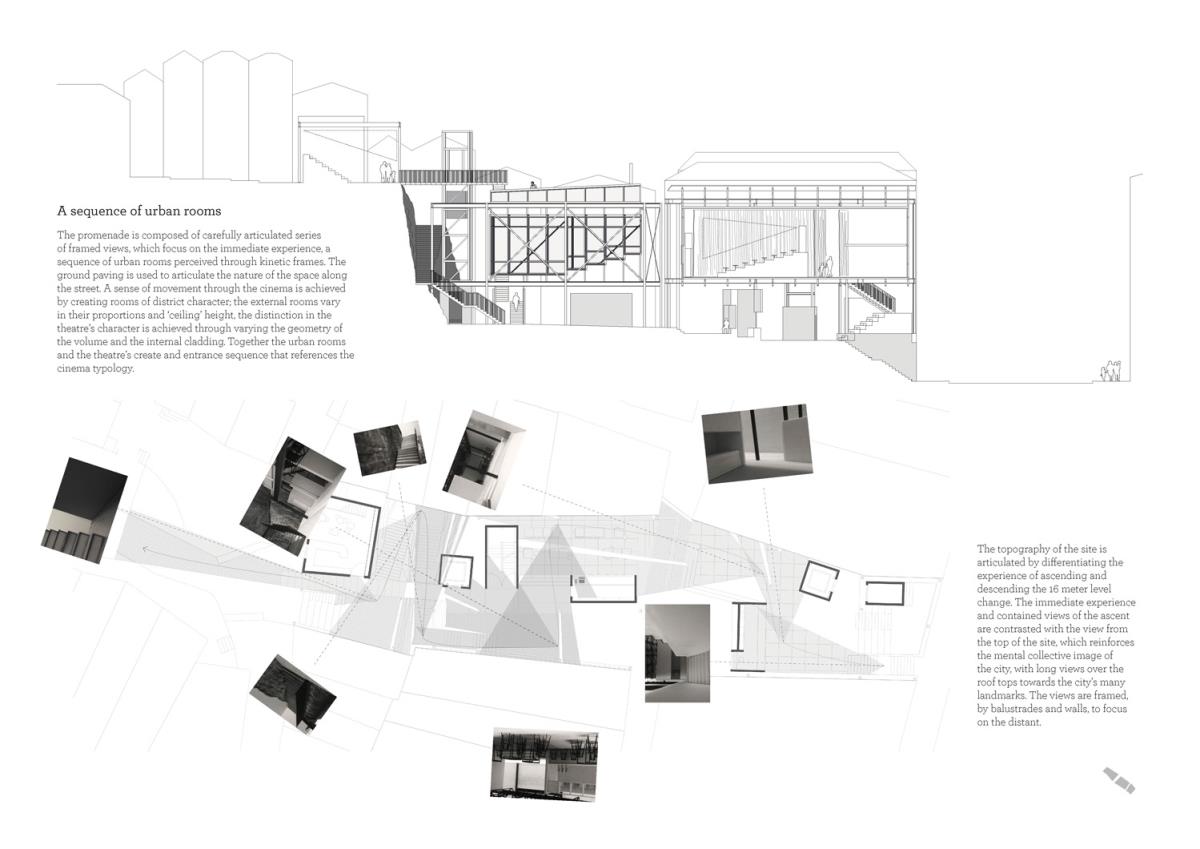 Rooms + Cities: a strategy for dispersed institutions in Porto’s historic centre Part 2 Project 2014 Artom TsapkovLouise PattersonHannah Beatty University of Dundee | UK The extraordinary natural and constructed topography of Porto is the context for this investigation into the relationship between room and city. The projects began with a discussion around the theme of ‘place of exchange’ or ‘place of representation’ and an exploration of the oppositions of inside and outside, public and private, small and large, intimate and distant. Working with models and drawings, a dialogue was developed between the interior and the urban scale. This process was essential to understand the complexity of Porto sites with respect to geometry and topography. The three proposals are intellectually interwoven; yet examine different briefs – cinema, theatre and language school. Together they form an urban strategy which tests the concept of threshold, façade and room. The projects are located in the district of Morro da Sé in the Medieval heart of Porto. The urban strategy was to embed public rooms physically and culturally within this residential context. Much of the fabric is derelict and in disrepair - the current practice is to either retain the facades or to knock the ruin down and rebuild a concrete replica. Our approach was to maintain the heterogeneous nature of Morro da Sé by introducing dispersed public institutions that responded to the particular character of place and created new informal public spaces. It is a conscious decision not to resist Porto's topography and geometry but to work with it and integrate into it. Informed by the existing typology, our urban proposals reflect the scale and proportions of the area to create a sense of familiarity between old and new. A series of urban rooms connect to create new routes and increase the cities permeability. Tutor(s) Lorens Holm Helen O'Connor