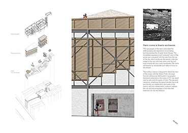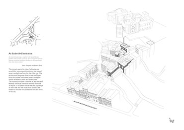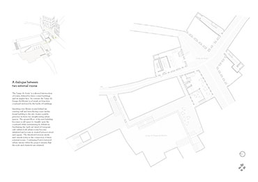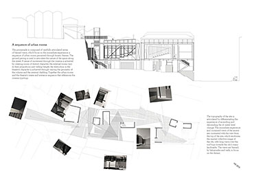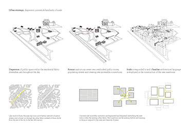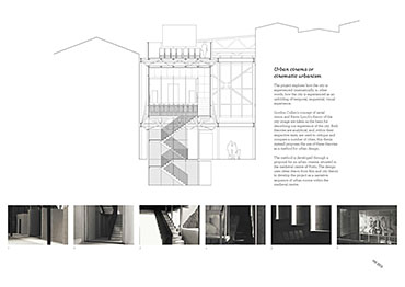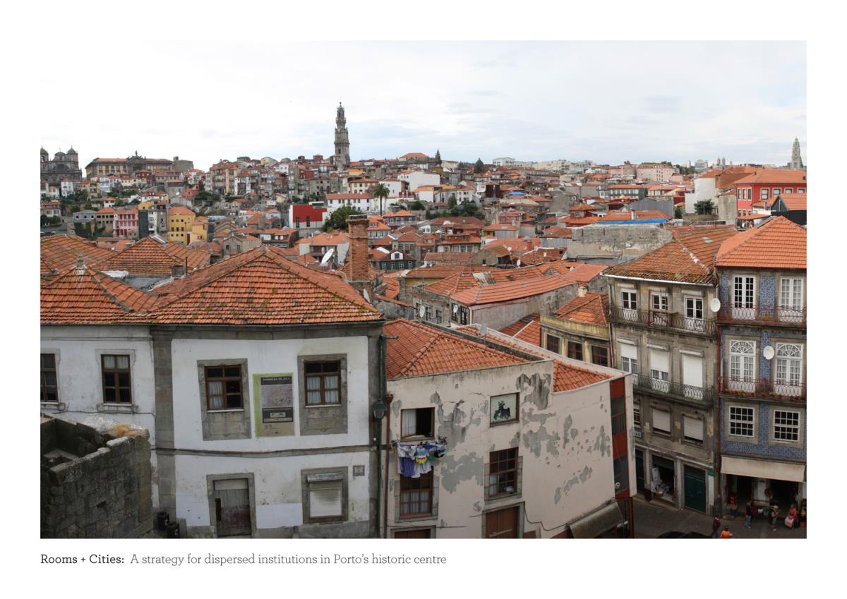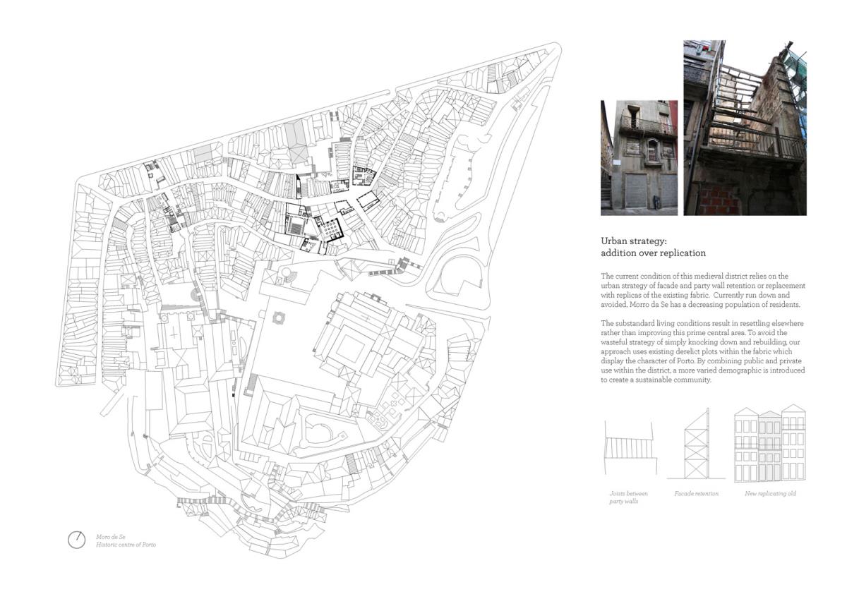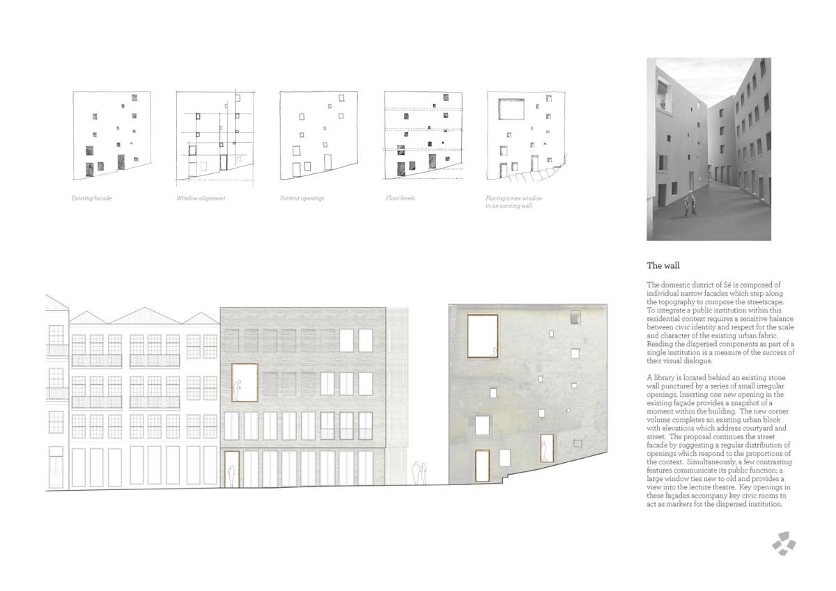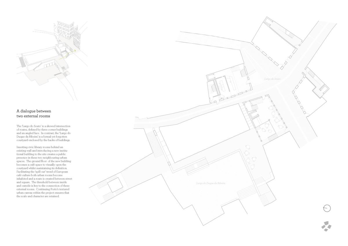 Rooms + Cities: a strategy for dispersed institutions in Porto’s historic centre Part 2 Project 2014 Artom TsapkovLouise PattersonHannah Beatty University of Dundee | UK The extraordinary natural and constructed topography of Porto is the context for this investigation into the relationship between room and city. The projects began with a discussion around the theme of ‘place of exchange’ or ‘place of representation’ and an exploration of the oppositions of inside and outside, public and private, small and large, intimate and distant. Working with models and drawings, a dialogue was developed between the interior and the urban scale. This process was essential to understand the complexity of Porto sites with respect to geometry and topography. The three proposals are intellectually interwoven; yet examine different briefs – cinema, theatre and language school. Together they form an urban strategy which tests the concept of threshold, façade and room. The projects are located in the district of Morro da Sé in the Medieval heart of Porto. The urban strategy was to embed public rooms physically and culturally within this residential context. Much of the fabric is derelict and in disrepair - the current practice is to either retain the facades or to knock the ruin down and rebuild a concrete replica. Our approach was to maintain the heterogeneous nature of Morro da Sé by introducing dispersed public institutions that responded to the particular character of place and created new informal public spaces. It is a conscious decision not to resist Porto's topography and geometry but to work with it and integrate into it. Informed by the existing typology, our urban proposals reflect the scale and proportions of the area to create a sense of familiarity between old and new. A series of urban rooms connect to create new routes and increase the cities permeability. Tutor(s) Lorens Holm Helen O'Connor