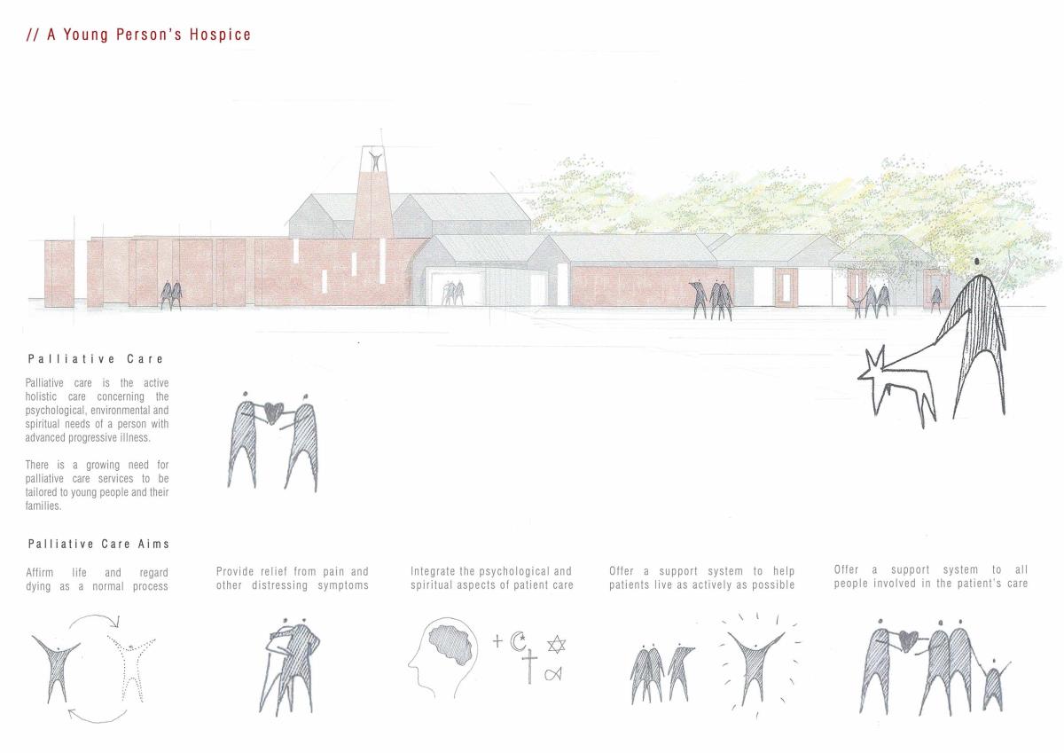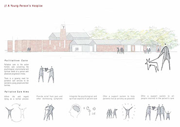 This project involves the design of a Young Adults Hospice, sited on the edge of Glasgow Green. A hospice is both a philosophy and type of care that concentrates on the palliation of a terminally ill patient's symptoms. The need for a dedicated facility concerning the transition from child to adult services is becoming increasingly prevalent.