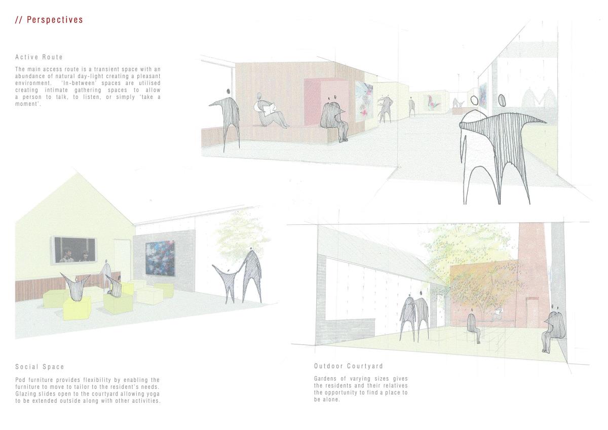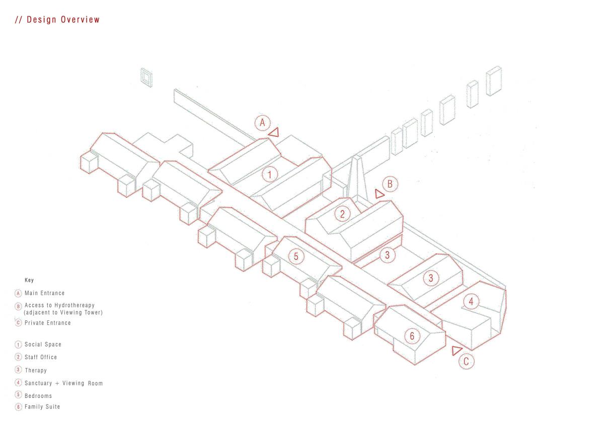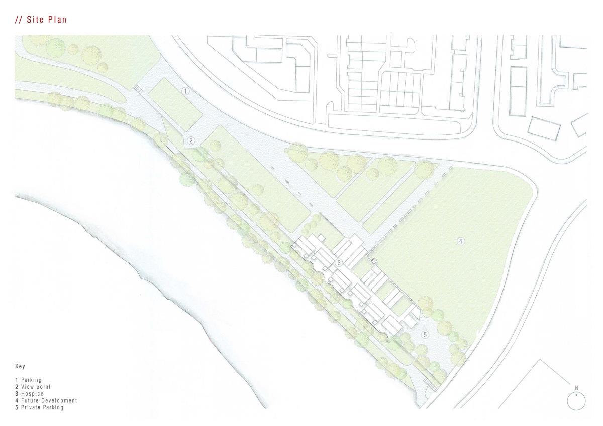 My hospice proposal comprises of a series of clusters providing either accommodation, administrative or therapeutical facilities. Courtyards punctuate the hospice, flooding natural light inside creating constant connections with the outdoors, reducing the feeling of isolation. Dividing the schedule of accommodation into smaller units reduces the impact of the massing, eradicating an institutional feel and instead creates a domestic quality welcoming people inside.