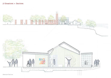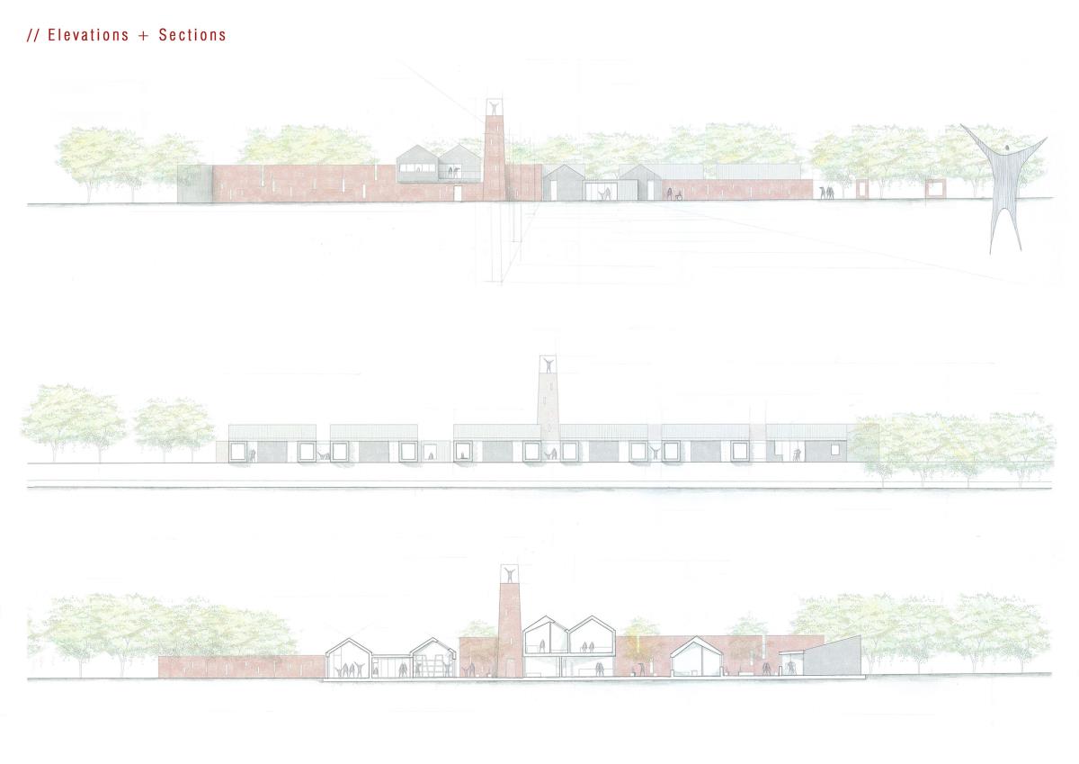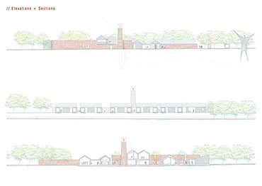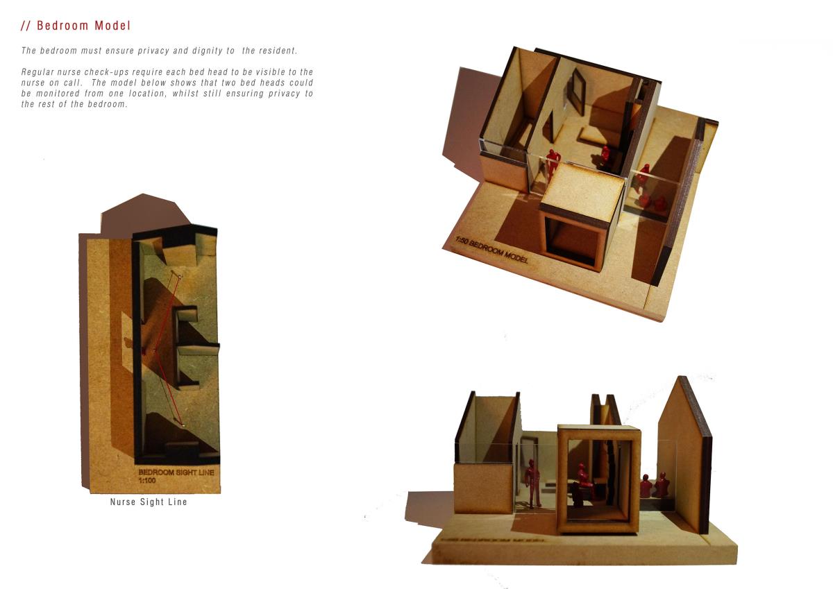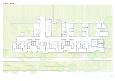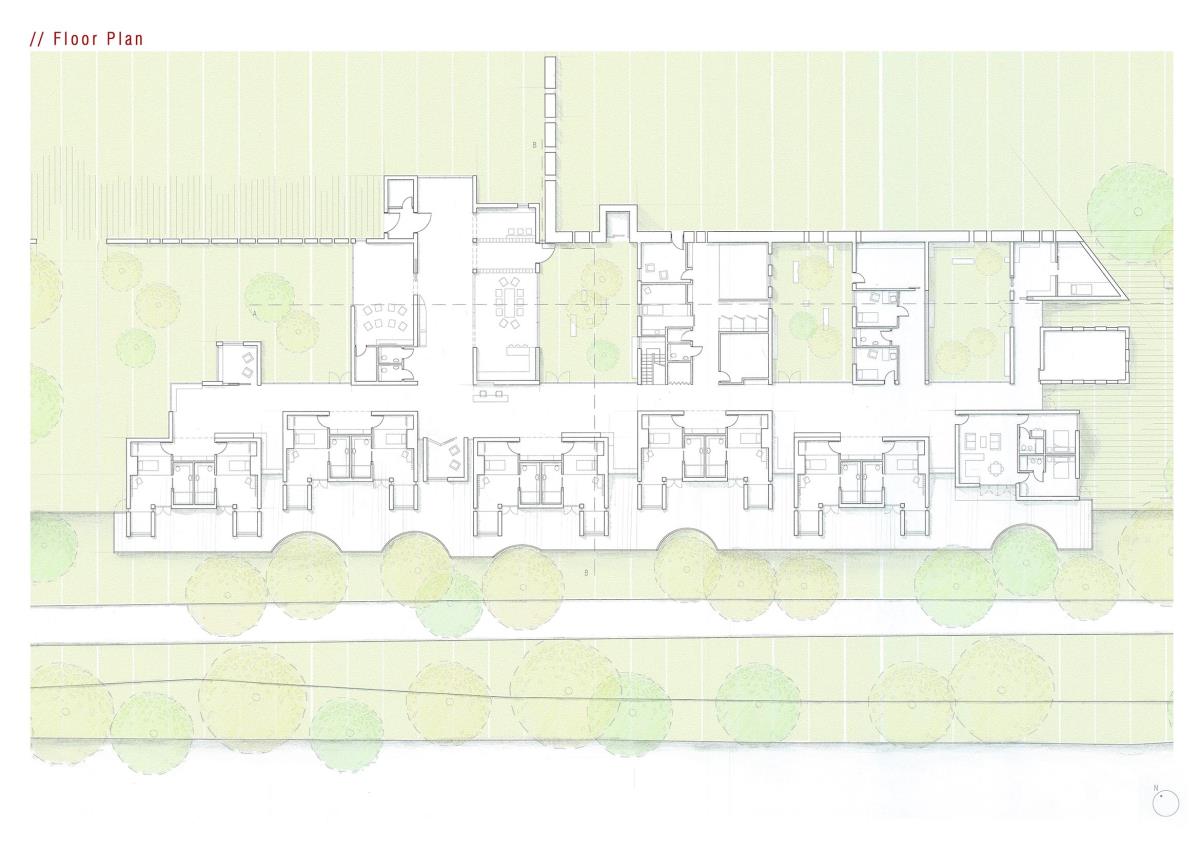 My hospice proposal comprises of a series of clusters providing either accommodation, administrative or therapeutical facilities. Courtyards punctuate the hospice, flooding natural light inside creating constant connections with the outdoors, reducing the feeling of isolation. Dividing the schedule of accommodation into smaller units reduces the impact of the massing, eradicating an institutional feel and instead creates a domestic quality welcoming people inside.