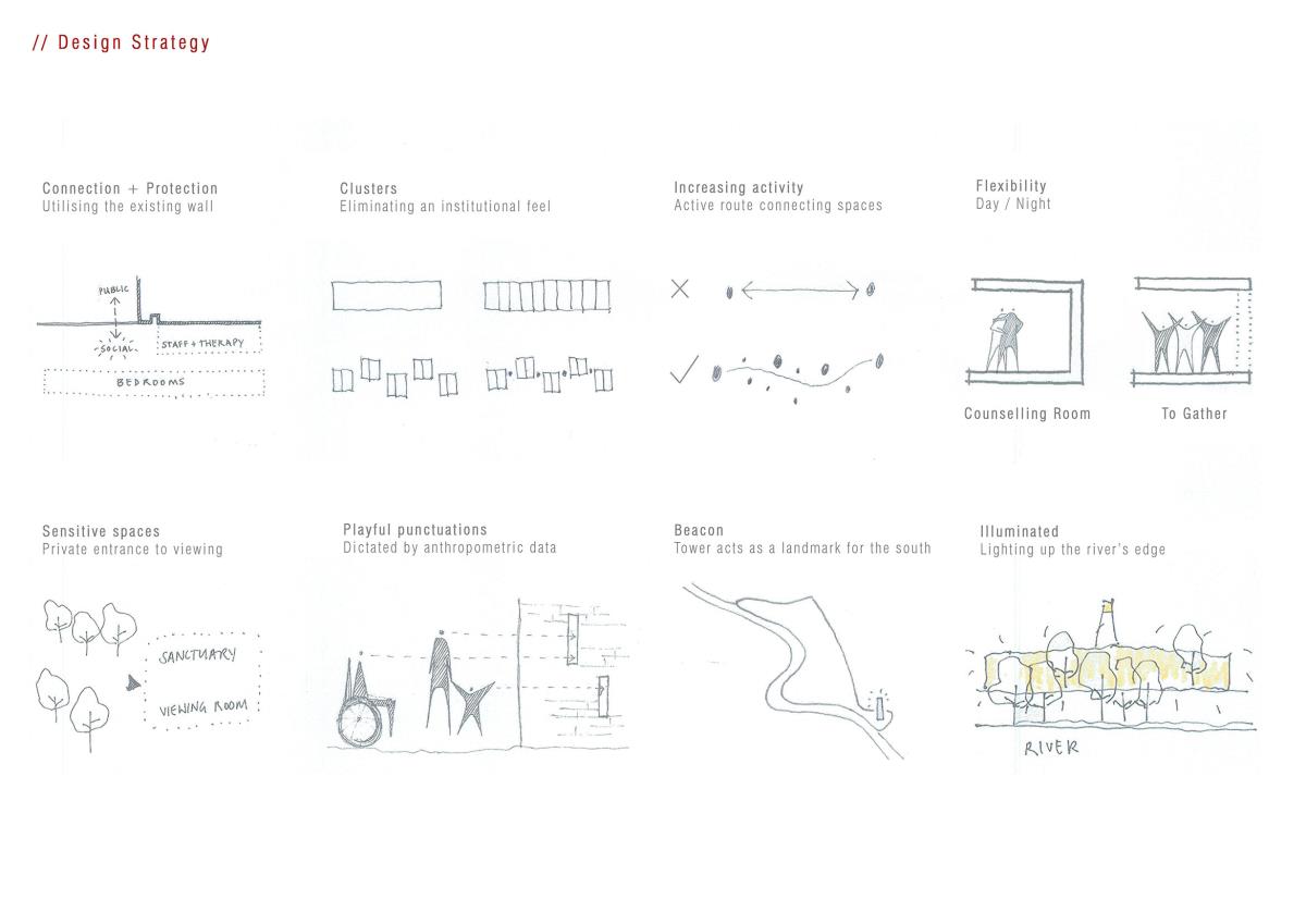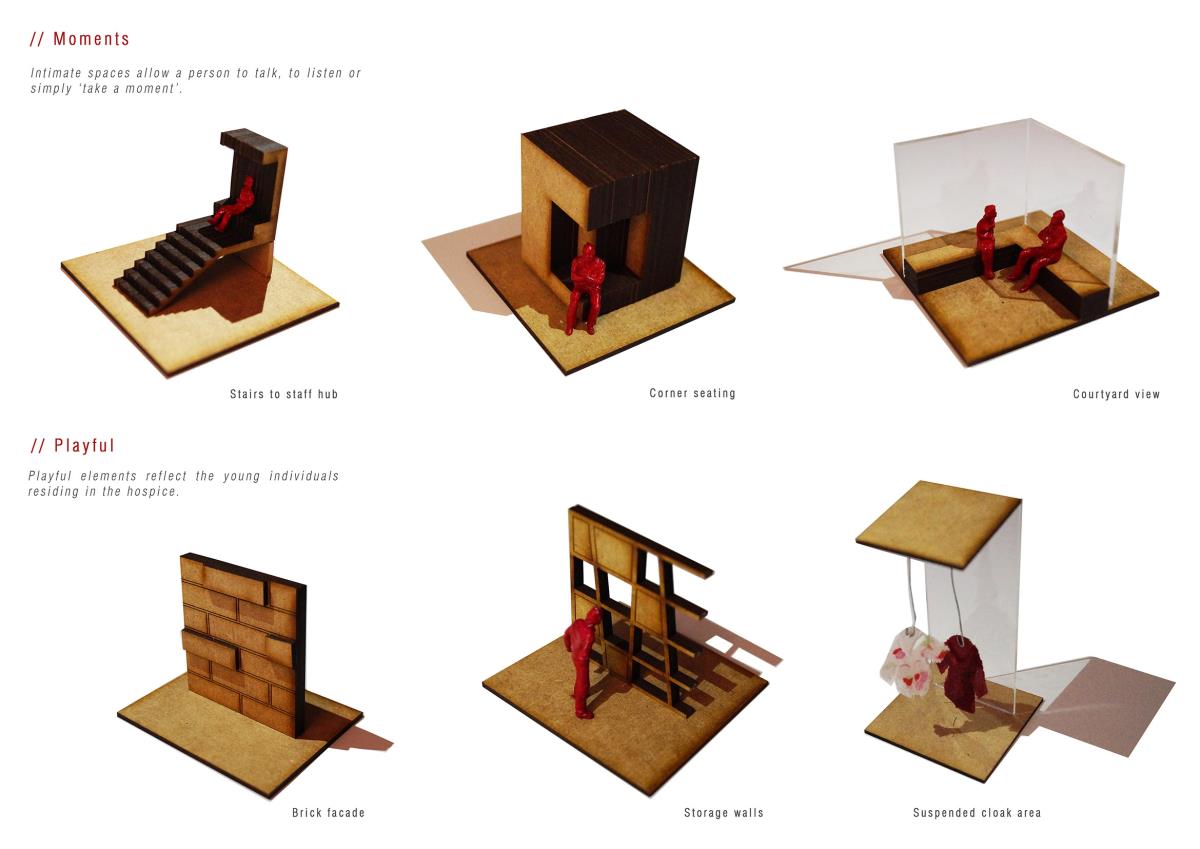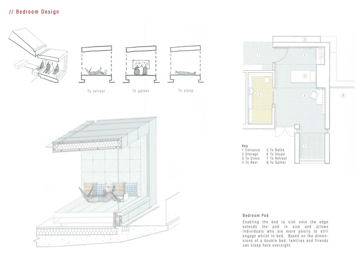 The sequence of arrival is particularly important, it is inviting and methodically organised for ease of movement around the hospice. I believed it was important to design a building which reflected the young individuals residing in the hospice to give a sense of identity to their place. Playful elements are subtly implemented throughout the design, from a suspended cloakroom area where coats appear to ‘float’ upon entry, to playful furnishings adding uplifting splashes of colour. Designing an environment which makes friends, families and the person themselves feel at home is crucial, more importantly, it allows the person to be seen as an individual not as a patient.