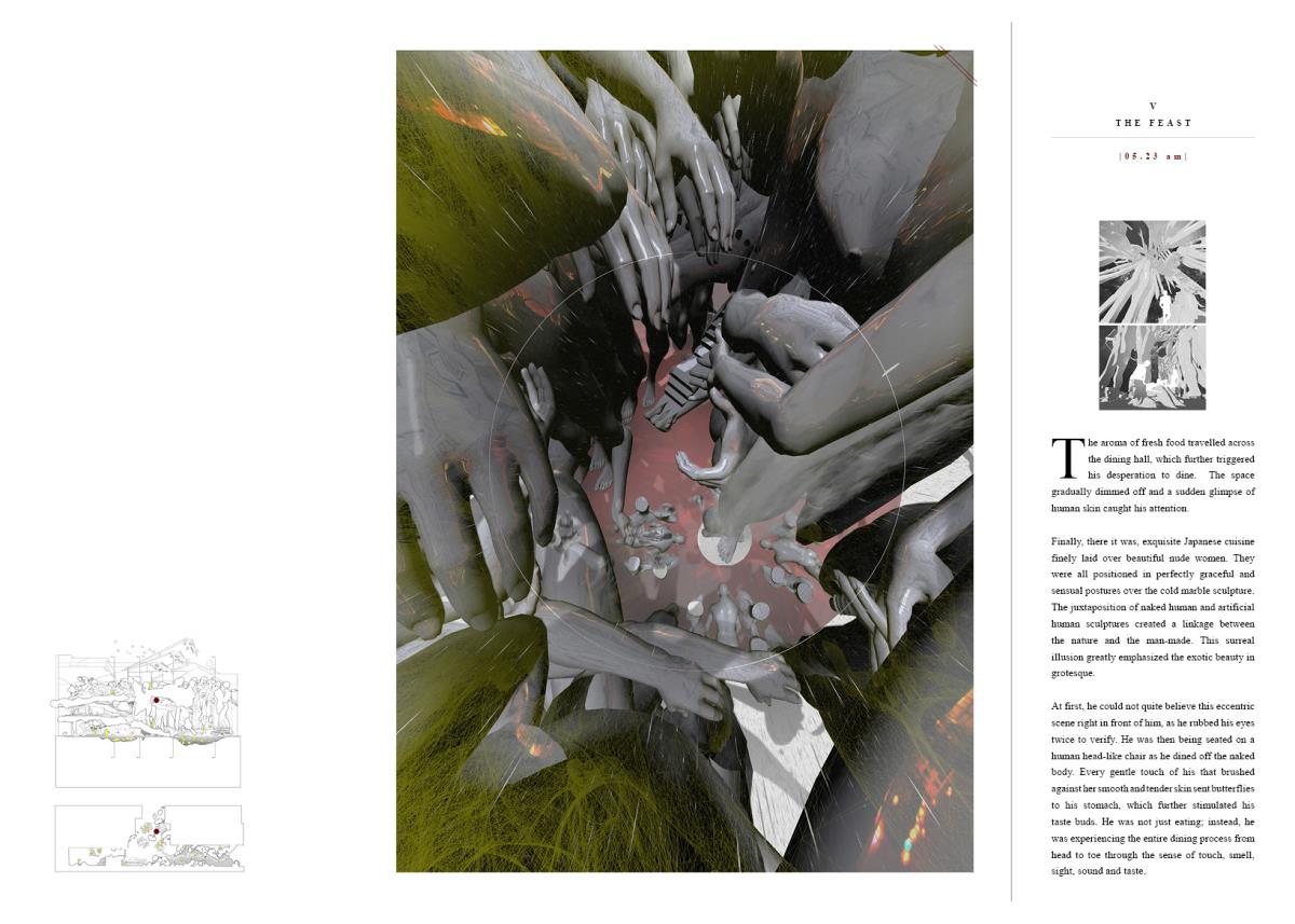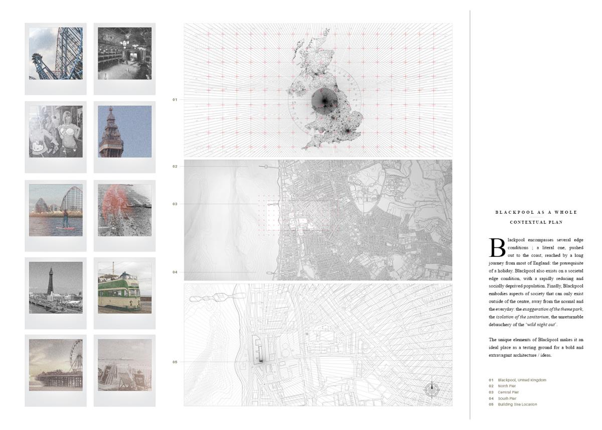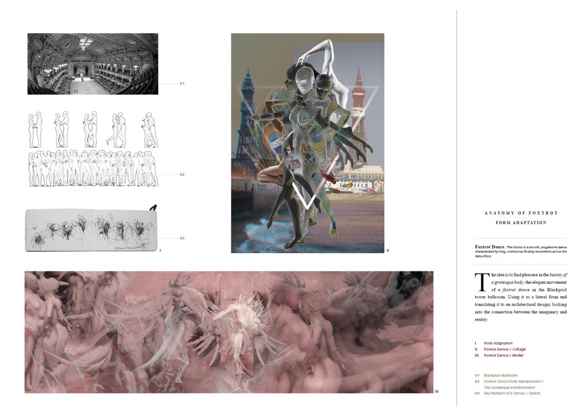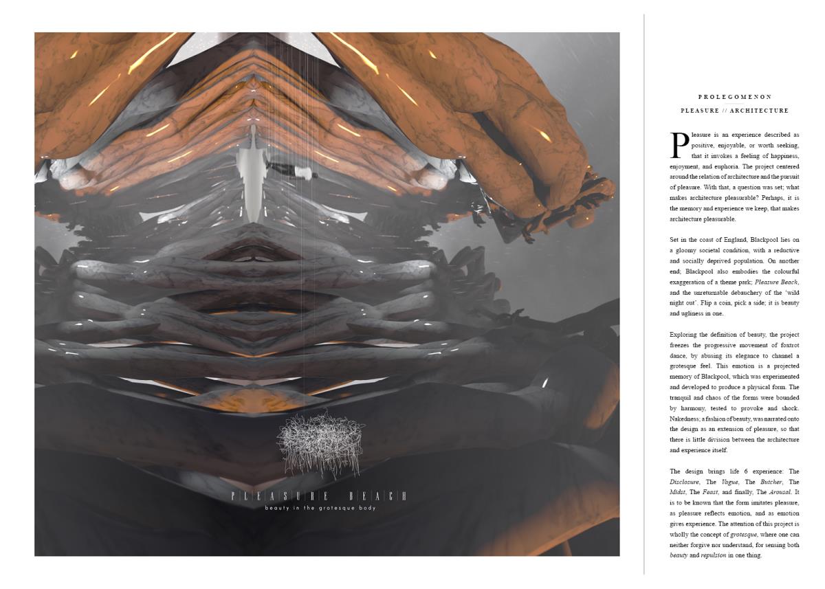 Pleasure Beach / Beauty in Grotesque Part 1 Project 2014 Chong Yan Chuah Newcastle University | UK Pleasure is an experience described as positive, enjoyable, or worth seeking. It invokes a feeling of happiness, enjoyment, and euphoria. This project centres on the relation of architecture and the pursuit of pleasure. With that, a question was set; what makes architecture pleasurable? Perhaps, it is in the memory and experiences we keep. Set in the coast of England, Blackpool lies on a gloomy societal condition, with a reductive and socially deprived population. On another end; Blackpool also embodies the colourful exaggeration of a theme park through its Pleasure Beach, and the unreturnable debauchery of the ‘wild night out’. Flip a coin, pick a side; it is beauty and ugliness in one environment. Exploring the definition of beauty, the project freezes the progressive movement of the foxtrot dance as witnessed in the Blackpool Tower Ballroom, by manipulating its elegance to evoke the grotesque. This emotion is a projected memory of Blackpool, which was experimented and developed upon to produce a physical form. The tranquillity and chaos of the forms were bounded by harmony, tested to provoke and shock. Nakedness; a fashion of beauty, was narrated into the design as an extension of pleasure, so that there is little division between the architecture and the experience itself. The design brings life 6 experiences: The Disclosure, The Vague, The Butcher, The Midst, The Feast, and finally, The Arousal. It is to be known that the form imitates pleasure, as pleasure reflects emotion, and emotion gives experience. The attention of this project is centred on the concept of beauty in the grotesque, where one can neither forgive nor understand the sensation of experiencing both beauty and repulsion all at once. Tutor(s) James Craig Matt Ozga-Lawn