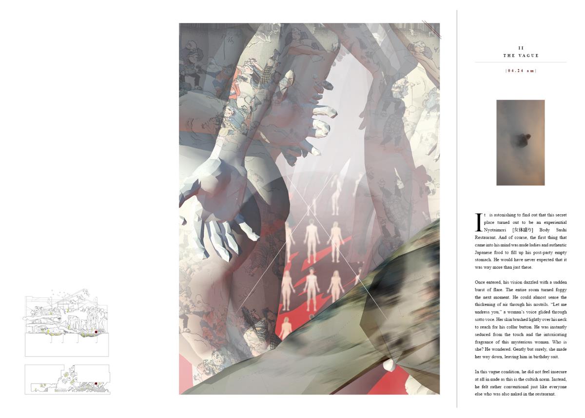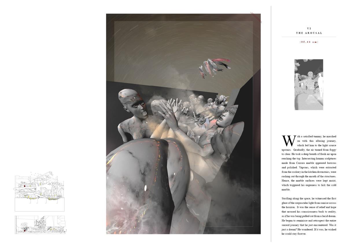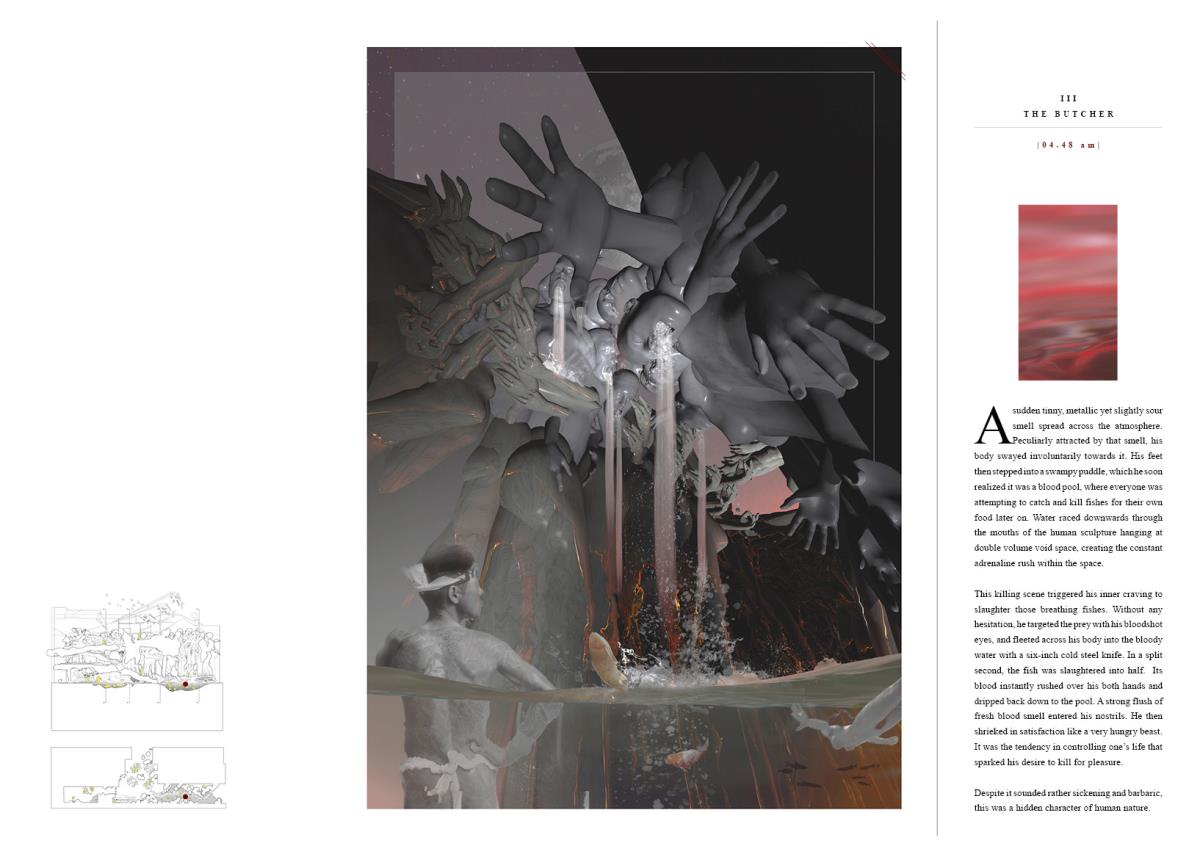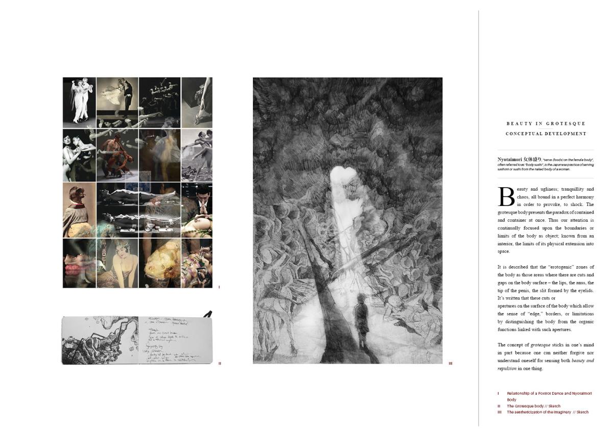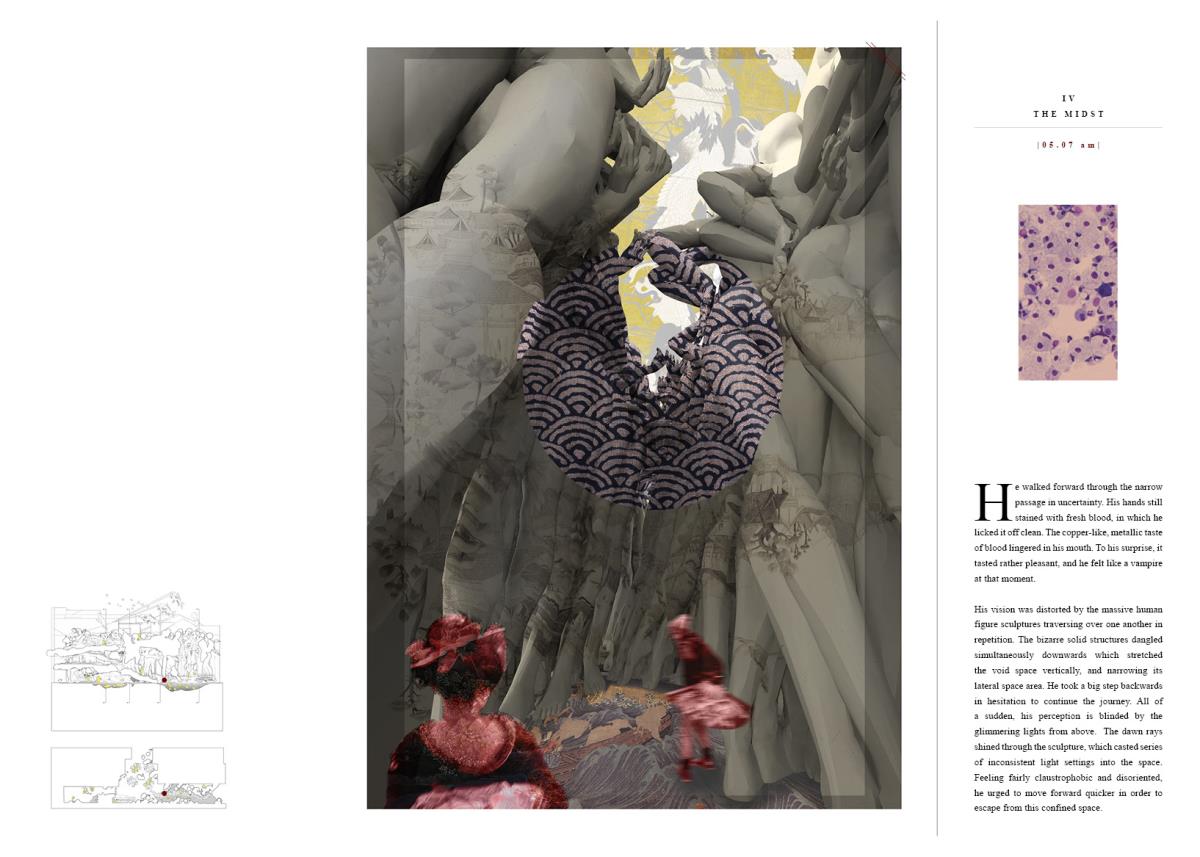 Pleasure Beach / Beauty in Grotesque Part 1 Project 2014 Chong Yan Chuah Newcastle University | UK Pleasure is an experience described as positive, enjoyable, or worth seeking. It invokes a feeling of happiness, enjoyment, and euphoria. This project centres on the relation of architecture and the pursuit of pleasure. With that, a question was set; what makes architecture pleasurable? Perhaps, it is in the memory and experiences we keep. Set in the coast of England, Blackpool lies on a gloomy societal condition, with a reductive and socially deprived population. On another end; Blackpool also embodies the colourful exaggeration of a theme park through its Pleasure Beach, and the unreturnable debauchery of the ‘wild night out’. Flip a coin, pick a side; it is beauty and ugliness in one environment. Exploring the definition of beauty, the project freezes the progressive movement of the foxtrot dance as witnessed in the Blackpool Tower Ballroom, by manipulating its elegance to evoke the grotesque. This emotion is a projected memory of Blackpool, which was experimented and developed upon to produce a physical form. The tranquillity and chaos of the forms were bounded by harmony, tested to provoke and shock. Nakedness; a fashion of beauty, was narrated into the design as an extension of pleasure, so that there is little division between the architecture and the experience itself. The design brings life 6 experiences: The Disclosure, The Vague, The Butcher, The Midst, The Feast, and finally, The Arousal. It is to be known that the form imitates pleasure, as pleasure reflects emotion, and emotion gives experience. The attention of this project is centred on the concept of beauty in the grotesque, where one can neither forgive nor understand the sensation of experiencing both beauty and repulsion all at once. Tutor(s) James Craig Matt Ozga-Lawn