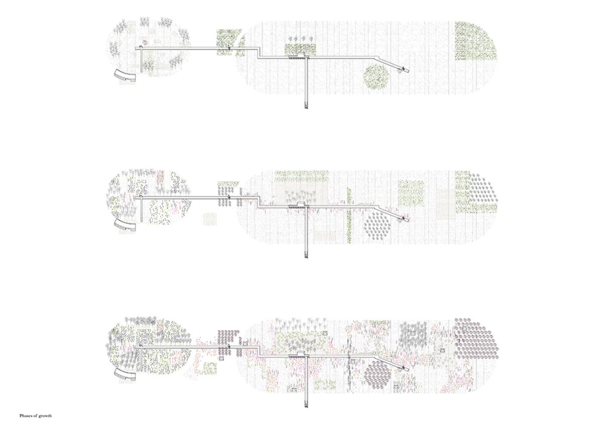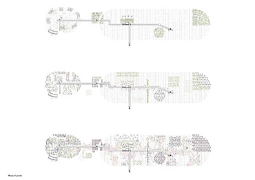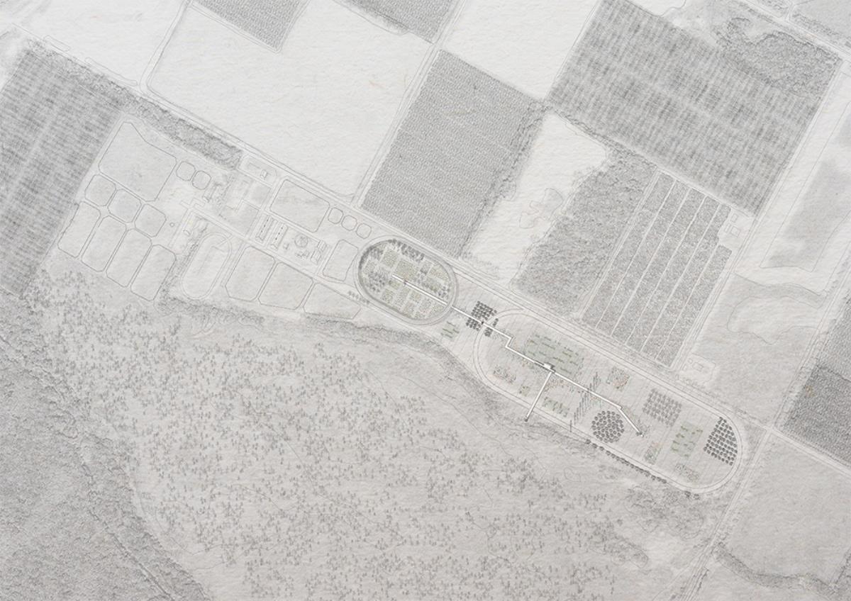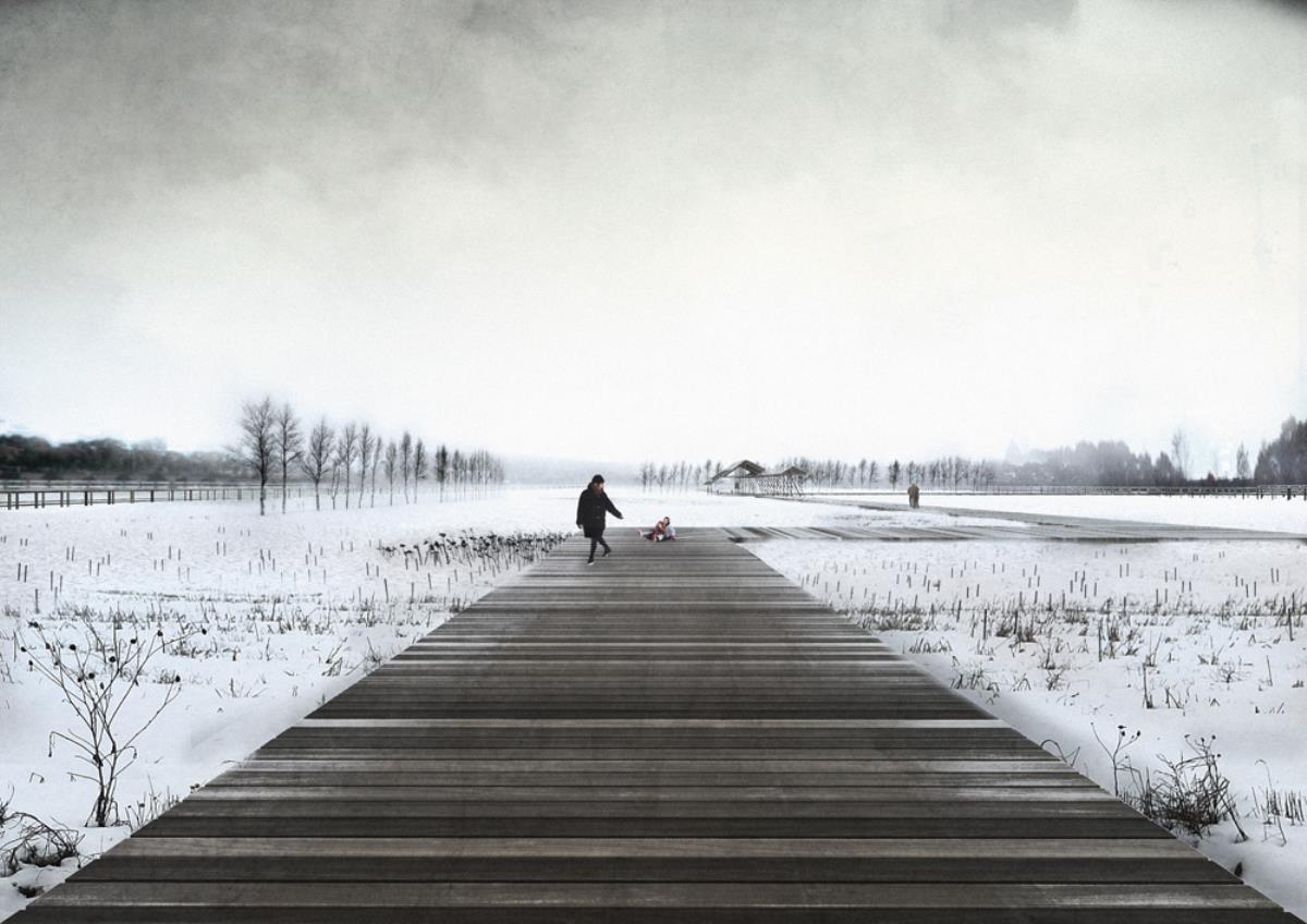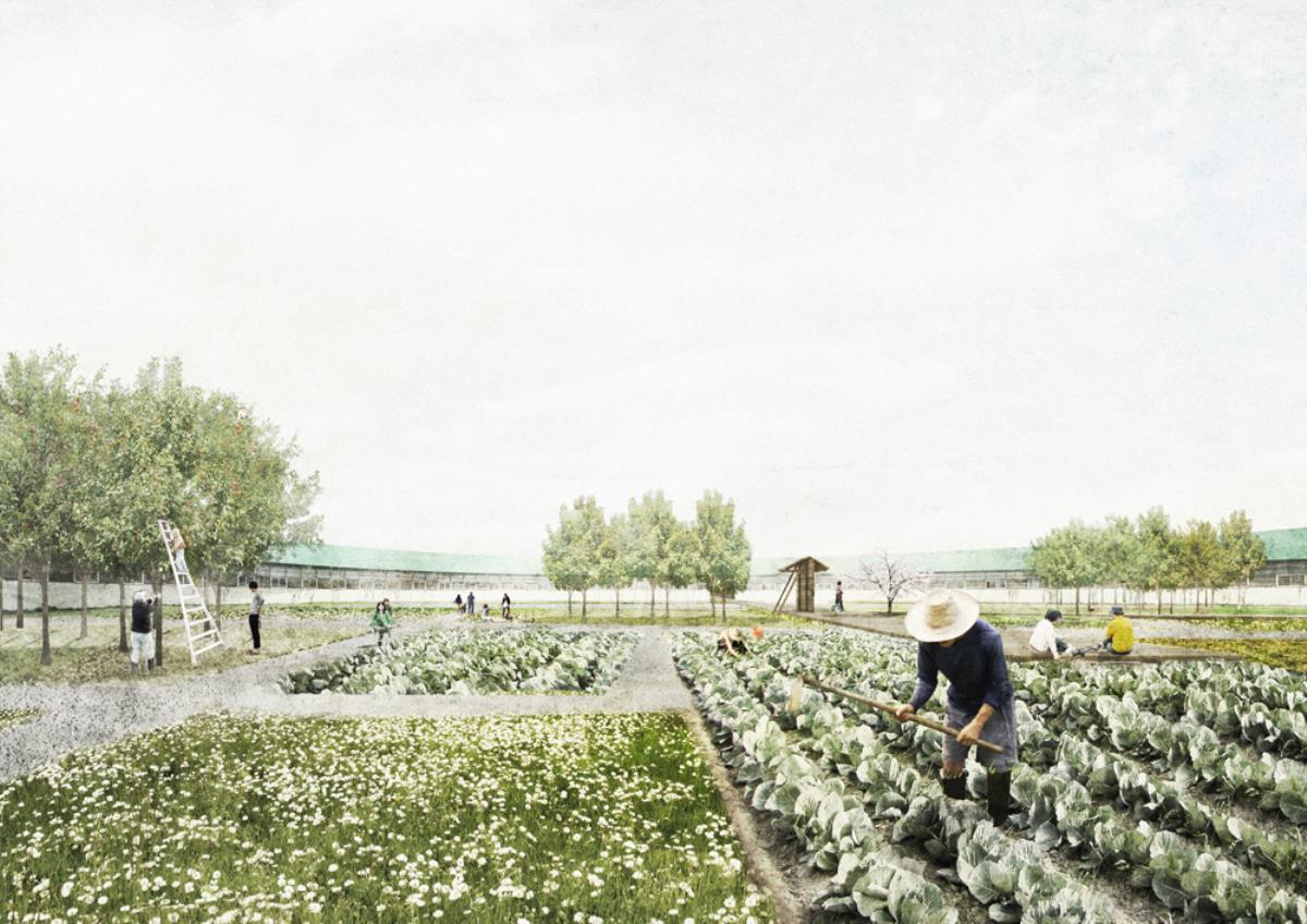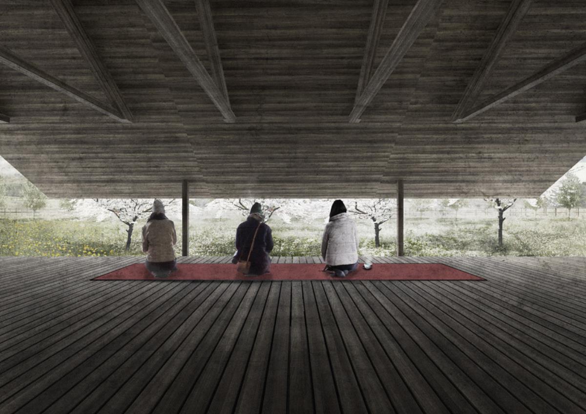 Our proposal is an architectural vision- how to develop the existing Memu Meadows farm on Taiki-cho, Hokkaido into a sustainable ‘productive garden’. We propose to create a ‘productive centre’, an orchard, within the existing indoor horse track, where scientists and visitors can grow vegetables, fruits and flowers. All future building should be concentrated to the west, allowing the eastern part to be kept as an open landscape, to be discovered and enjoyed by visitors during all seasons in all its richness.