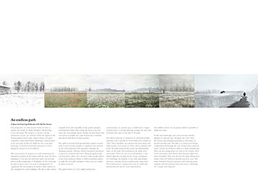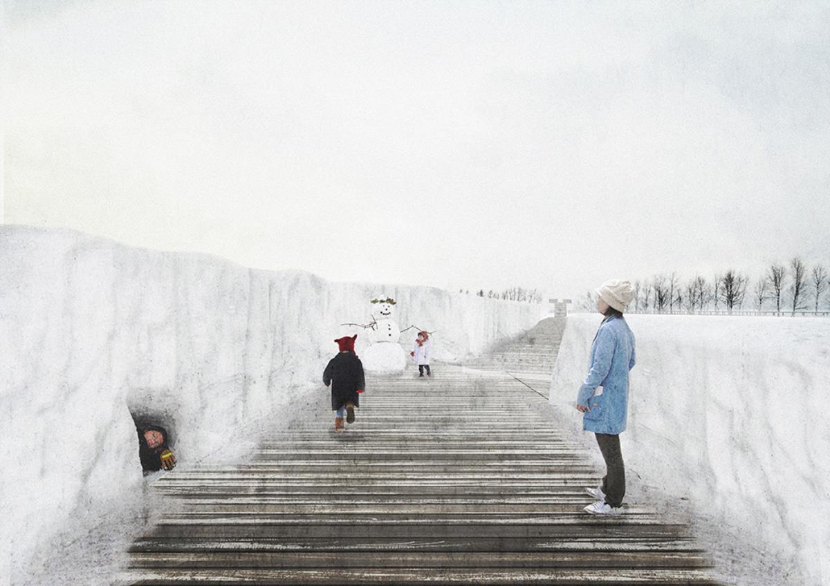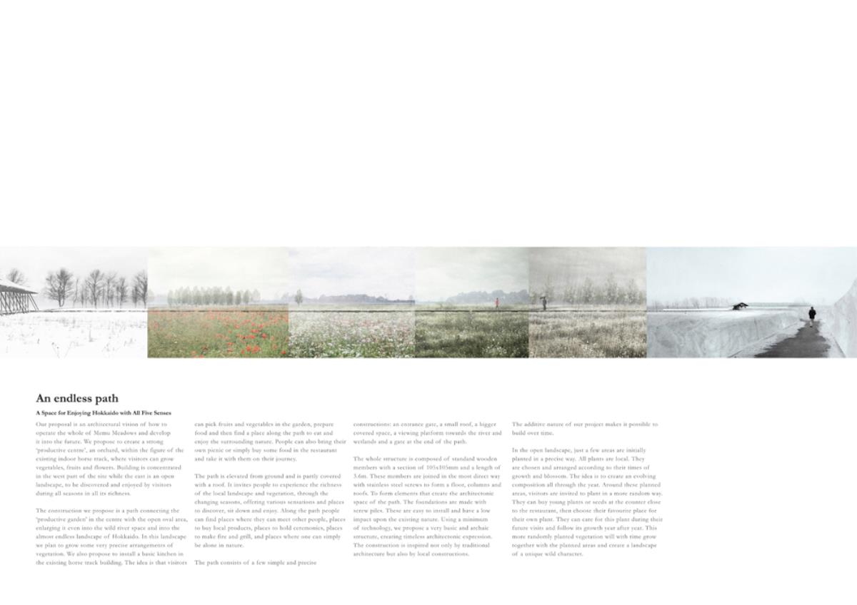The architecture we propose is A PATH, connecting the ‘productive garden’ in the centre with the open area of the outdoor track, enlarging it into the wild river space and almost ENDLESS landscape of Hokkaido. At some places, we plan to plant some specific arrangements of seasonal vegetation. Furthermore we propose to install a basic kitchen in the existing track building. The idea is that visitors can pick fruits and vegetables in the garden, prepare a meal in the kitchen and then find a place along the path to eat and enjoy the scenery.