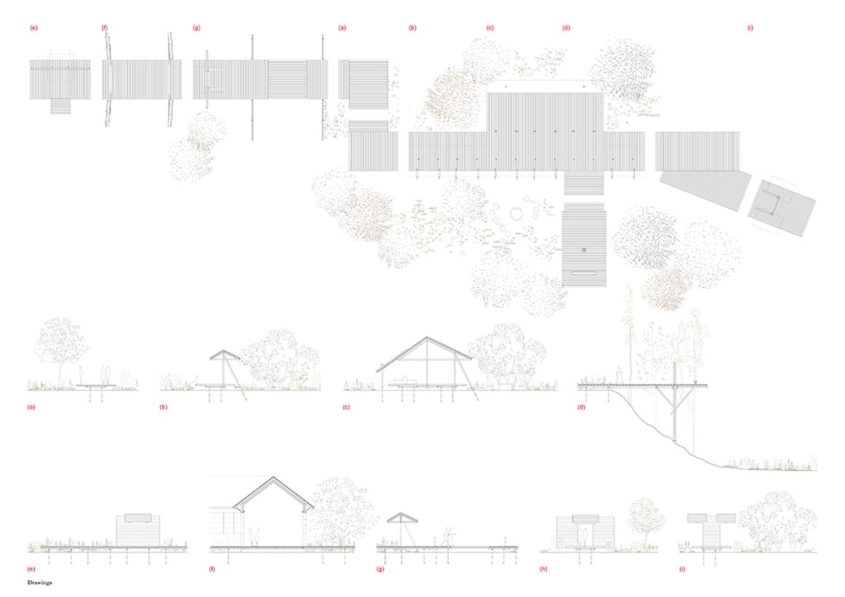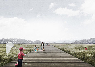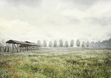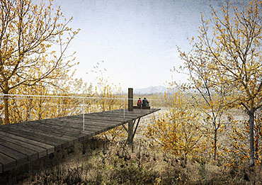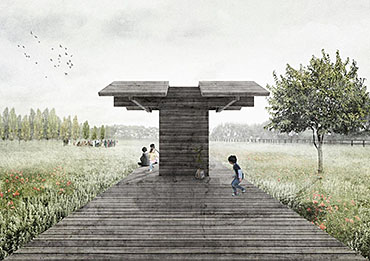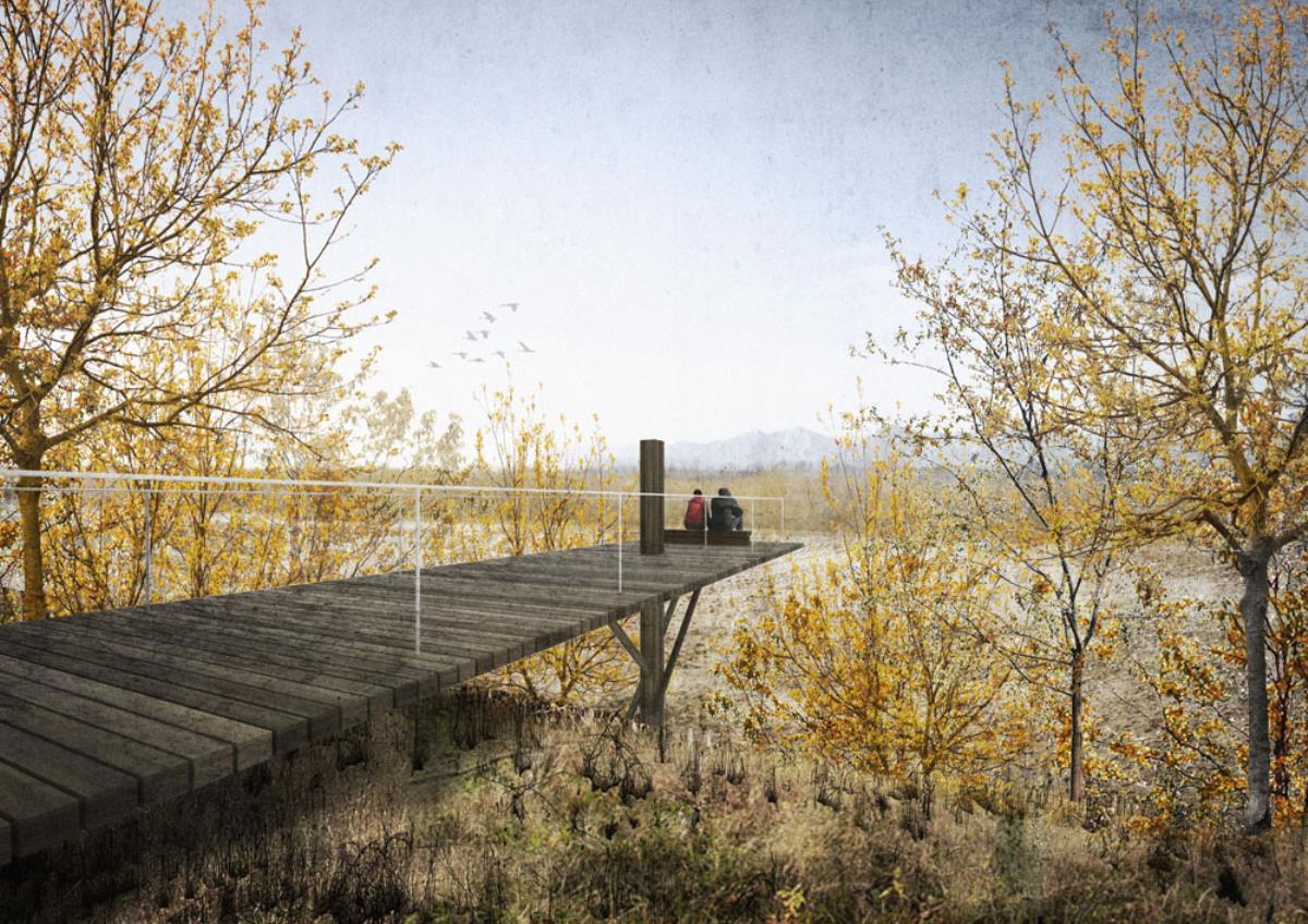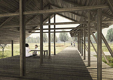 The path is detached from ground and partly covered with a roof. It invites people to experience the richness of the landscape with different sensations and places to discover, sit down and enjoy. It consists of a few simple, but precise constructions: an entrance screen, a gate into the open, a bigger covered space for contemplation, ceremonies and gatherings, a viewing platform into the river-wetlands and a gate at the end of the path.