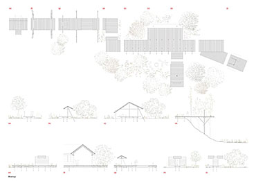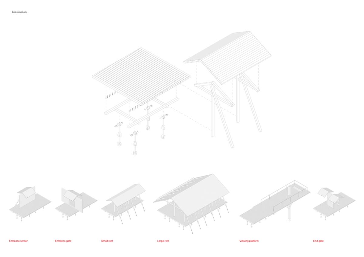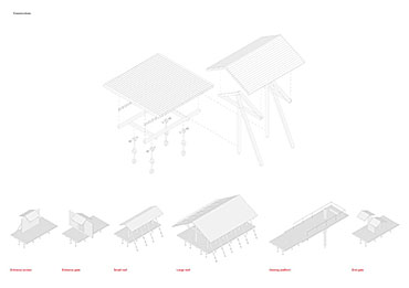 The construction is a very basic structure, using a minimum of technology, intended to create a kind of timeless expression inspired by traditional vernacular and rural architecture. It is composed of standard wooden members with a section of 105x105mm and a length of 3.60m, which are joined in the most direct way to form a floor, columns, roofs and- create space.
