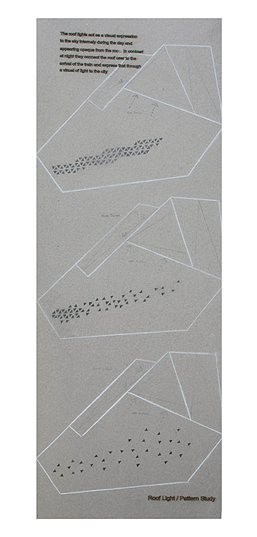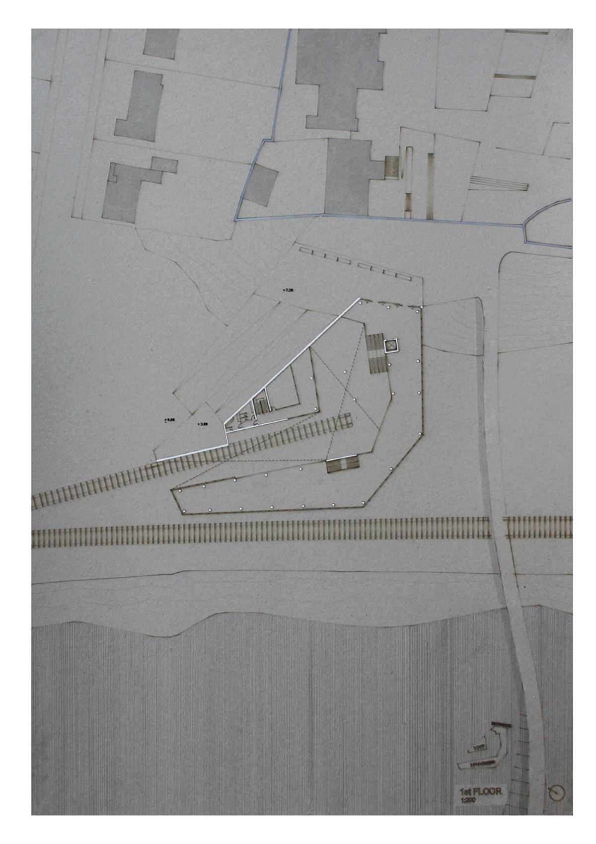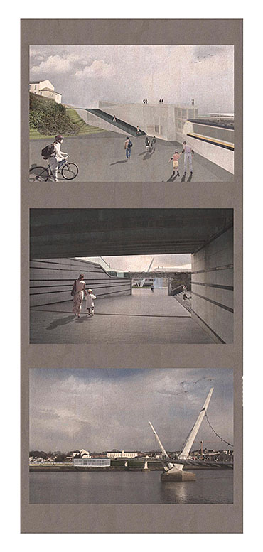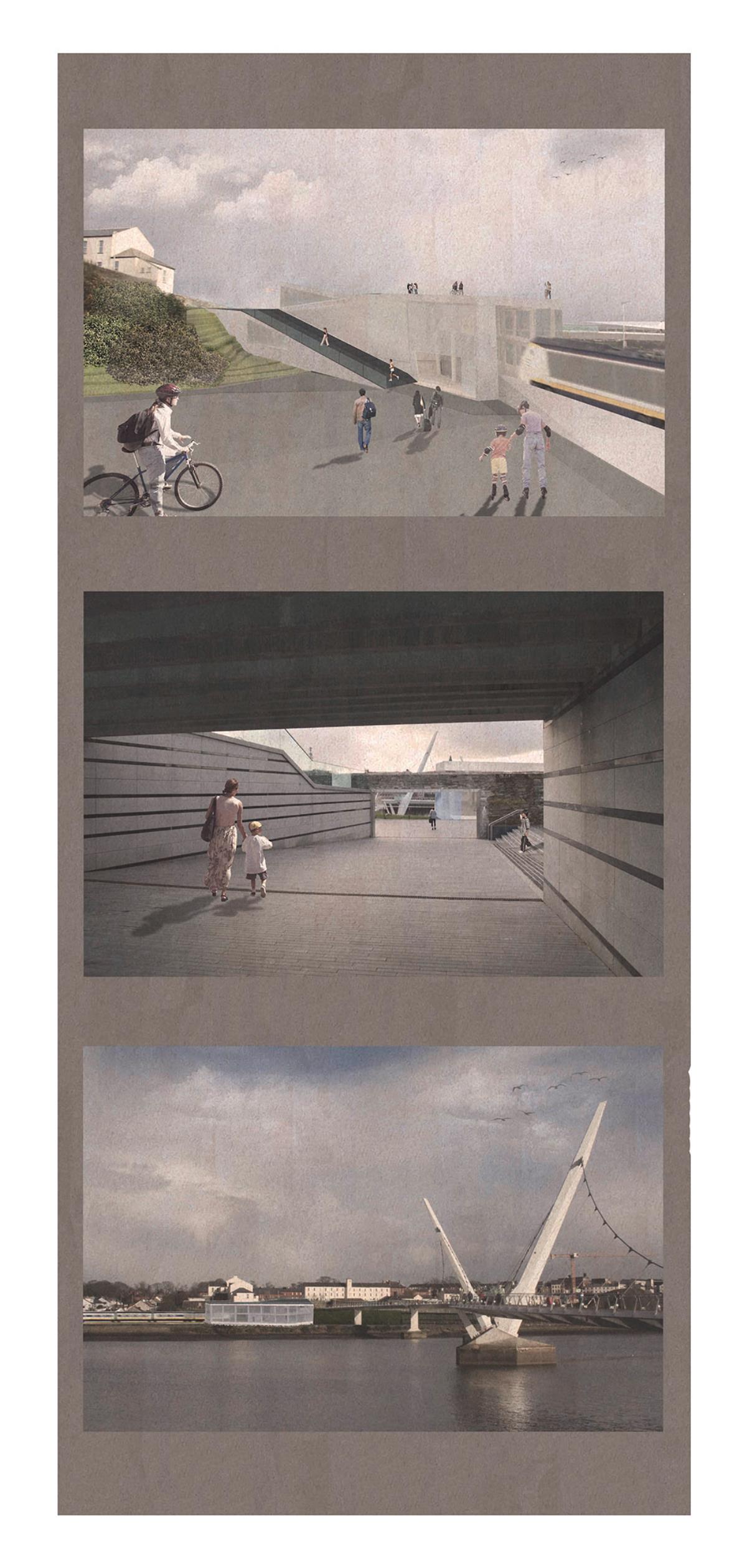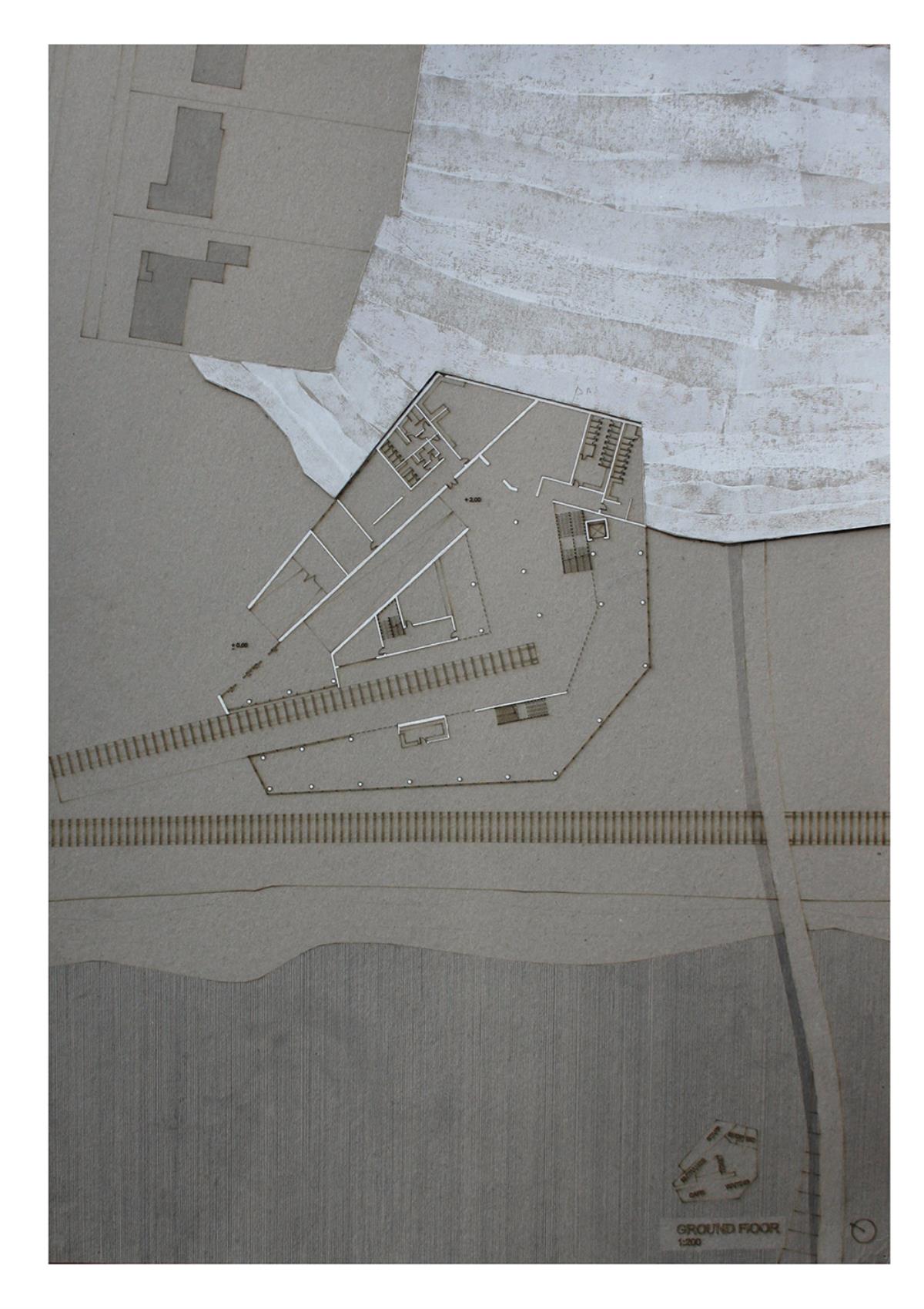 Train Station – ‘Building Becoming Topography’ Part 1 Project 2014 Miriam-Rose McLaughlin Queen's University Belfast | UK Train Station – Derry/LondonderryOn the meandering journey through the rumbling hills and rich farm land of mid Ulster one will encounter truly majestic scenes and enduring sites. Starting in Belfast the train passes over the Lagan, skirting the city and through lush county side. The train journey is hailed as one of the most scenic of outstanding beauty in Europe. The ceremonious journey however comes to an abrupt end, entering Derry/Londonderry into a dreary, drab 1970’s terminus station. Having arrived and disembarked, you cannot walk into the city centre; instead you must travel by bus, despite its close proximity.The proposal of a new Train Station sees the terminal relocated to a site beside the new pedestrian ‘Peace Bridge’, connecting the two sides of the city of Derry/Londonderry.The design concept is driven by the ‘movement of circulation’, in keeping with the typography of the site. Creating a form, as part of the landscape, but acting as a vehicle of movement between levels. The terminal arrival is something opposite to the journey itself; coming into the building, creates an architectural end experience, and maintains a visual connection to the bridge and city through the glazed walls. The user is then brought again into an open experience, as they journey across the Peace Bridge.The building’s language is to be read, ‘as a shed to house the arrival’, with shifting plates pushed out from the land, connecting to the context and driving the movement between people and transport.The importance of the project was not only to design a train station, but create a public enhancement to the city, driven by the connection to Ebrintion Barracks, the Peace Bridge, the terminal roof as a public platform and first floor, allowing a straight connection visually into the walled city. The building as a whole is to become part of the life of the city, not just for daily commuters, with shops, restaurant, café and tourist info. The presentation aimed to illustrate a building merged with landscape and context; the grey canvas blurs the lines between outside and inside. Tutor(s) Mr Tarla Macgabhann