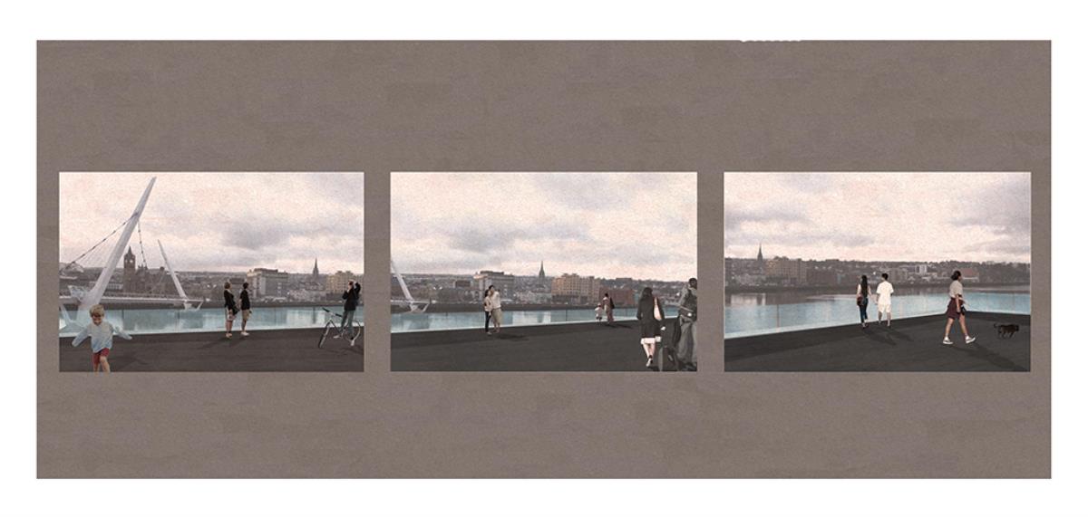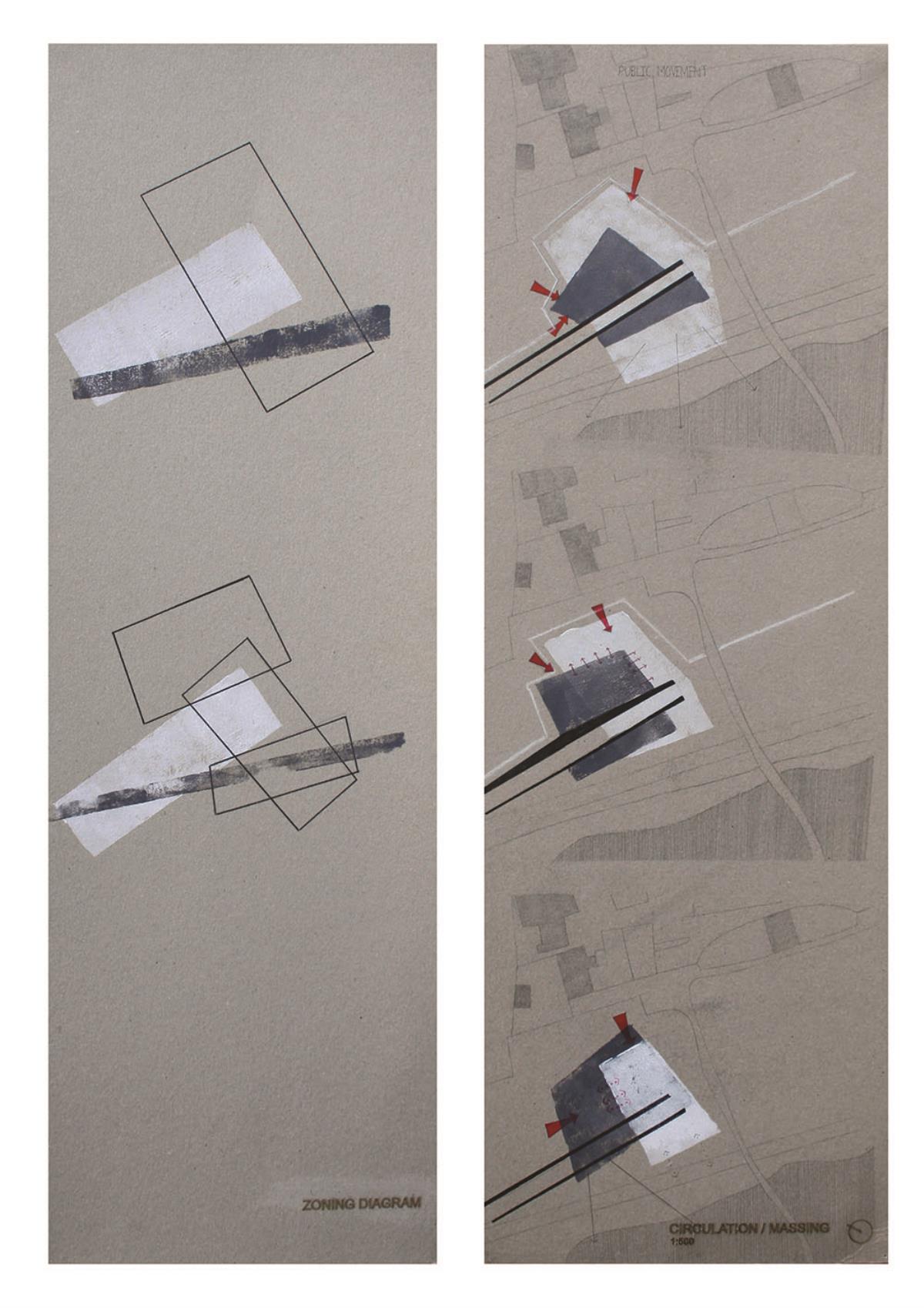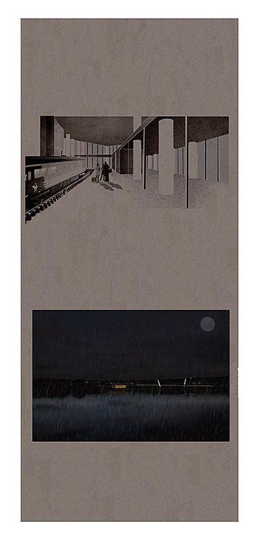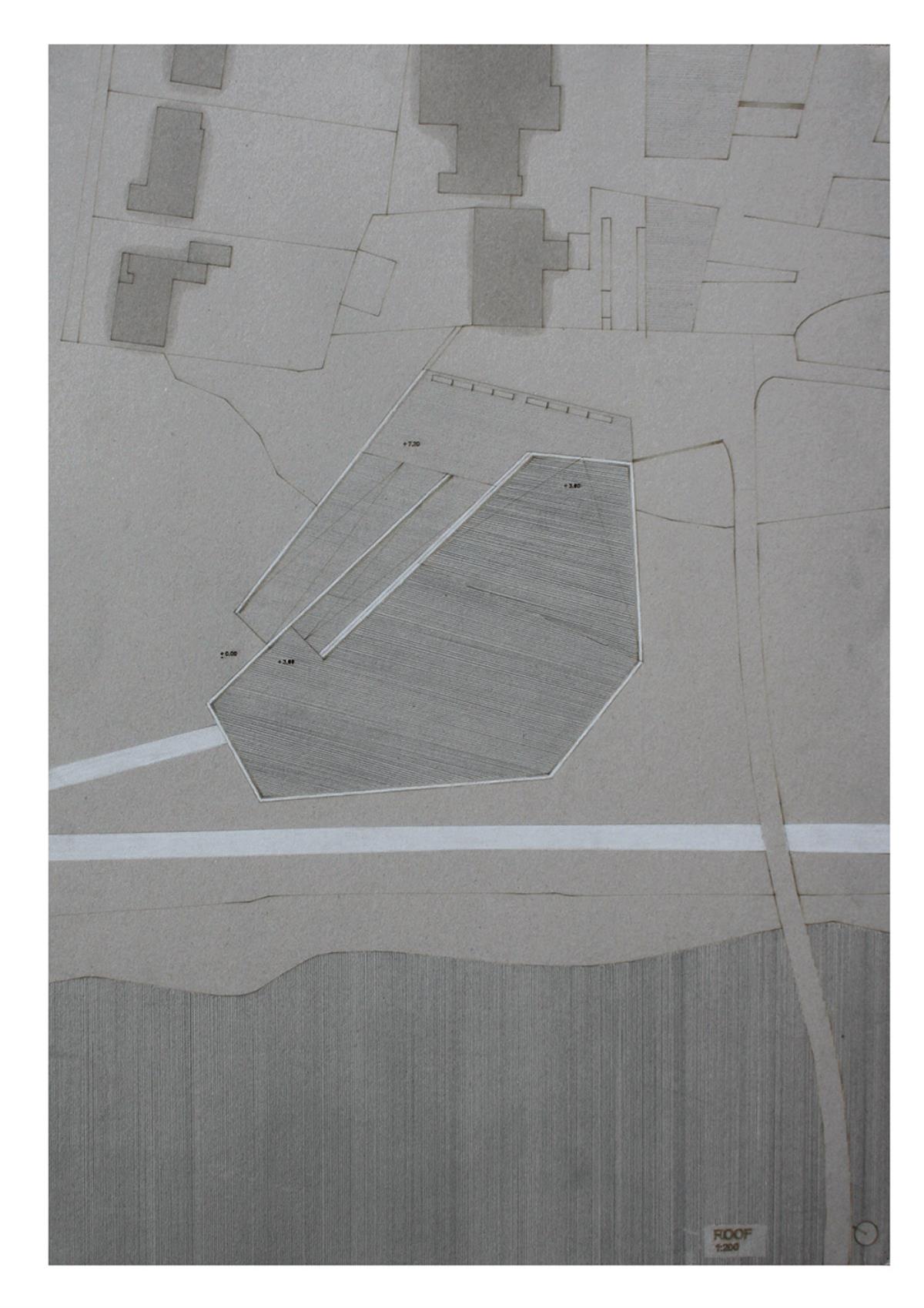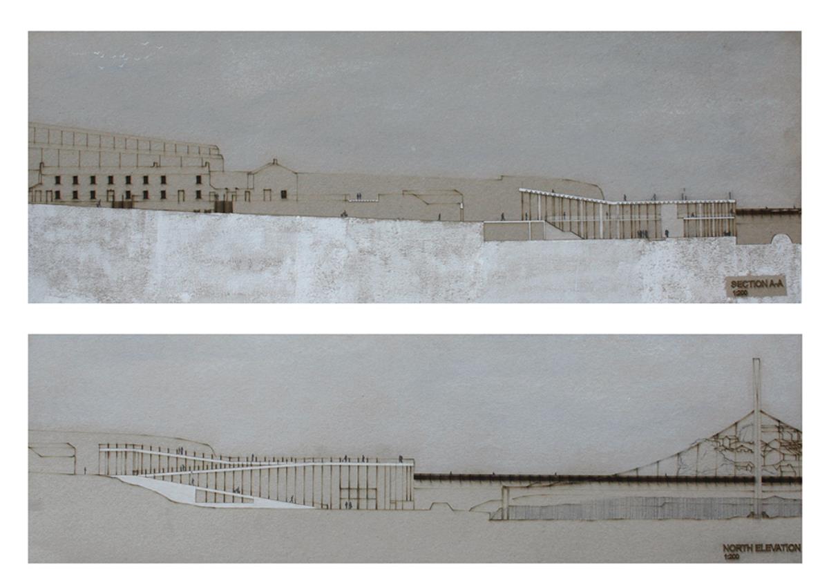 Train Station – ‘Building Becoming Topography’ Part 1 Project 2014 Miriam-Rose McLaughlin Queen's University Belfast | UK Train Station – Derry/LondonderryOn the meandering journey through the rumbling hills and rich farm land of mid Ulster one will encounter truly majestic scenes and enduring sites. Starting in Belfast the train passes over the Lagan, skirting the city and through lush county side. The train journey is hailed as one of the most scenic of outstanding beauty in Europe. The ceremonious journey however comes to an abrupt end, entering Derry/Londonderry into a dreary, drab 1970’s terminus station. Having arrived and disembarked, you cannot walk into the city centre; instead you must travel by bus, despite its close proximity.The proposal of a new Train Station sees the terminal relocated to a site beside the new pedestrian ‘Peace Bridge’, connecting the two sides of the city of Derry/Londonderry.The design concept is driven by the ‘movement of circulation’, in keeping with the typography of the site. Creating a form, as part of the landscape, but acting as a vehicle of movement between levels. The terminal arrival is something opposite to the journey itself; coming into the building, creates an architectural end experience, and maintains a visual connection to the bridge and city through the glazed walls. The user is then brought again into an open experience, as they journey across the Peace Bridge.The building’s language is to be read, ‘as a shed to house the arrival’, with shifting plates pushed out from the land, connecting to the context and driving the movement between people and transport.The importance of the project was not only to design a train station, but create a public enhancement to the city, driven by the connection to Ebrintion Barracks, the Peace Bridge, the terminal roof as a public platform and first floor, allowing a straight connection visually into the walled city. The building as a whole is to become part of the life of the city, not just for daily commuters, with shops, restaurant, café and tourist info. The presentation aimed to illustrate a building merged with landscape and context; the grey canvas blurs the lines between outside and inside. Tutor(s) Mr Tarla Macgabhann