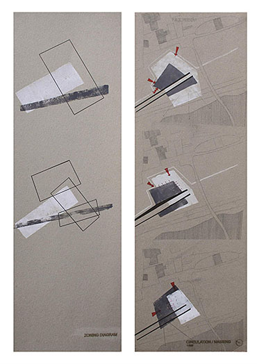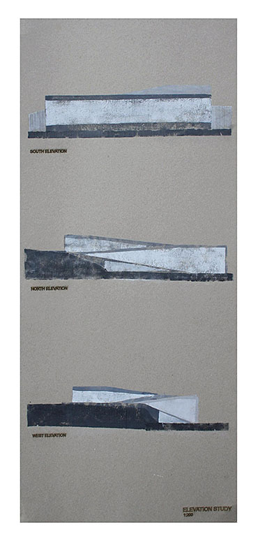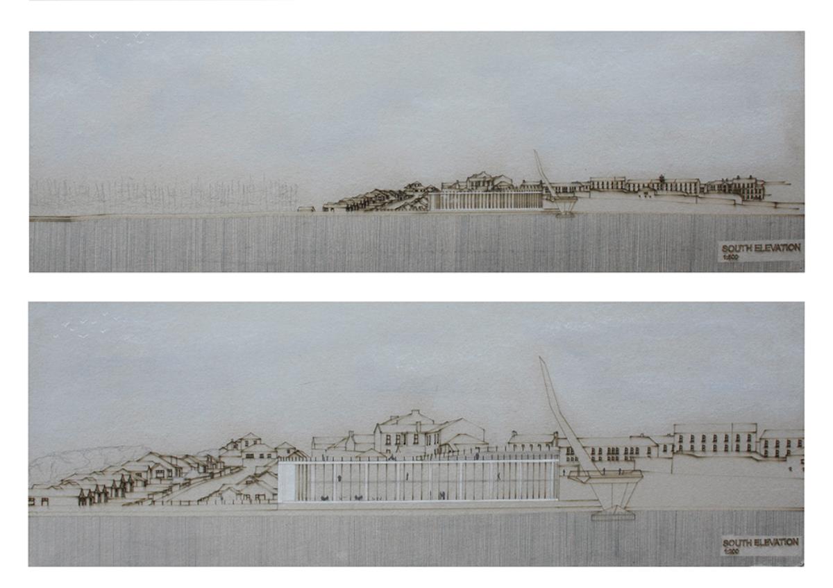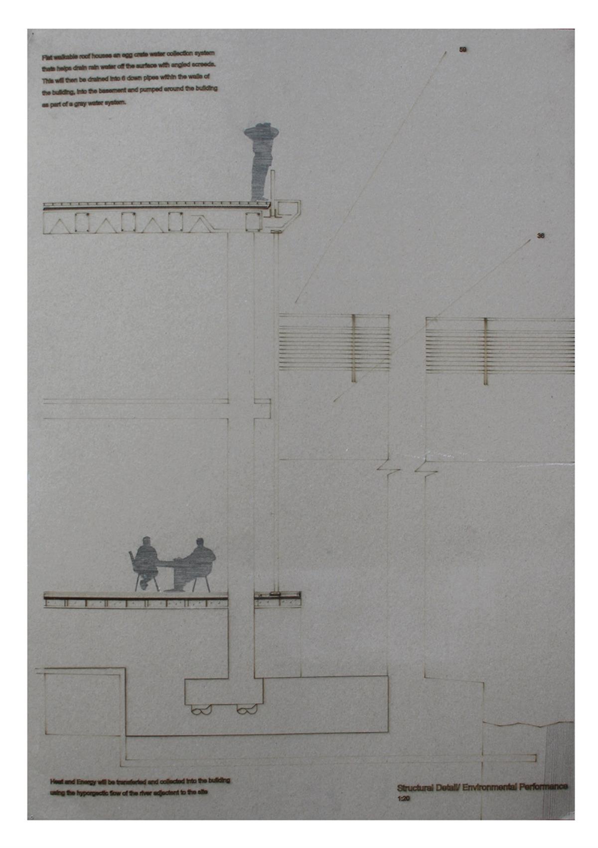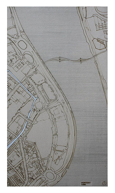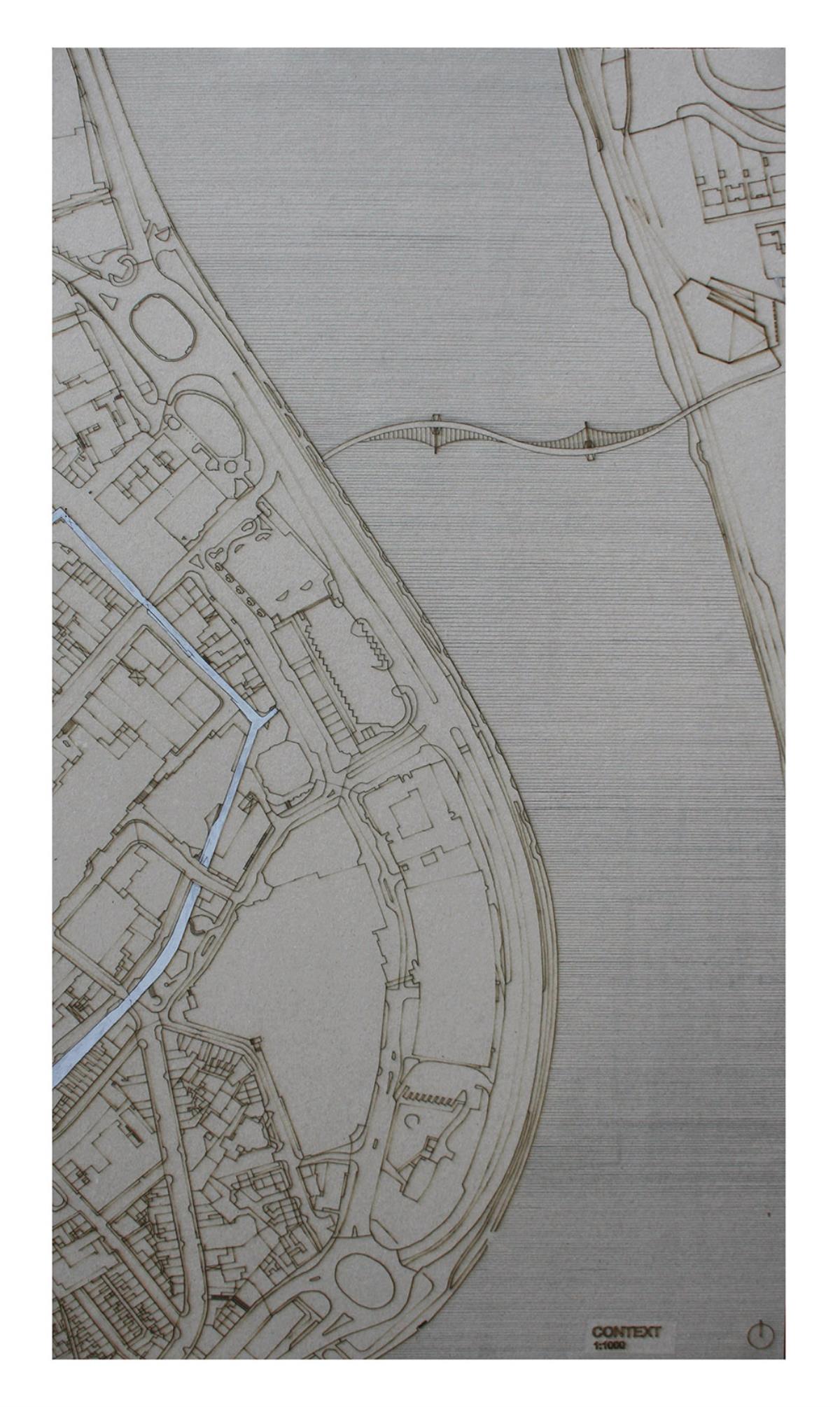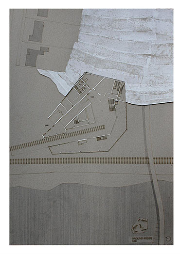 Train Station – ‘Building Becoming Topography’ Part 1 Project 2014 Miriam-Rose McLaughlin Queen's University Belfast | UK Train Station – Derry/LondonderryOn the meandering journey through the rumbling hills and rich farm land of mid Ulster one will encounter truly majestic scenes and enduring sites. Starting in Belfast the train passes over the Lagan, skirting the city and through lush county side. The train journey is hailed as one of the most scenic of outstanding beauty in Europe. The ceremonious journey however comes to an abrupt end, entering Derry/Londonderry into a dreary, drab 1970’s terminus station. Having arrived and disembarked, you cannot walk into the city centre; instead you must travel by bus, despite its close proximity.The proposal of a new Train Station sees the terminal relocated to a site beside the new pedestrian ‘Peace Bridge’, connecting the two sides of the city of Derry/Londonderry.The design concept is driven by the ‘movement of circulation’, in keeping with the typography of the site. Creating a form, as part of the landscape, but acting as a vehicle of movement between levels. The terminal arrival is something opposite to the journey itself; coming into the building, creates an architectural end experience, and maintains a visual connection to the bridge and city through the glazed walls. The user is then brought again into an open experience, as they journey across the Peace Bridge.The building’s language is to be read, ‘as a shed to house the arrival’, with shifting plates pushed out from the land, connecting to the context and driving the movement between people and transport.The importance of the project was not only to design a train station, but create a public enhancement to the city, driven by the connection to Ebrintion Barracks, the Peace Bridge, the terminal roof as a public platform and first floor, allowing a straight connection visually into the walled city. The building as a whole is to become part of the life of the city, not just for daily commuters, with shops, restaurant, café and tourist info. The presentation aimed to illustrate a building merged with landscape and context; the grey canvas blurs the lines between outside and inside. Tutor(s) Mr Tarla Macgabhann
