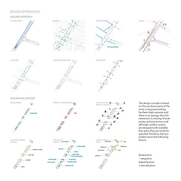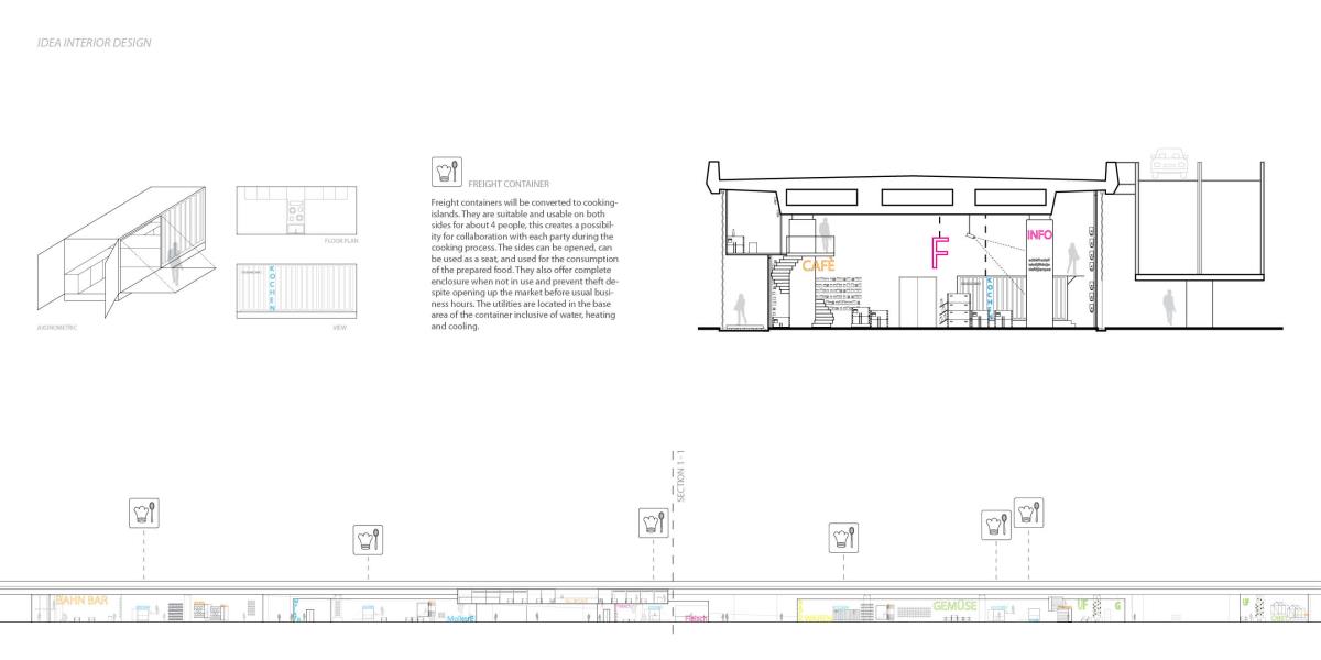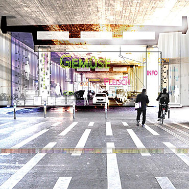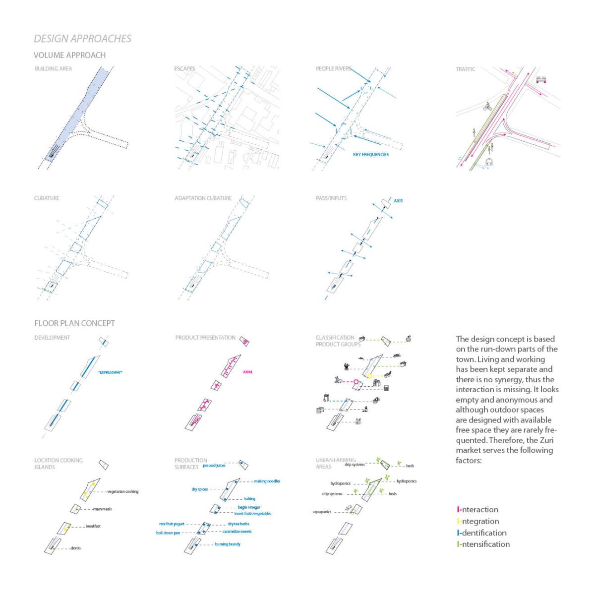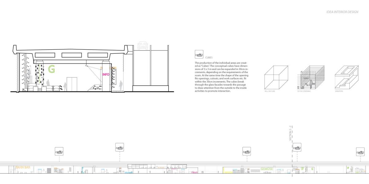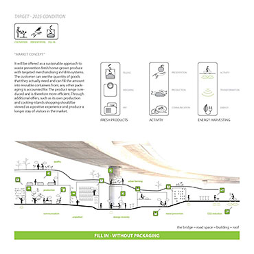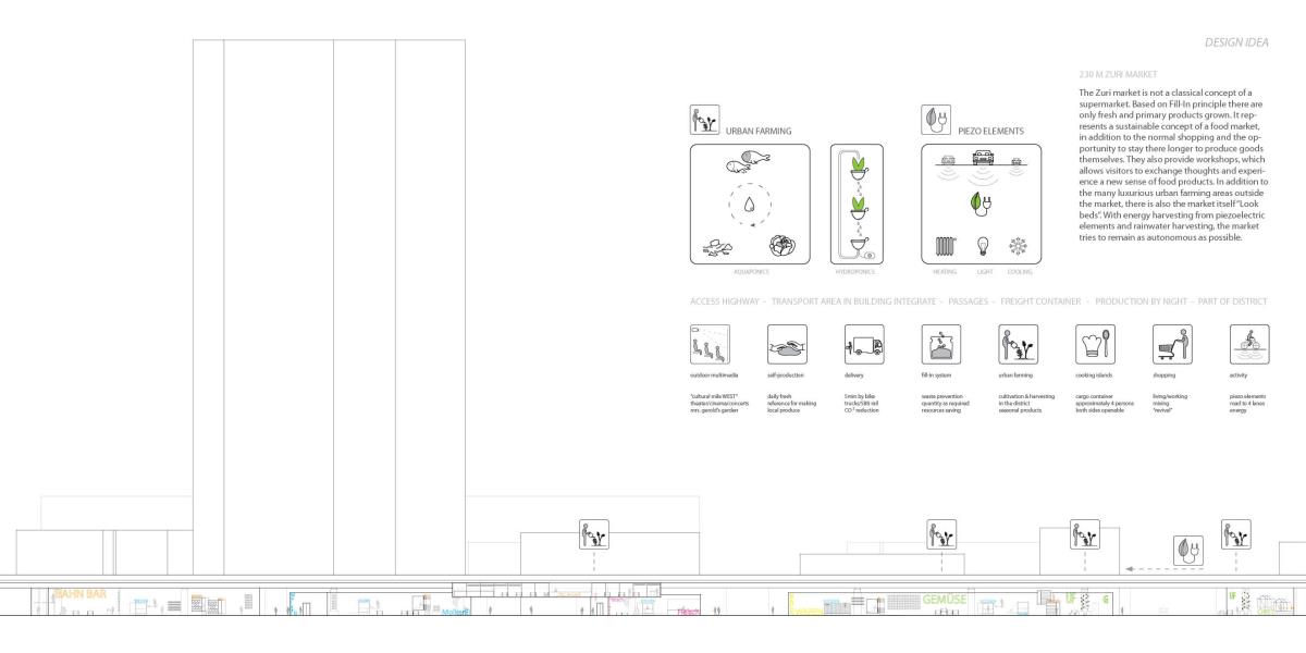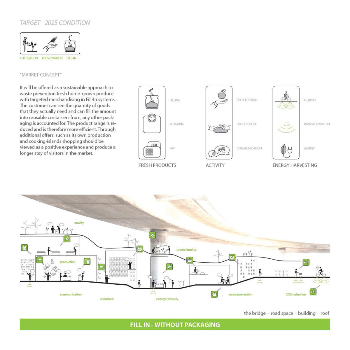 Zuri Market Part 1 Project 2014 Tanja KaufmannAlisa-Ramona Kellner University of Innsbruck | Austria IS - 2014 CONDITIONShopping is currently closely linked to the components of stress and lack of time. This creates very little positive attributes whilst grocery shopping in addition to lacking personal communication due to it being replaced by social media and technological communication, thereby creating an impersonal barrier.The design concept is based on the run-down parts of the town. Living and working has been kept separate and there is no synergy, thus the interaction is missing. It looks empty and anonymous and although outdoor spaces are designed with available free space they are rarely frequented. Therefore, the Zuri market serves the following factors:I-nteraction - I-ntegration - I-dentification - I-ntensificationTARGET - 2025 CONDITIONMARKET CONCEPT - It will be offered as a sustainable approach to waste prevention fresh home-grown produce with targeted merchandising in Fill-In systems. The customer can see the quantity of goods that they actually need and can fill the amount into reusable containers from; any other packaging is accounted for. The product range is reduced and is therefore more efficient. Through additional offers, such as its own production and cooking-islands shopping should be viewed as a positive experience and produce a longer stay of visitors in the market.230 M ZURI MARKET is not a classical concept of a supermarket. Based on Fill-In principle there are only fresh and primary products grown. It represents a sustainable concept of a food market, in addition to the normal shopping and the opportunity to stay there longer to produce goods themselves. They also provide workshops, which allows visitors to exchange thoughts and experience a new sense of food products. In addition to the many luxurious urban farming areas outside the market, there is also the market itself “Look beds”. With energy harvesting from piezoelectric elements and rainwater harvesting, the market tries to remain as autonomous as possible. Tutor(s) Andreas Flora Ferdinand Reiter