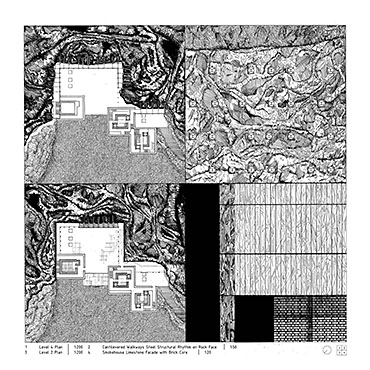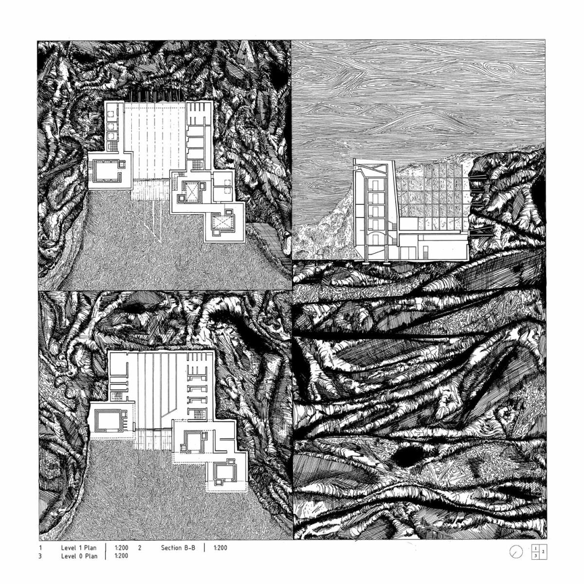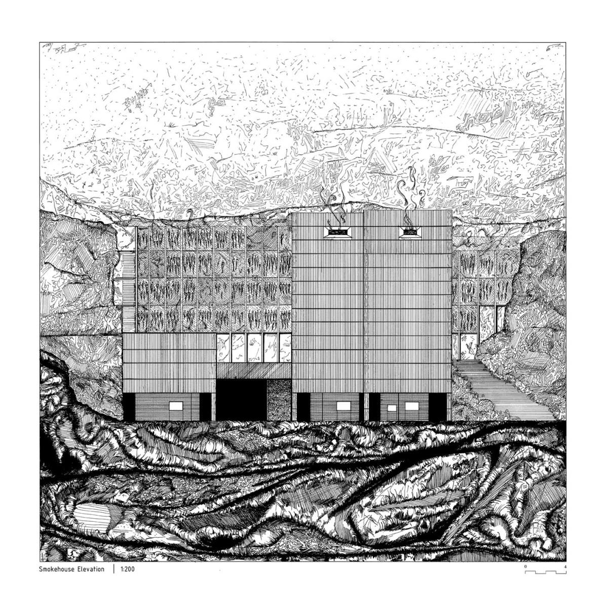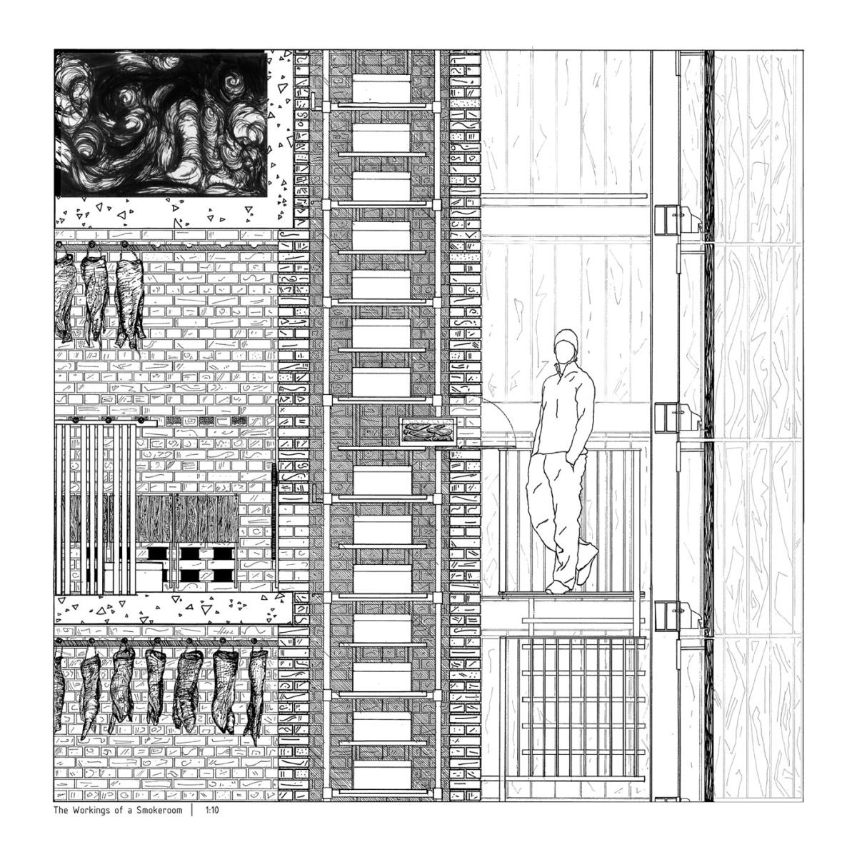 Between the Lines: A thesis driven by line as evidenced in landscape, process, and technique Part 2 Project 2014 Megan White Queen's University Belfast | UK The Smokehouse and the Antrim Coast RoadBetween the lines; a thesis driven by line as evidenced in landscape, process, and technique.384.6km the first line drawn; the Antrim Coast Road, Northern Ireland. Walk, drive or cycle this iconic route, one is caught by the abandoned ruins of Glenarm Whiting Mill and Quarry, the only objects for miles that directly interfere with this unabashed road that cuts through the wild Antrim Glens. The site embodies sadness; the town itself once fuelled by the mill appears to have lost its spirit, extinguished with the fires, slowly surrendering to the unforgiving landscape. The Glenarm Organic Salmon company cast their nets a stone throw away from the abandoned Quarry; yet process their produce further down the line, towards Donegal. Salmon, like most fish can be sold; fresh, frozen, whole, filleted and smoked but it is also one of few fish that can be cold smoked. It was the process of smoking that seemed to resonate with the topography of the abandoned Quarry. A brutal process that left bold traces in the landscape, deep striations as it was excavated in sheets and once this force seized to continue it left sheltered volumes; a poetic platform in which to drape fillets to dry in the salty breeze and brought forth an image of salmon speckling this rough white lime surface of the glens, a new home for Glenarm Smoked Salmon. Black linear drawings of this evolving quarry line and rock face became an obsession that fuelled the project. The smokehouse themselves played on the original verticality of the old limestone kilns. Parallels were drawn between the two processes, extrapolating the idea of using cavity walls to manipulate the linear movement of smoke, which permitted the rooms to stack into chimneys that could nestle into this readapted landscape and connect to the limestone face via a series of staircases and walkways that cling like limpets to the unspoiled rock face. Upon reflection the thesis truly became an exploration into a now very apparent stylistic approach to drawing. Tutor(s) Cian Deagan Professor Michael McGarry