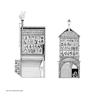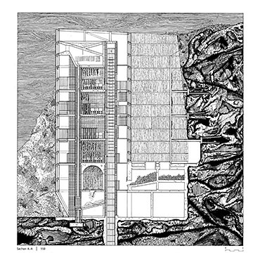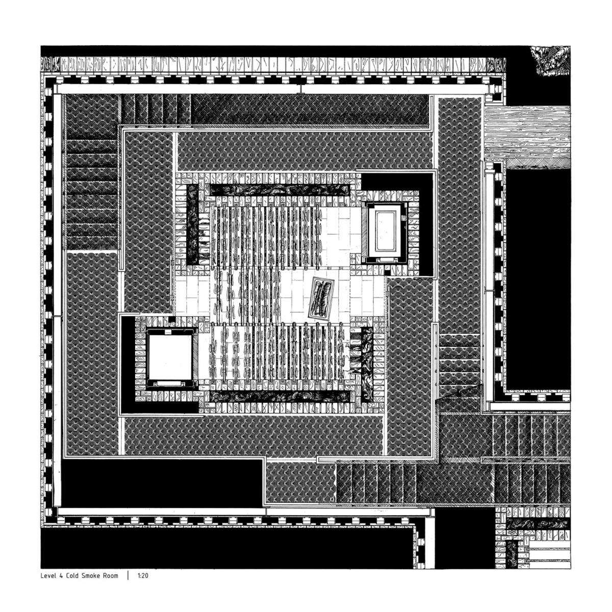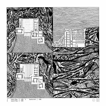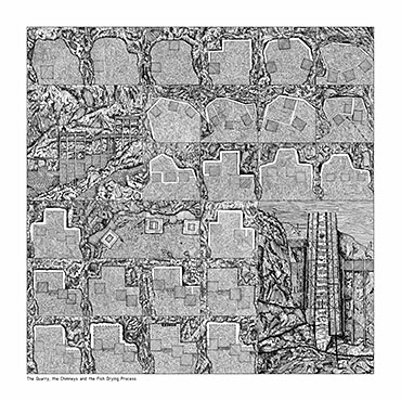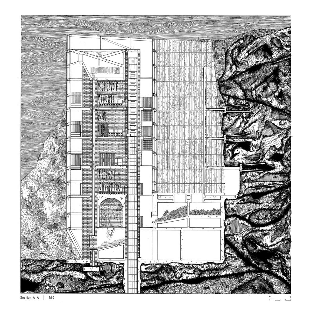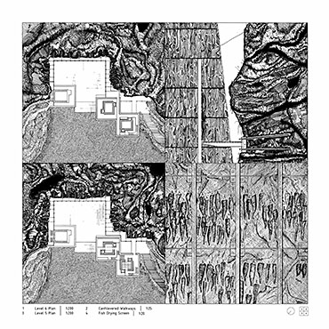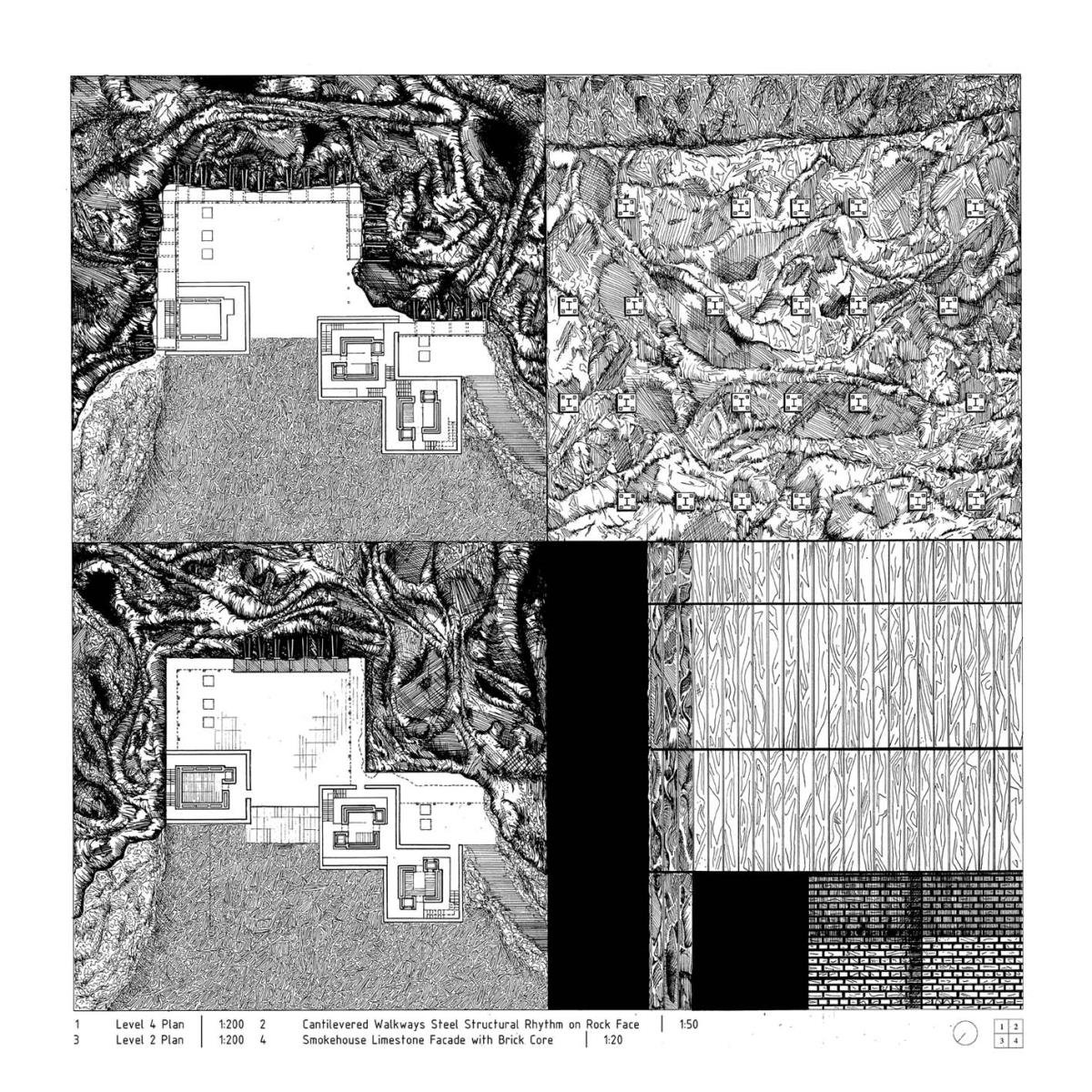 Between the Lines: A thesis driven by line as evidenced in landscape, process, and technique Part 2 Project 2014 Megan White Queen's University Belfast | UK The Smokehouse and the Antrim Coast RoadBetween the lines; a thesis driven by line as evidenced in landscape, process, and technique.384.6km the first line drawn; the Antrim Coast Road, Northern Ireland. Walk, drive or cycle this iconic route, one is caught by the abandoned ruins of Glenarm Whiting Mill and Quarry, the only objects for miles that directly interfere with this unabashed road that cuts through the wild Antrim Glens. The site embodies sadness; the town itself once fuelled by the mill appears to have lost its spirit, extinguished with the fires, slowly surrendering to the unforgiving landscape. The Glenarm Organic Salmon company cast their nets a stone throw away from the abandoned Quarry; yet process their produce further down the line, towards Donegal. Salmon, like most fish can be sold; fresh, frozen, whole, filleted and smoked but it is also one of few fish that can be cold smoked. It was the process of smoking that seemed to resonate with the topography of the abandoned Quarry. A brutal process that left bold traces in the landscape, deep striations as it was excavated in sheets and once this force seized to continue it left sheltered volumes; a poetic platform in which to drape fillets to dry in the salty breeze and brought forth an image of salmon speckling this rough white lime surface of the glens, a new home for Glenarm Smoked Salmon. Black linear drawings of this evolving quarry line and rock face became an obsession that fuelled the project. The smokehouse themselves played on the original verticality of the old limestone kilns. Parallels were drawn between the two processes, extrapolating the idea of using cavity walls to manipulate the linear movement of smoke, which permitted the rooms to stack into chimneys that could nestle into this readapted landscape and connect to the limestone face via a series of staircases and walkways that cling like limpets to the unspoiled rock face. Upon reflection the thesis truly became an exploration into a now very apparent stylistic approach to drawing. Tutor(s) Cian Deagan Professor Michael McGarry