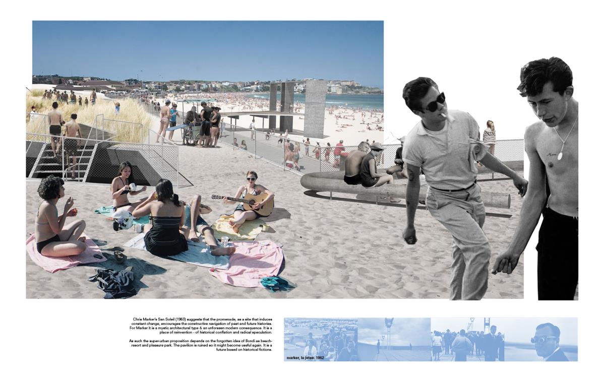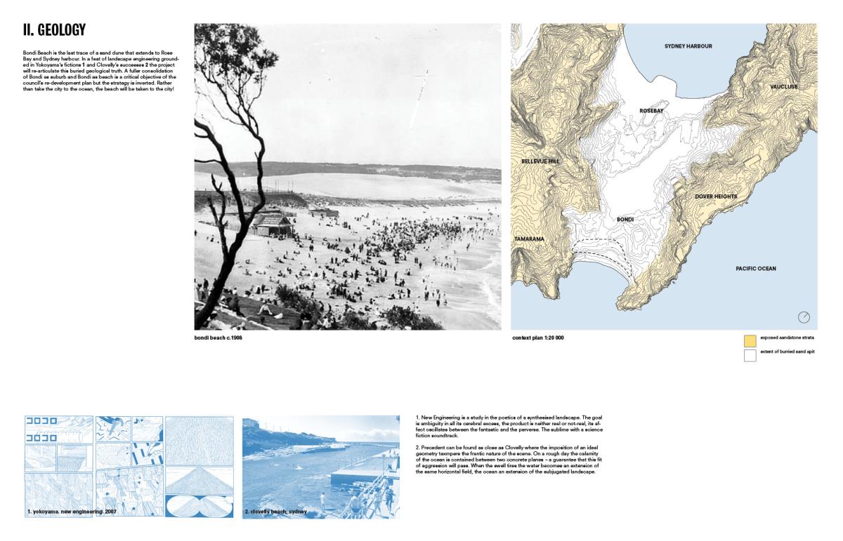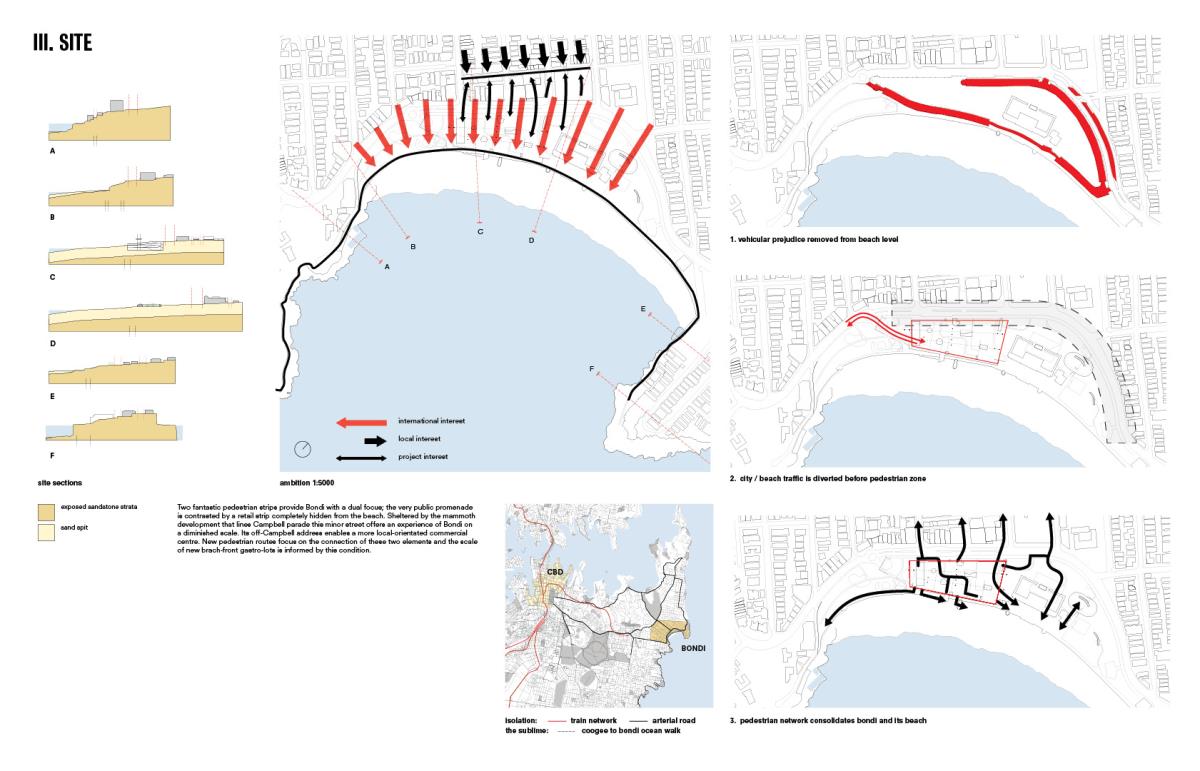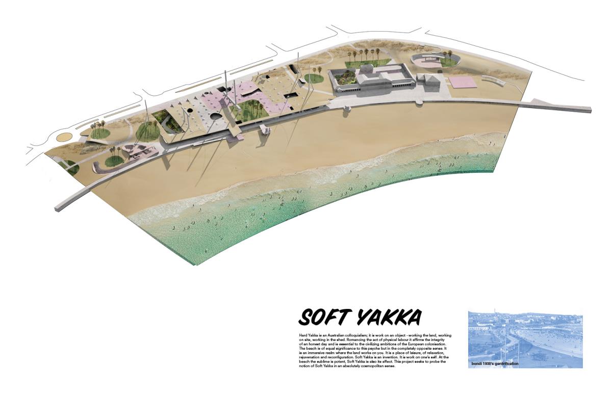 In a spectacle of engineering squared at a buried geological truth, this project seeks to re-attach Bondi to its city. Informed by a study of Venice Beach CA the strategy is of intensification rather than resolution. The existing promenade becomes vital. As an architectural type that incites extroversion and liberates traditional privacies, it will be expanded, inviting proximities that architecture instinctively works to contain. It’s the inevitable impermanence of beachside architecture recognized as the urban ideal of event based hybridity. Soft Yakka mobilised.