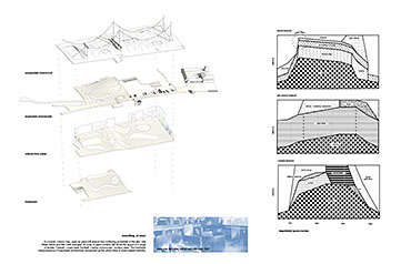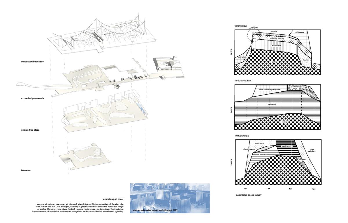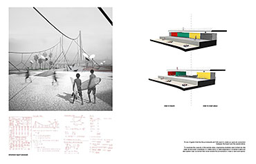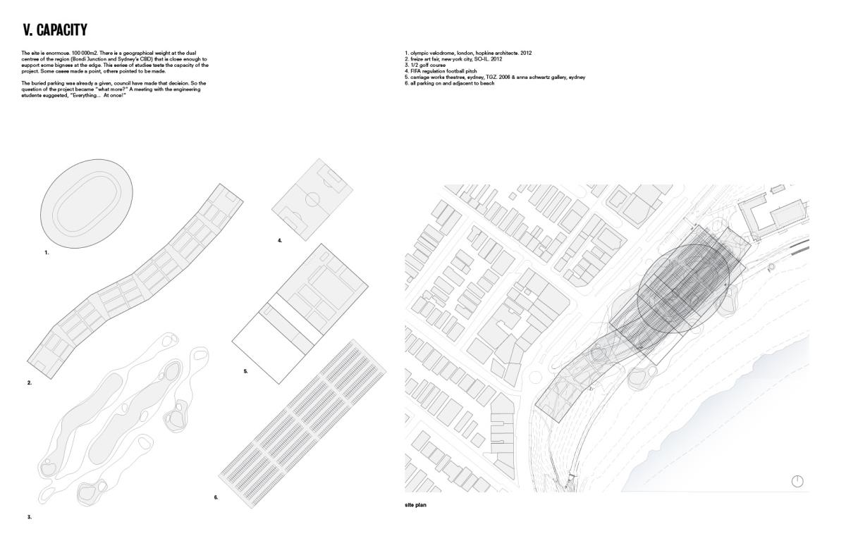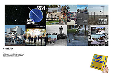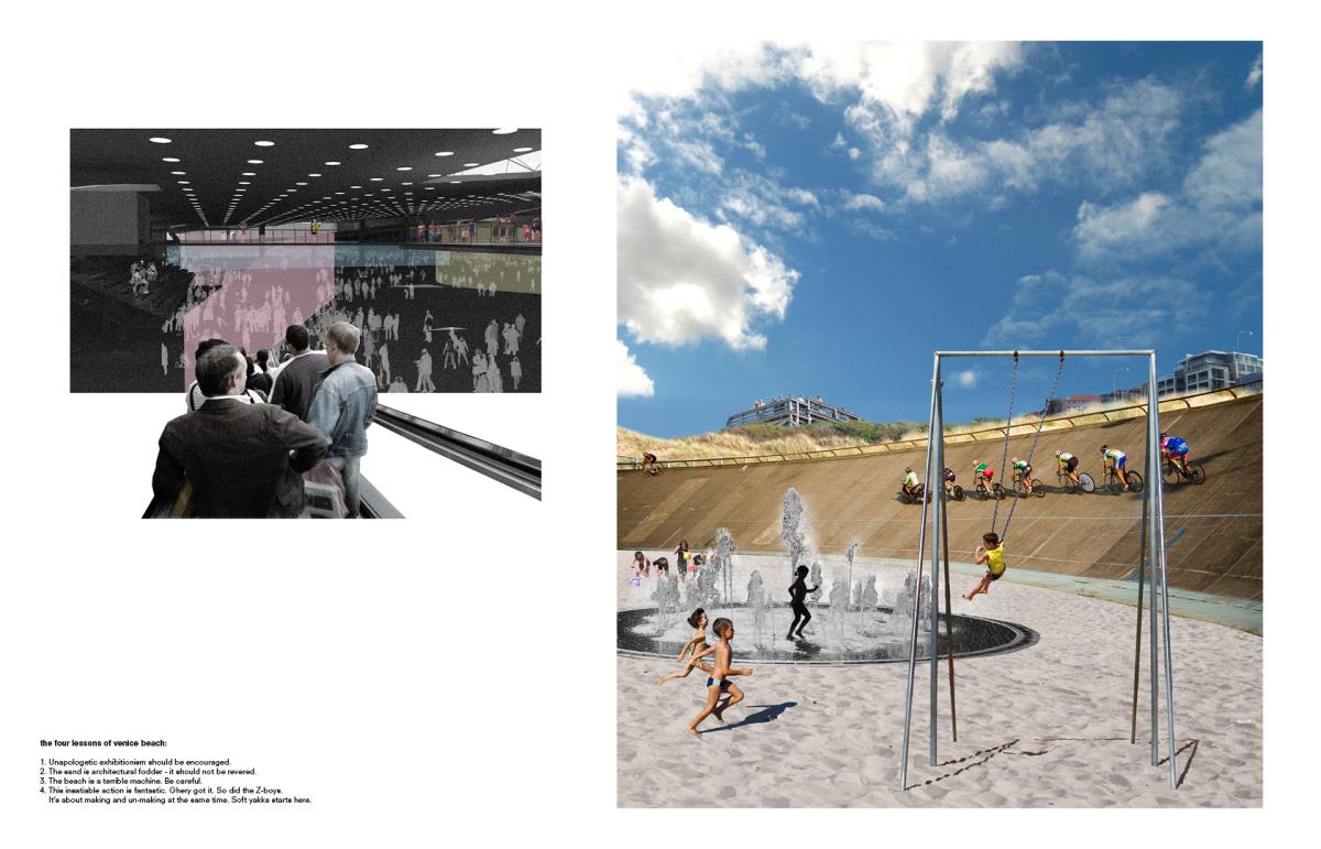 In a spectacle of engineering squared at a buried geological truth, this project seeks to re-attach Bondi to its city. Informed by a study of Venice Beach CA the strategy is of intensification rather than resolution. The existing promenade becomes vital. As an architectural type that incites extroversion and liberates traditional privacies, it will be expanded, inviting proximities that architecture instinctively works to contain. It’s the inevitable impermanence of beachside architecture recognized as the urban ideal of event based hybridity. Soft Yakka mobilised.