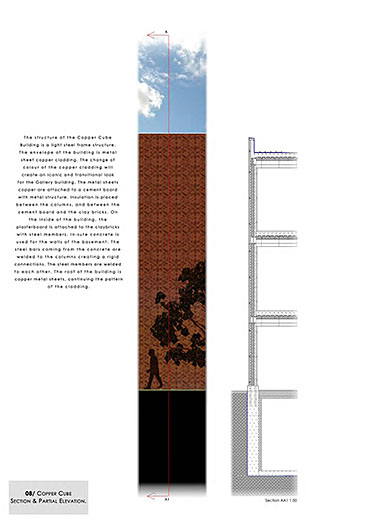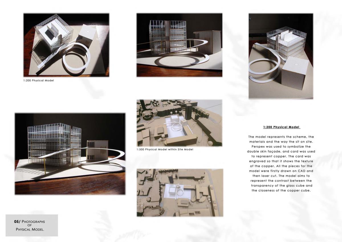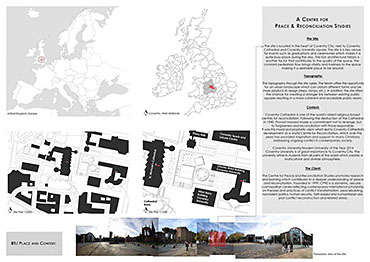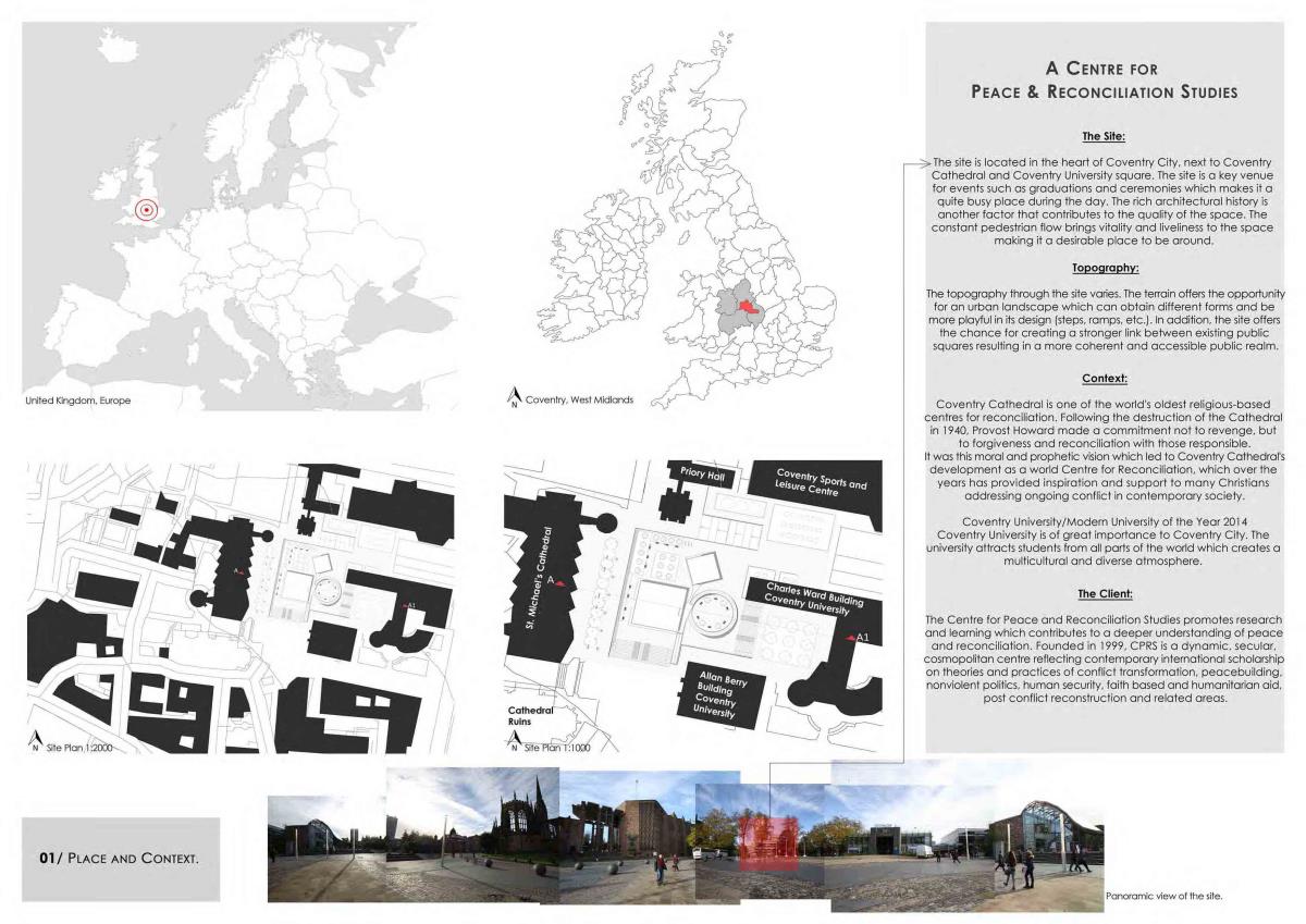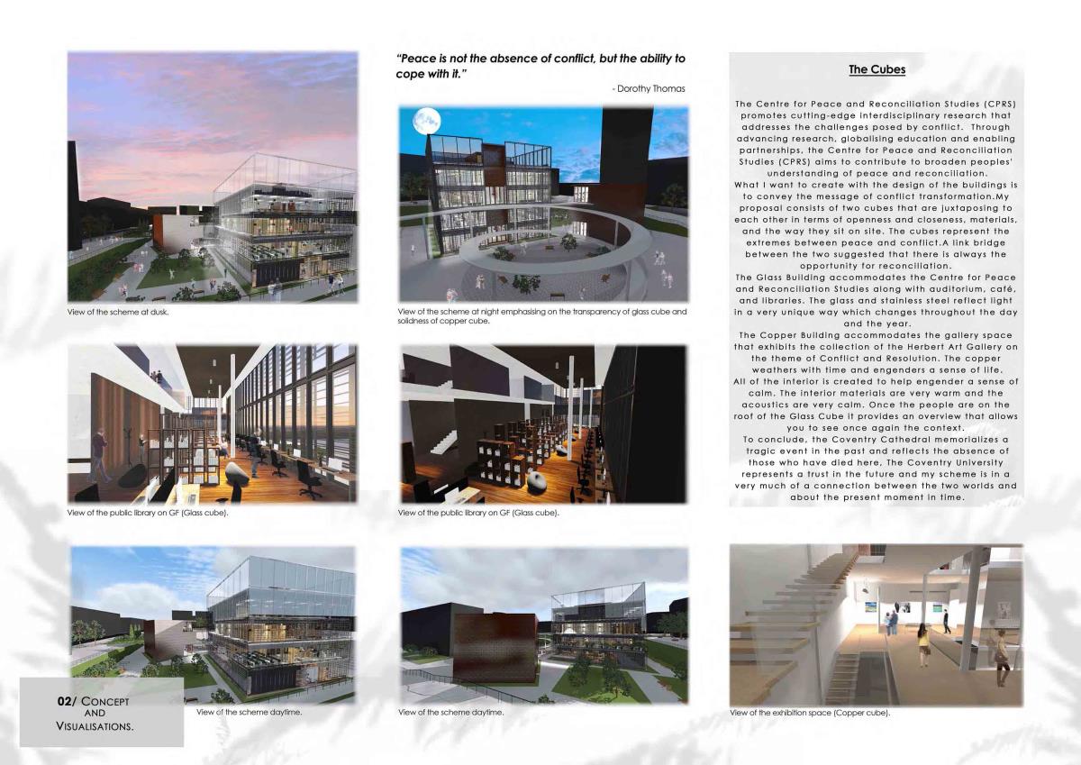 A Centre for Peace and Reconciliation Studies Part 1 Project 2014 Yoana Krasteva Coventry University | UK The Centre for Peace and Reconciliation Studies (CPRS) promotes cutting-edge interdisciplinary research that addresses the challenges posed by conflict. Through advancing research, globalising education and enabling partnerships, the Centre for Peace and Reconciliation Studies (CPRS) aims to contribute to broaden peoples' understanding of peace and reconciliation. What I want to achieve with the design of the buildings is to convey the message of conflict transformation. My proposal consists of two cubes that are juxtaposing to each other in terms of openness and closeness, materials, and the way they sit on site. The cubes represent the extremes between peace and conflict. A link bridge between the two suggested that there is always the opportunity for reconciliation. The Glass Building accommodates the Centre for Peace and Reconciliation Studies along with auditorium, café, and libraries. The glass and stainless steel reflect light in a very unique way which changes throughout the day and the year. The Copper Building accommodates the gallery space that exhibits the collection of the Herbert Art Gallery on the theme of Conflict and Resolution. The copper weathers with time and engenders a sense of life.All of the interior is created to help engender a sense of calm. The interior materials are very warm and the acoustics are very calm. Once the people are on the roof of the Glass Cube it provides an overview that allows you to see once again the context. To conclude, the Coventry Cathedral memorializes a tragic event in the past and reflects the absence of those who have died here, The Coventry University represents a trust in the future and my scheme is in a very much of a connection between the two worlds and about the present moment in time. Tutor(s) Russell Stevens