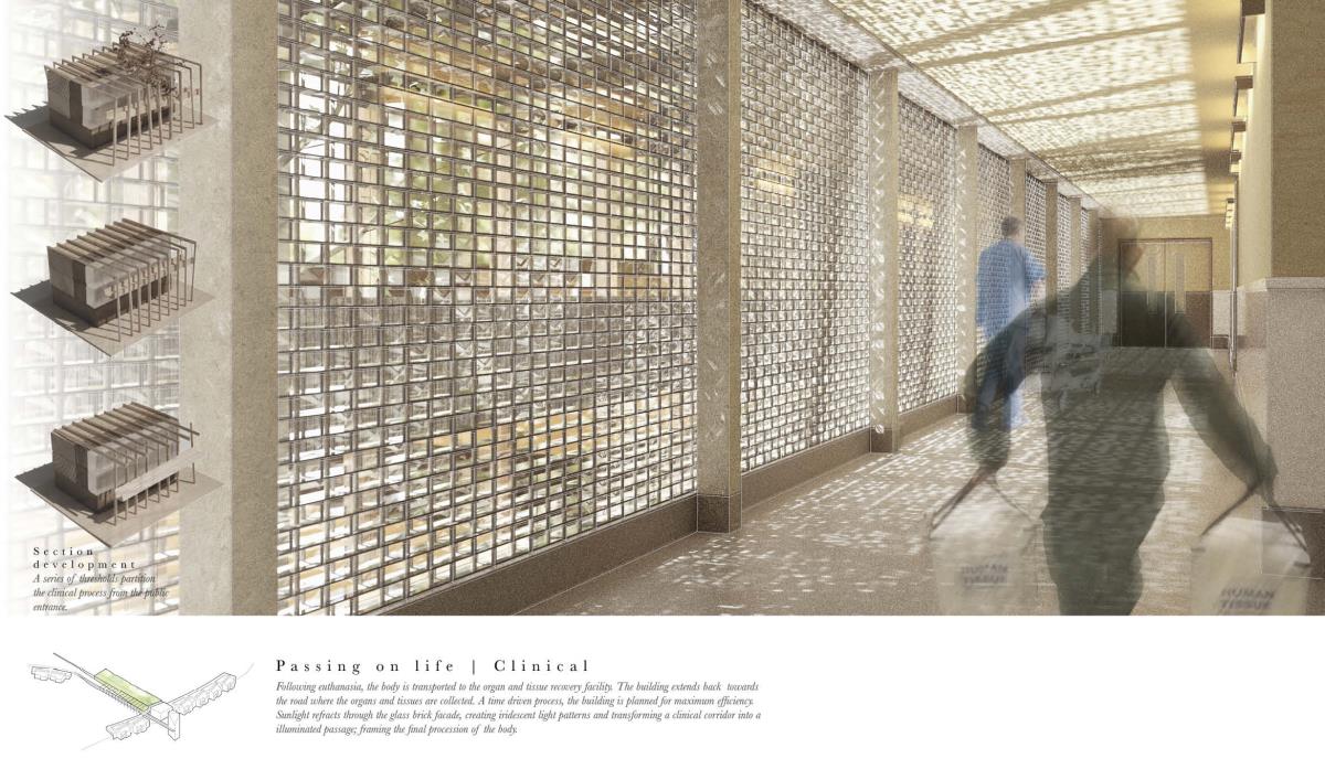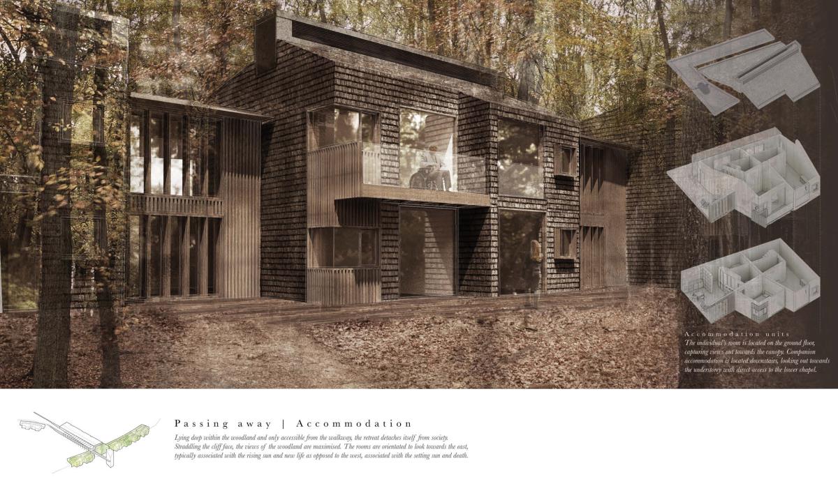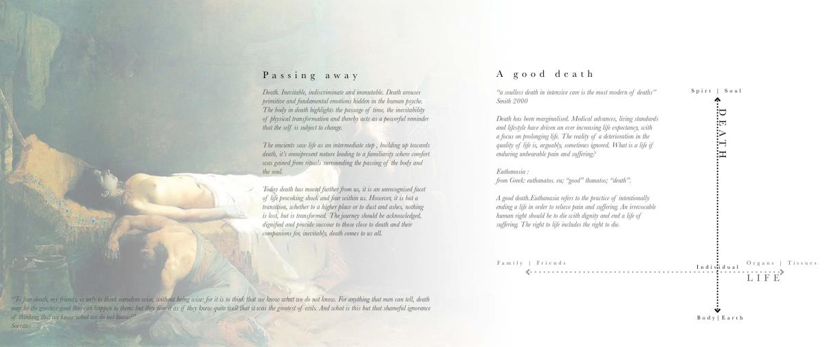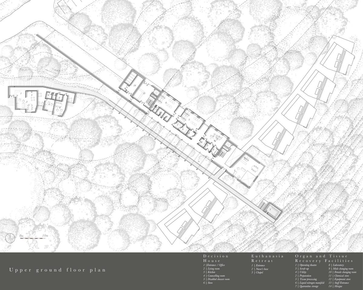 The Passing Place Part 1 Project 2014 Charlotte Eley University of Bath | UK Passing away. Passing on life.Death has been marginalised. Medical advances, living standards and lifestyle have driven an ever increasing life expectancy, with a focus on prolonging life. The reality of a deterioration in the quality of life is, arguably, sometimes ignored. What is a life if enduring unbearable pain and suffering? An irrevocable human right should be to die with dignity and end a life of suffering. The right to life includes the right to die; euthanasia. After death, one person can help up to 8 people through organ donation, and benefit many more, up to 50, by donating tissue. Currently there are 10,000 people waiting for organ transplants in the UK and unfortunately most people die in circumstances that preclude organ donation. This unavailability of adequate organs for transplantation to meet the existing demand has resulted in an organ shortage crisis. This project explores the pairing of a euthanasia retreat with the facilities for organ and tissue recovery; providing life to others following the death of an individual. This new building typology seeks to address society’s shifting attitude towards death and the invaluable potential of organ transplantation following euthanasia. This not only aids the co-ordination and, as a result, the success of organ transplantation, but hopes to provide comfort to the organ donor and their companions. The euthanasia retreat is located in the depths of woodland, anchored to the cliff face to provide views out towards the canopy. The clinical element site perpendicular to the accommodation, extending back towards the road and providing an efficient process for the removal and distribution of organs. Detached from the form lie the arrival and departure thresholds. The arrival; a place of decision. Independent of the euthanasia retreat, the decision house looks out into open woodland. The departure; a place of release. The chapel stands alone, connecting the earth to the heavens; the axis mundi. The architecturale promenade binds the elements together, a threshold between passing away and passing on life. Tutor(s)Mr Martin Gledhill Daniel Wong