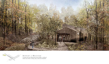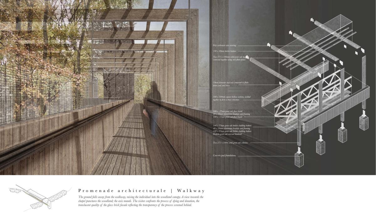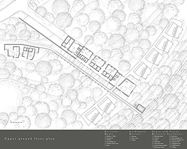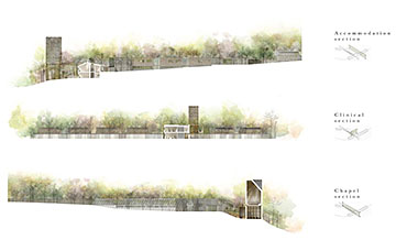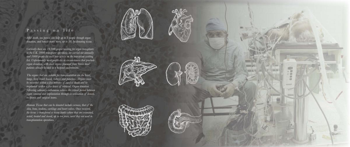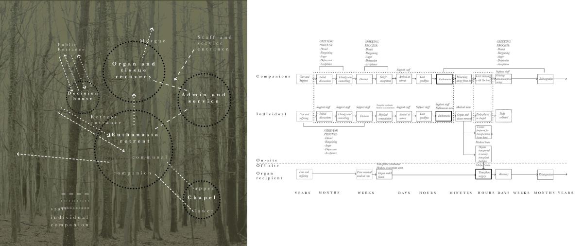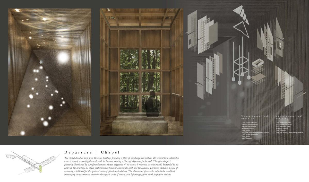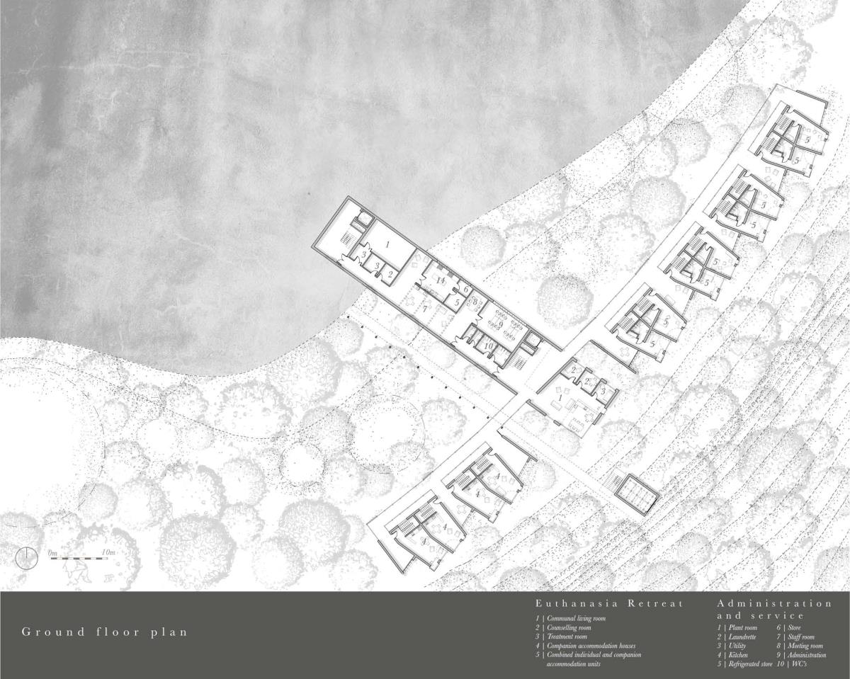 The Passing Place Part 1 Project 2014 Charlotte Eley University of Bath | UK Passing away. Passing on life.Death has been marginalised. Medical advances, living standards and lifestyle have driven an ever increasing life expectancy, with a focus on prolonging life. The reality of a deterioration in the quality of life is, arguably, sometimes ignored. What is a life if enduring unbearable pain and suffering? An irrevocable human right should be to die with dignity and end a life of suffering. The right to life includes the right to die; euthanasia. After death, one person can help up to 8 people through organ donation, and benefit many more, up to 50, by donating tissue. Currently there are 10,000 people waiting for organ transplants in the UK and unfortunately most people die in circumstances that preclude organ donation. This unavailability of adequate organs for transplantation to meet the existing demand has resulted in an organ shortage crisis. This project explores the pairing of a euthanasia retreat with the facilities for organ and tissue recovery; providing life to others following the death of an individual. This new building typology seeks to address society’s shifting attitude towards death and the invaluable potential of organ transplantation following euthanasia. This not only aids the co-ordination and, as a result, the success of organ transplantation, but hopes to provide comfort to the organ donor and their companions. The euthanasia retreat is located in the depths of woodland, anchored to the cliff face to provide views out towards the canopy. The clinical element site perpendicular to the accommodation, extending back towards the road and providing an efficient process for the removal and distribution of organs. Detached from the form lie the arrival and departure thresholds. The arrival; a place of decision. Independent of the euthanasia retreat, the decision house looks out into open woodland. The departure; a place of release. The chapel stands alone, connecting the earth to the heavens; the axis mundi. The architecturale promenade binds the elements together, a threshold between passing away and passing on life. Tutor(s)Mr Martin Gledhill Daniel Wong