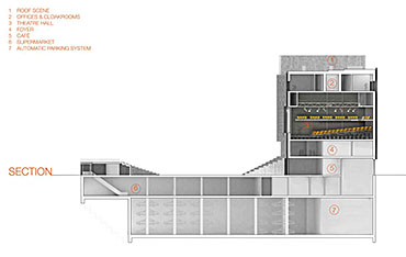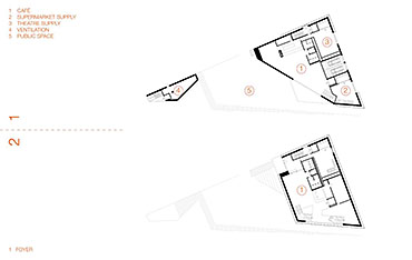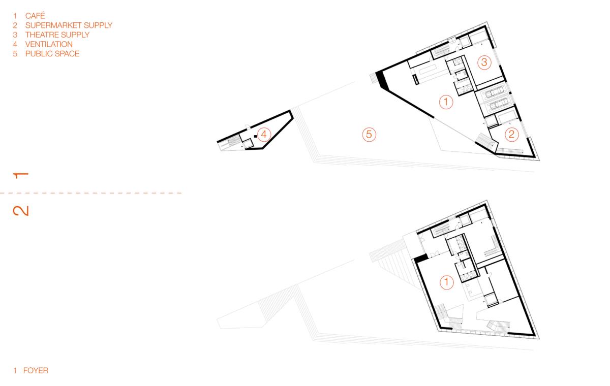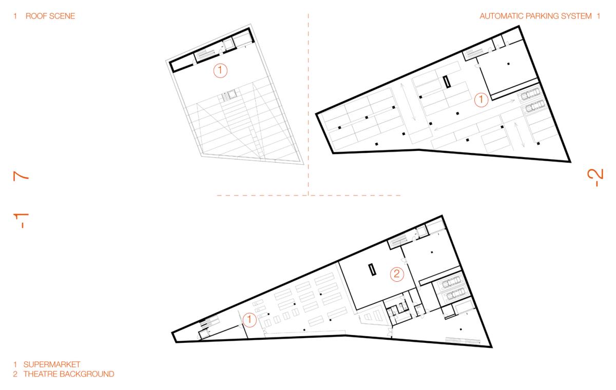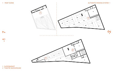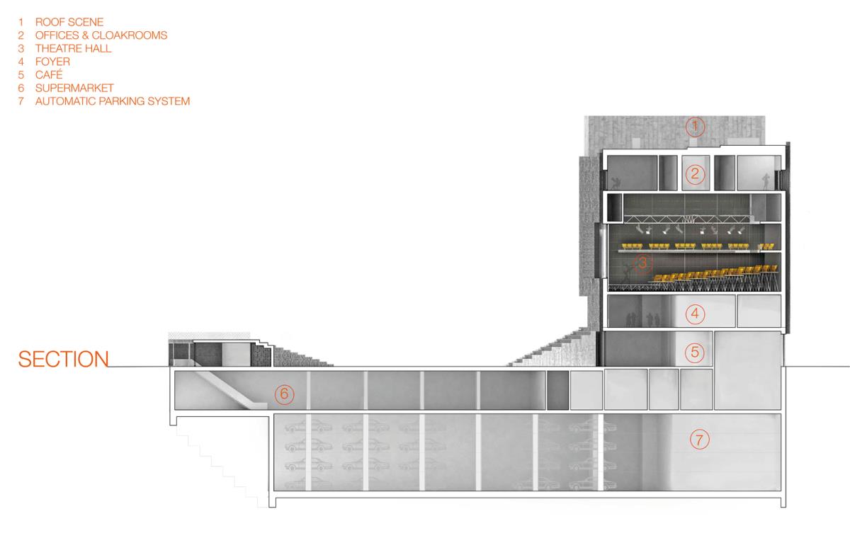 The structural counterpart of the theatre is one-storey structure which serves as an entrance of the supermarket, which is relocated to the underground space of the square. Its shape of staircase again interacts with the structure of the theatre and offers the public space new perspective.