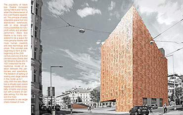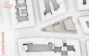 The main objective was to improve public space of Letenské square which is a significant location of Prague 7, Holešovice. Current neglected character of the space, which is defined by traffic junction and unappealing one-storey structure of a supermarket, was virtually asking for a new dominating structure. Out of several possible functions, theatre was chosen. Not only because this type of structure was missing in Holešovice, but because it has a potential to become functional and aesthetic focal point of public space.