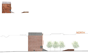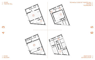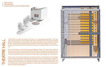 The interior of the structure is handled with maximal variability of use in mind, with unusual element of the big scale window of the theatre hall which opens new possibilities. Uncanny element is location of summer stage on top of the roof. The levelled seating platform is the only part of the structure which goes higher than cornices of the neighbouring buildings and thus becomes attracting feature of the theatre itself as the passers-by look up to the lively roof scene.