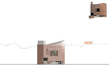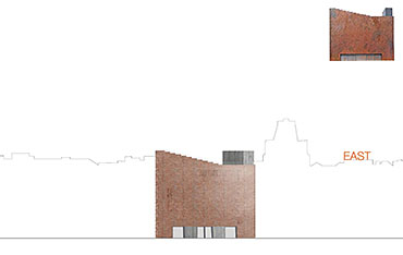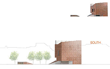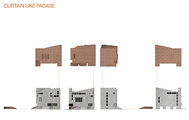 A form of a compact building was chosen. Although it is of same scale as neighbouring buildings, it still is distinct enough to attract attention. The need of natural light in some of the spaces and at the same time pursuit of the perfect homogenous edifice led to the selection of double-skin facade. The inner skin of the building is then covered with semi-transparent skin made of perforated copper plates, which enables natural light and fresh air coming in. Of this concept only few differ: parterre with uncovered glassed-in theatre café, direct entrance into the foyer on second floor and a big scale window of theatre hall with closeable panel.