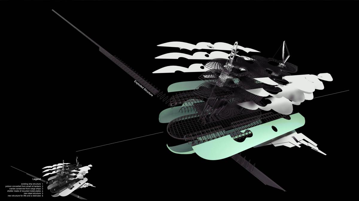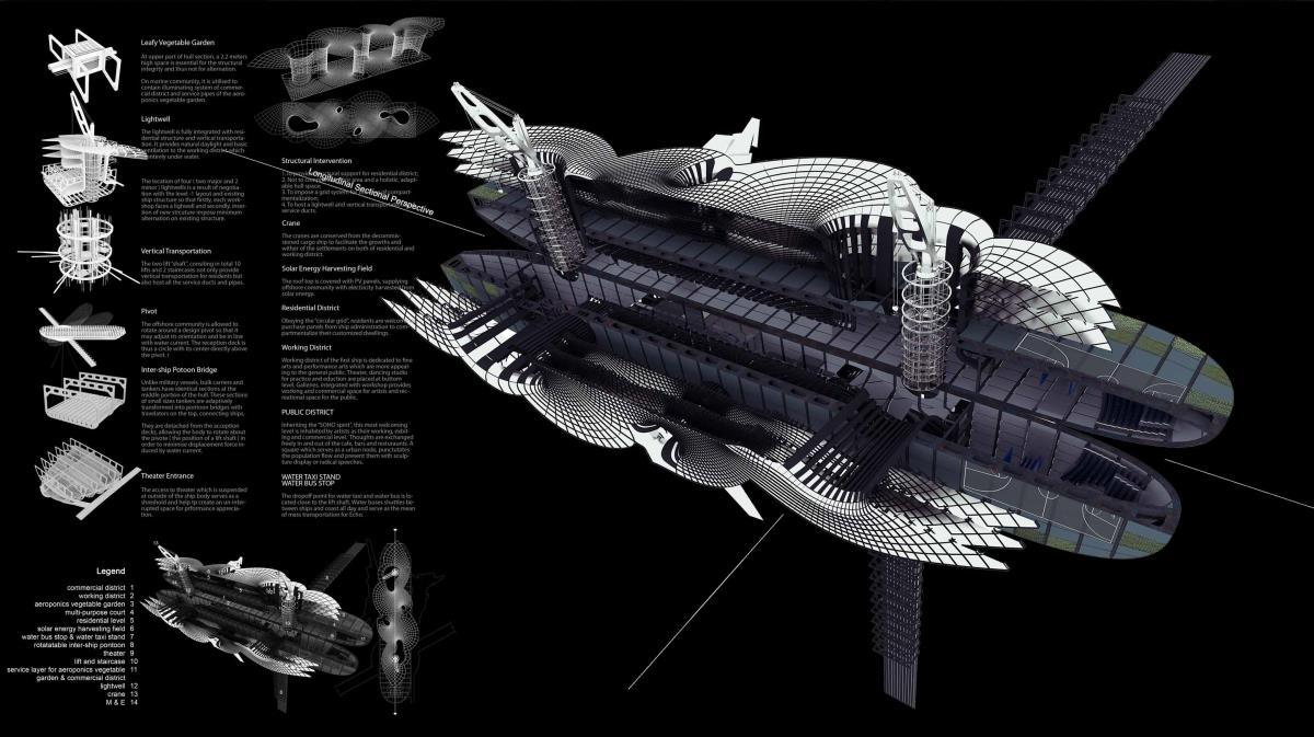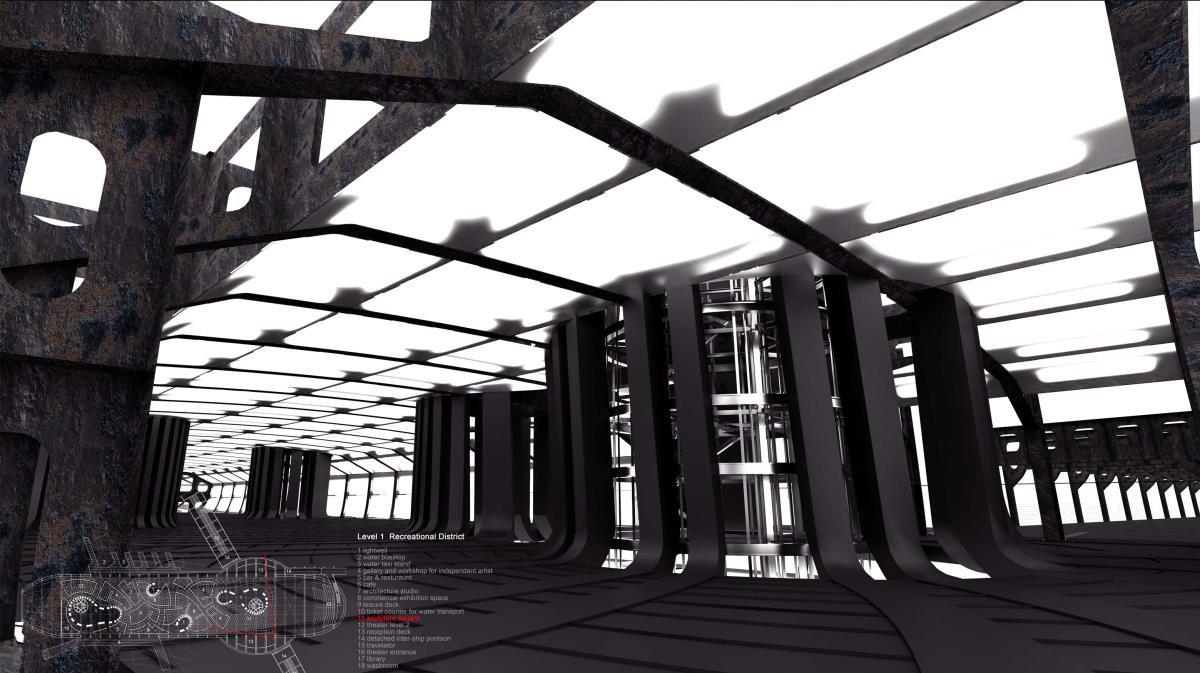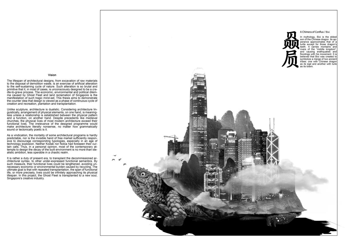 It is rather a duty of present era, to transplant the decommissioned architectural syntax, to other under-expressed functional semantics. By such measure, their functional lives could be lengthened, avoiding unnecessary economic or environmental burden caused by recycling. The ultimate goal is that with repeated transplantation, the span of functional life, or more precisely, lives could be infinitely approaching its physical lifespan. In this project, the Ghost Fleet is transplanted to a new soul, Singapore’s creative industry.
