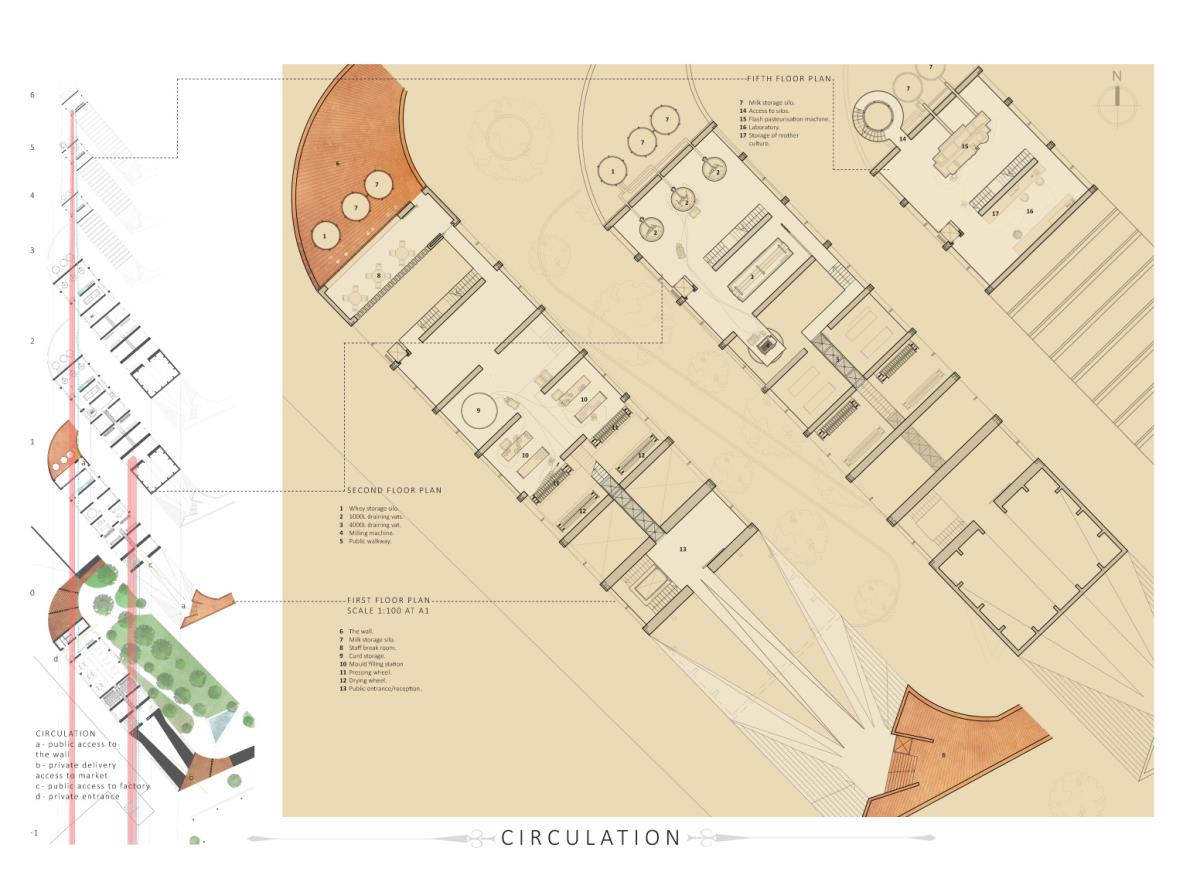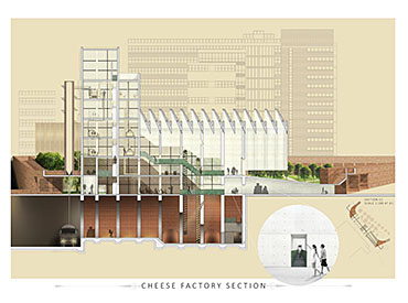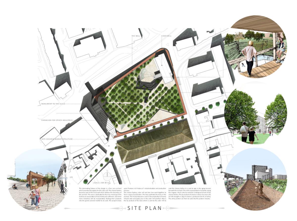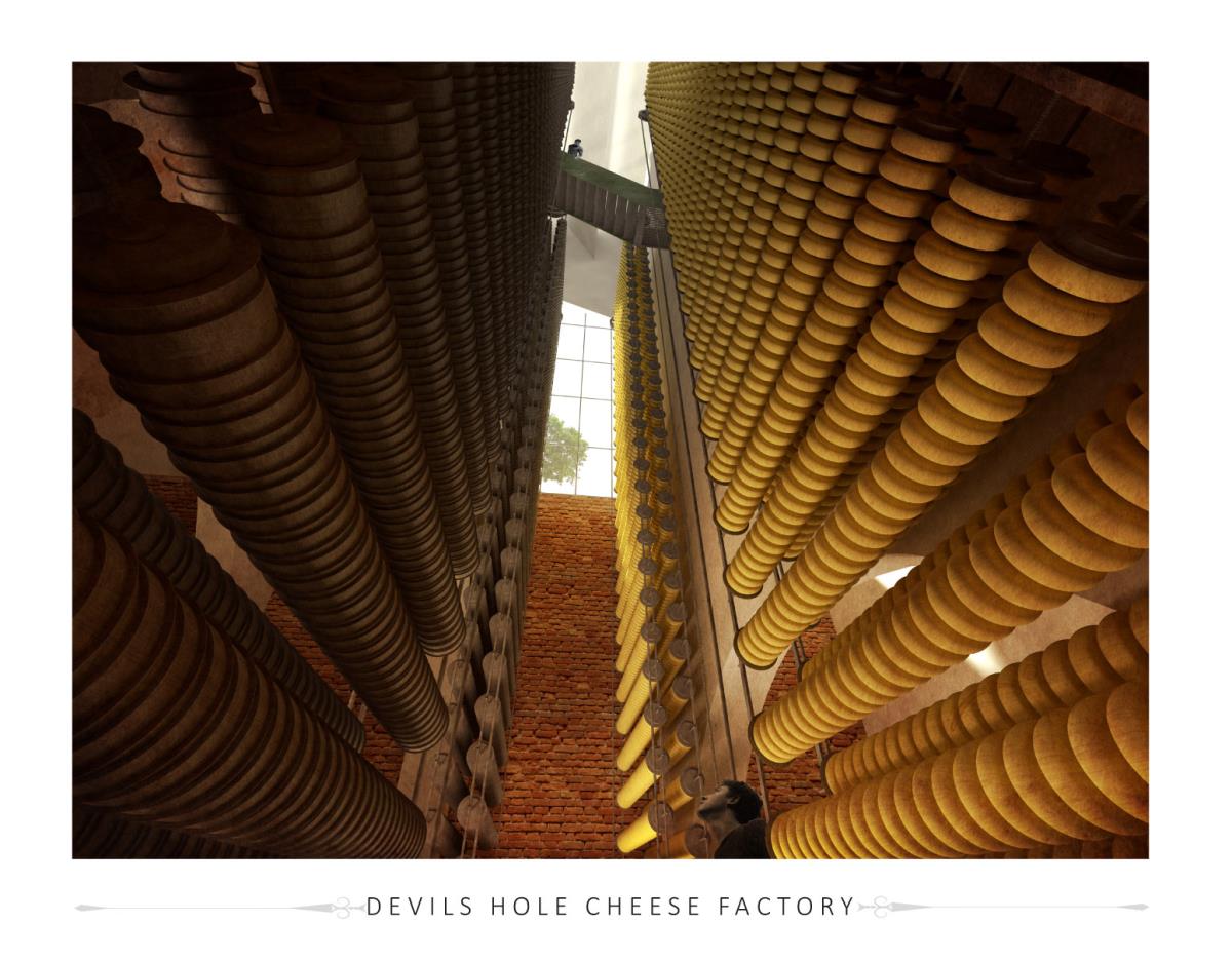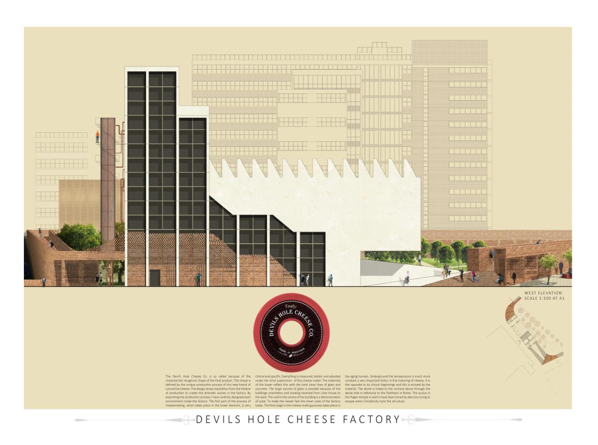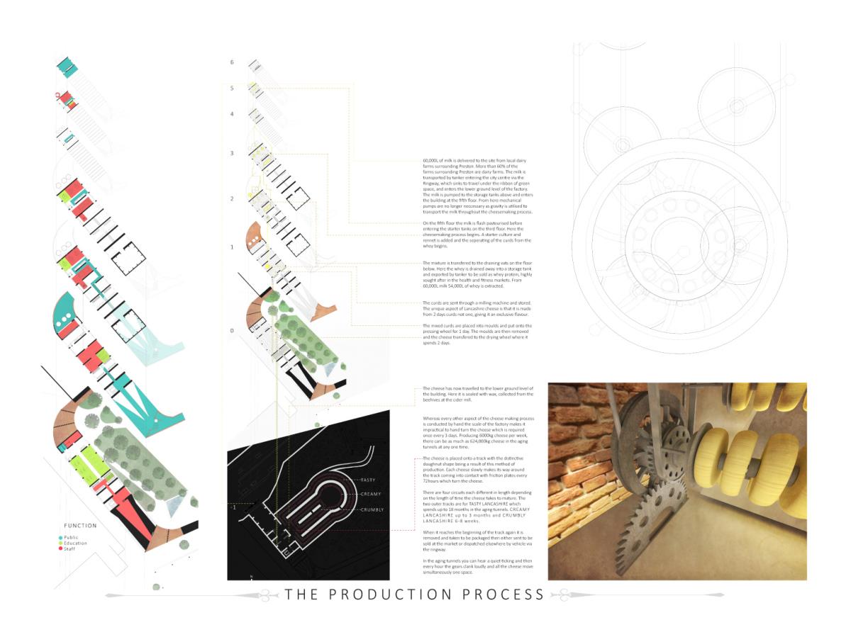 Devil’s Hole Cheese Factory Part 1 Project 2014 Kate Nicholson University of Central Lancashire | UK The Devil’s Hole Cheese Factory will reinvent the process of production as a theatrical performance, bringing industry back into the heart of the city centre of Preston. There is a growing disconnection between people and food. The age of industrialisation has pushed food production out of the city so that people no longer know where their food comes from or how it has been prepared. The project began with a master planning exercise at the heart of the city. For the design of the model city I developed a manifesto outlining the key principles of urban planning and applied each of these points to the city of Preston. The proposal is a conceptualisation of the Georgian square which is inherently more functional, utilising local food production and promoting industry in the city centre. The proposed square is an apple orchard defined by a brick structure, drawing on the idea of the traditional English walled garden. The area is dedicated to the true meaning of the Guild as an association of merchants and craftsmen. The wall is made up of a series of brick planes. Over time more industries and crafts will be incorporated, gradually filling in the spaces in the wall until the orchard is a hive of activity with each craftsman feeding their products into the grand covered market to be sold. The orchard serves as a meeting place for the Guild. The materiality of the wall is red brick, the symbol of industrialisation. Cheese making in Lancashire in the early 1900s was a big business, with monthly cheese fairs held in Preston under the covered market structure, though cheese making can be traced as far back as the 12th century when King John granted Preston a royal charter to host an annual cheese fair. The detailed study of the cheese making production process led me to analyse the factory aesthetic and how the factory as a building type has developed since 1769 when Richard Arkwright invented the water frame in Preston. This invention became the core of the prototype for the modern factory. Tutor(s) Laura Sherliker