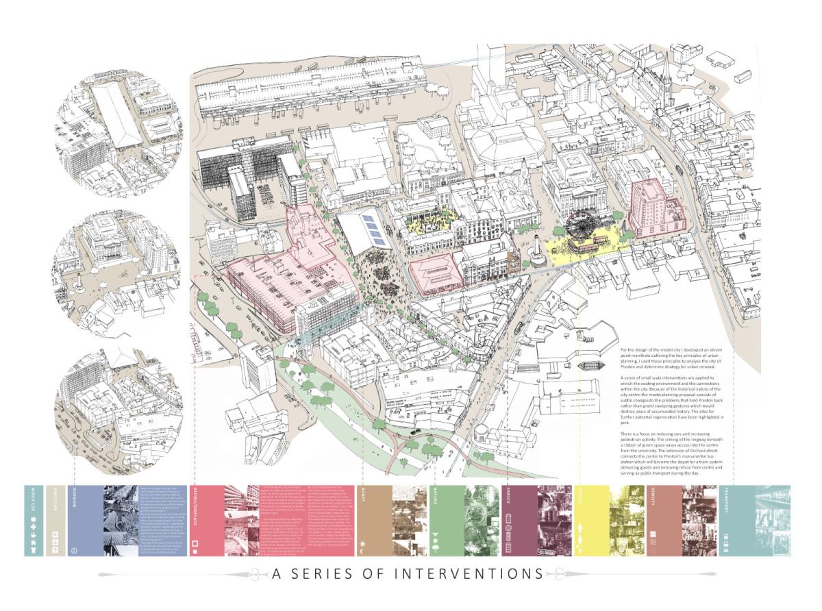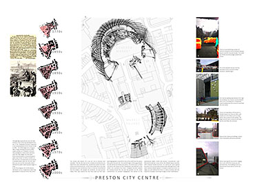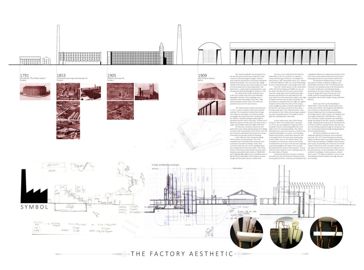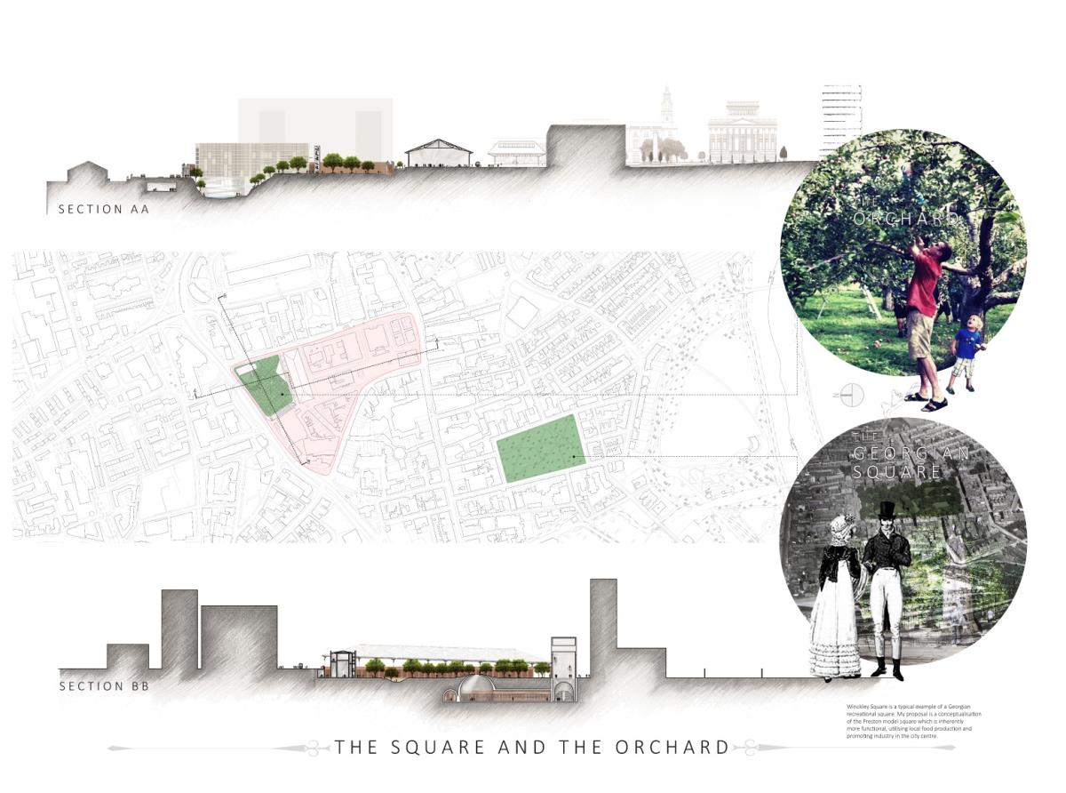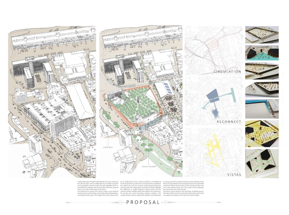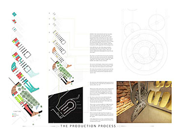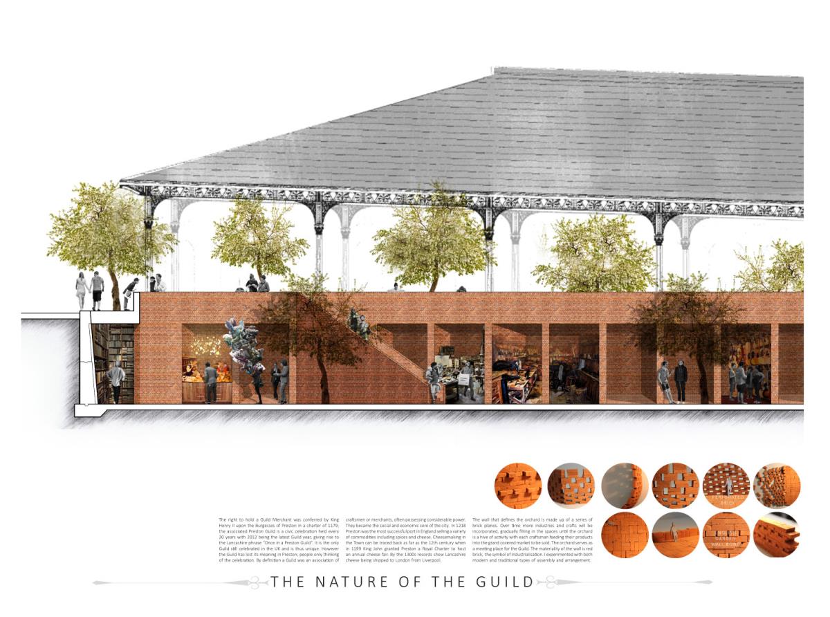 Devil’s Hole Cheese Factory Part 1 Project 2014 Kate Nicholson University of Central Lancashire | UK The Devil’s Hole Cheese Factory will reinvent the process of production as a theatrical performance, bringing industry back into the heart of the city centre of Preston. There is a growing disconnection between people and food. The age of industrialisation has pushed food production out of the city so that people no longer know where their food comes from or how it has been prepared. The project began with a master planning exercise at the heart of the city. For the design of the model city I developed a manifesto outlining the key principles of urban planning and applied each of these points to the city of Preston. The proposal is a conceptualisation of the Georgian square which is inherently more functional, utilising local food production and promoting industry in the city centre. The proposed square is an apple orchard defined by a brick structure, drawing on the idea of the traditional English walled garden. The area is dedicated to the true meaning of the Guild as an association of merchants and craftsmen. The wall is made up of a series of brick planes. Over time more industries and crafts will be incorporated, gradually filling in the spaces in the wall until the orchard is a hive of activity with each craftsman feeding their products into the grand covered market to be sold. The orchard serves as a meeting place for the Guild. The materiality of the wall is red brick, the symbol of industrialisation. Cheese making in Lancashire in the early 1900s was a big business, with monthly cheese fairs held in Preston under the covered market structure, though cheese making can be traced as far back as the 12th century when King John granted Preston a royal charter to host an annual cheese fair. The detailed study of the cheese making production process led me to analyse the factory aesthetic and how the factory as a building type has developed since 1769 when Richard Arkwright invented the water frame in Preston. This invention became the core of the prototype for the modern factory. Tutor(s) Laura Sherliker