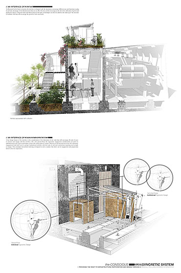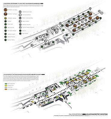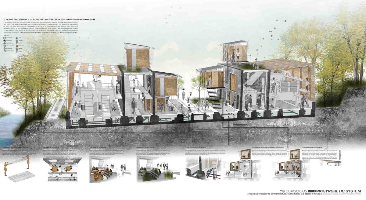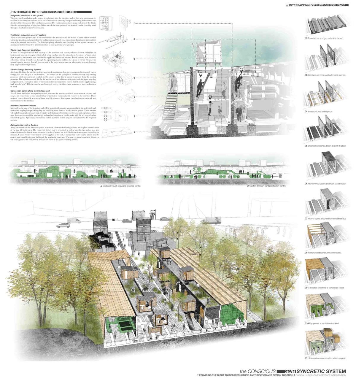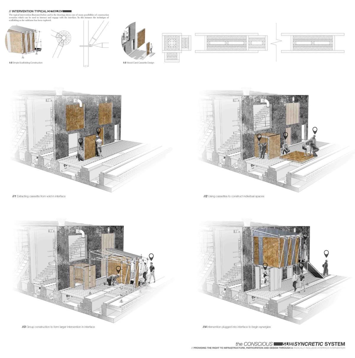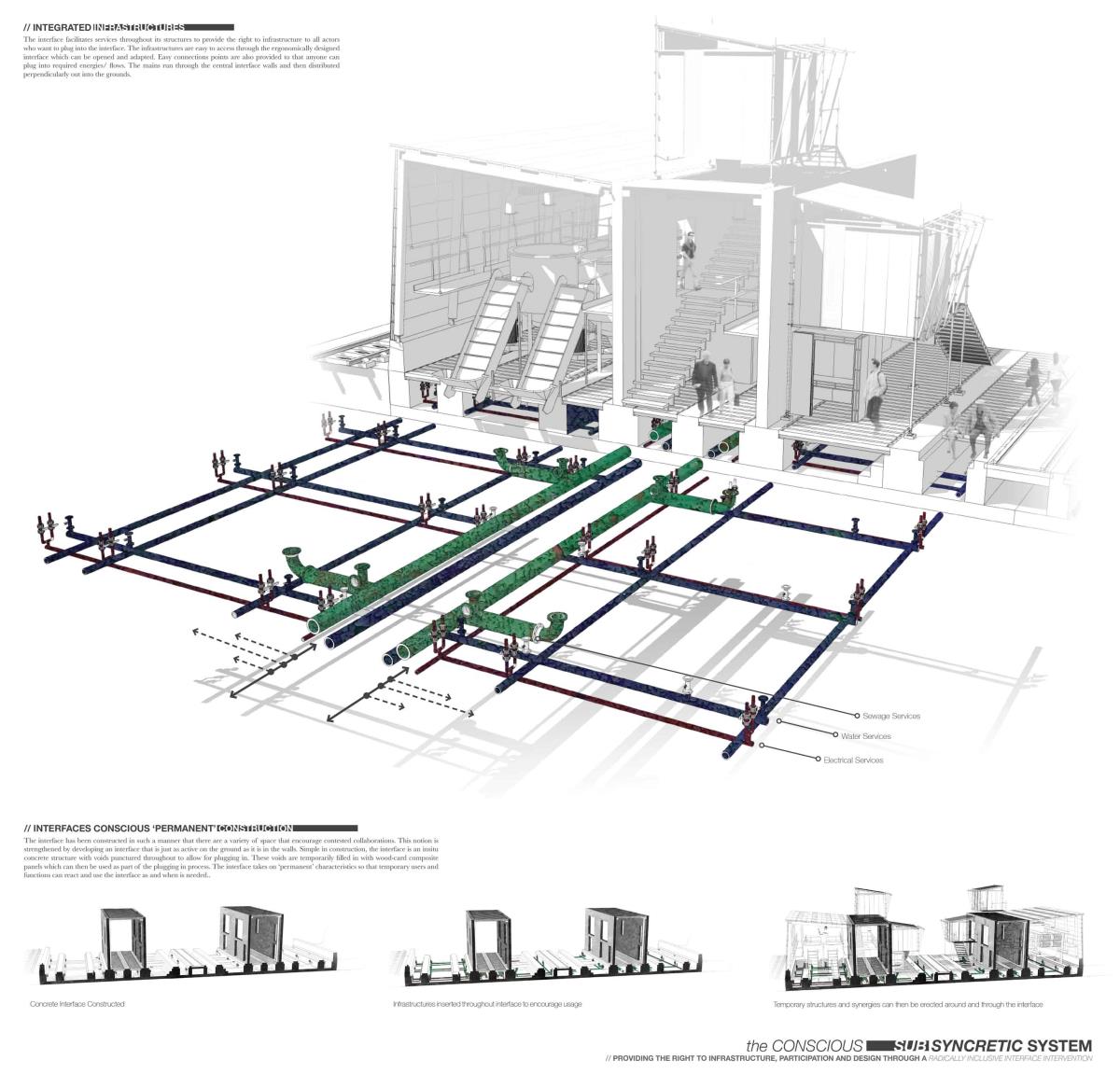 Taking the contextual issues of boundaries, the building intervention is designed as an interface, where it acts as a porous boundary encouraging interaction and negotiation of space and design. In response to the key contextual issue of infrastructure, the interface facilitates the infrastructures required to encourage interaction and design to all users.