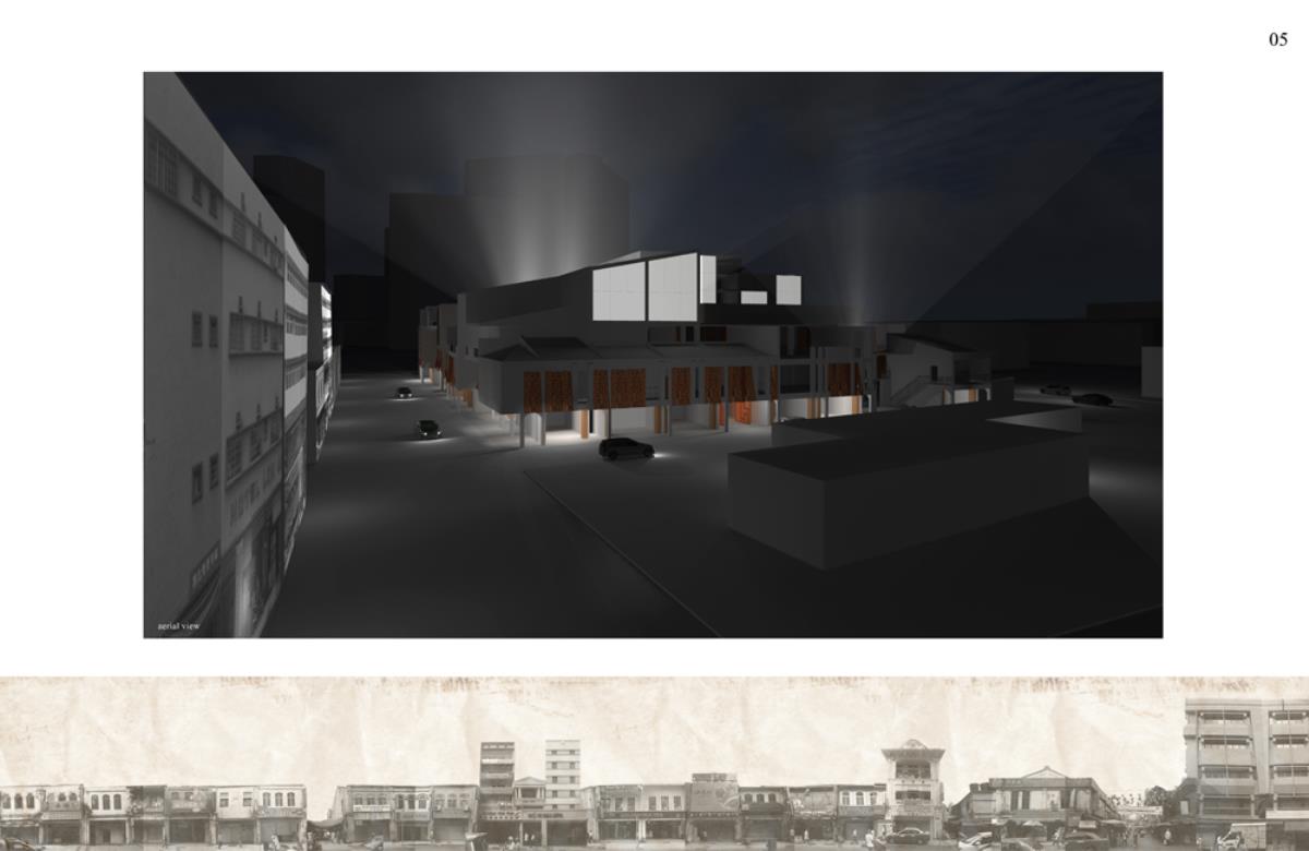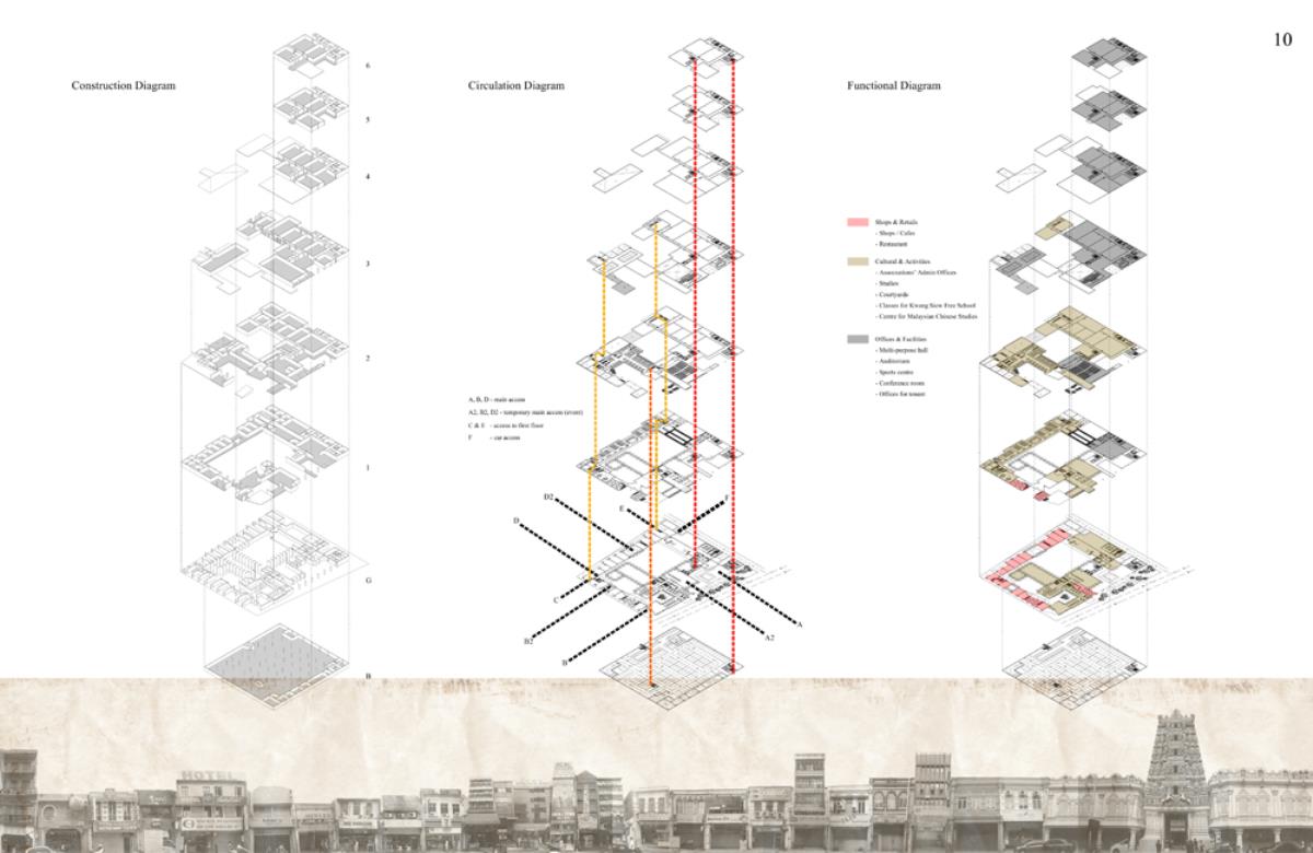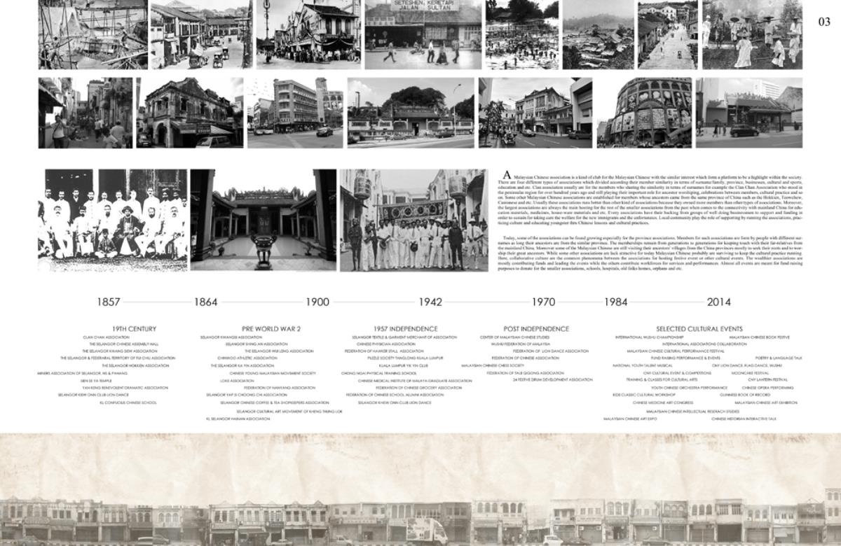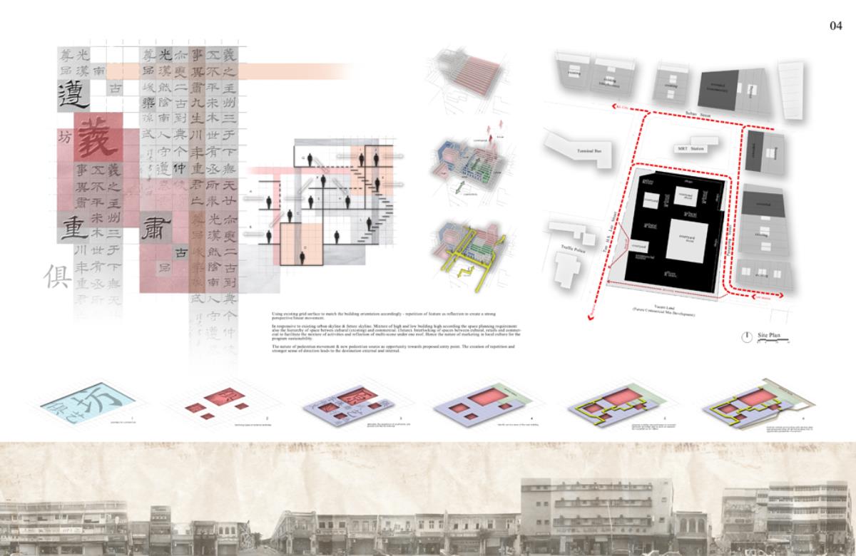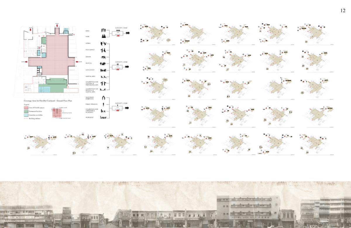Cultural Hub for The Malaysian Chinese Federation of Associations Part 2 Project 2014 Jin Yu Lee University of Malaya | Malaysia A referral of civic narrative introducing the space intervention to portrait the original lifestyle and the characteristic of the original community. Associations by Malaysian Chinese are major influence to growing city. Today, lifestyles and cultural movement are remaining as it’s significant to stand as KL Chinatown. This thesis applied poetic imagination, though not in order to create poetic architecture but making certain kind of architecture that could emanate a sense of formal poetry. The place is for Chinese associations; the unity, the cultural movement and integrations which one could approach the celebration of community and event in social and civic way. The overall is a mirror box reflects the urban skyline and characteristic of the community. Expressing via interlocking between cultural and commercial spaces towards exotic and sophistication of KL Chinatown’s mixing urban skyline.The concept embracement usage of courtyards. Complexity of spaces from usages, confusing yet systematic flowage and division allows the individual to experience the building through subtleties of design decisions he carefully makes, choreographing a performance of such through both the material composition and the layout of design and surrounding landscape. The external façade is a humble expression matches existing shop houses for small trading businesses; small offices for commercial and associations’ activities at upper floors. The façade and external zoning, creating repetition by division of spaces for trades. Partially meant to be commercial offices, these offices are rented to generate income. Here, existing community rebuilt their existing lots from 2 storey shop houses into 8-10 storeys for the same purpose. A reflection towards series of spacing admits some value in mystification, labyrinth, or surprise in the environment that makes the setting remarkably significant.Special study is the flexible panels within courtyards via space integrations. This system provides dynamic spaces to suits different proportions and scale of events. Multiple spaces up to approximately 30 layouts from 1 to 6 types of spaces in order to run several events with different scales and flowage at the same time. Showcase characteristic of the community in utilizing spaces for different purposes that makes the building stood in fully practical, functional, memorable and essential. Tutor(s) Ezlina Adnan Helena Aman Hashim Take Bane Lim Teng Ngiom Lim Saari Omar
