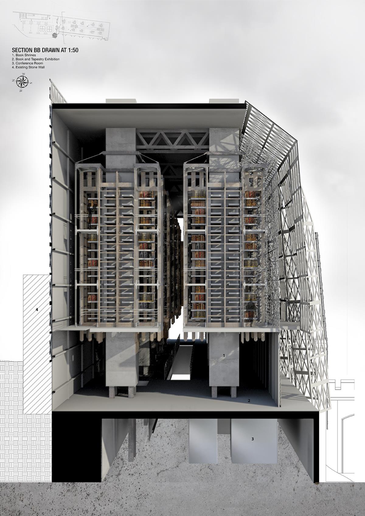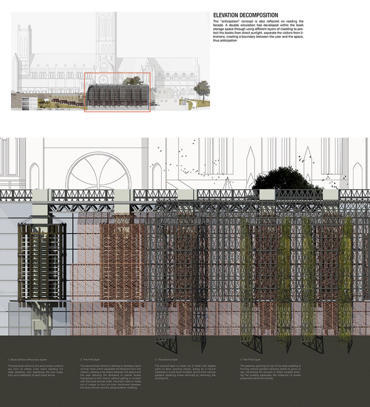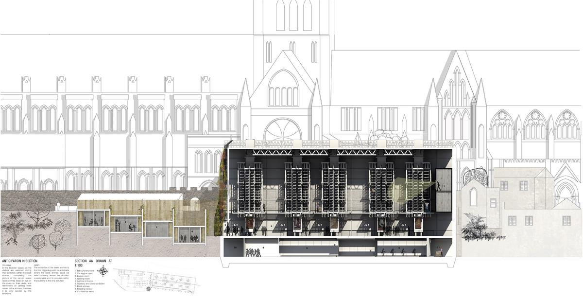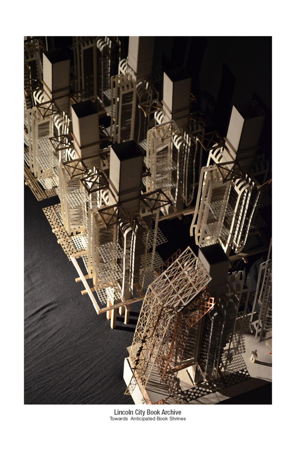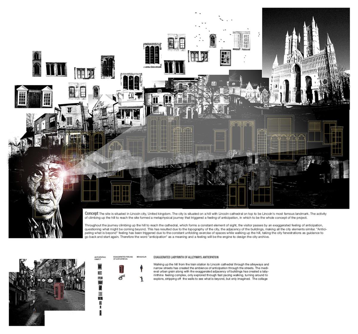 Lincoln City Book Archive Part 1 Project 2014 Sara Hesham De Montfort University | UK Lincoln city book archive is designed for preserving and storing religious books and manuscripts where scholars can pilgrim to attain knowledge. It is also can be accessed by the public for reference and attending lectures. The project builds upon a scheme of preservation and served spaces, where it is mainly applied in the 'Book Shrine' part of the building, where the space is only served by the librarians, with restriction for the public.The site is situated in Lincoln city, United kingdom. The city is on a hill with Lincoln cathedral on top to be Lincoln's most famous landmark. The activity of climbing up the hill to reach the site formed a metaphysical journey that triggered a feeling of anticipation, in which to be the whole concept of the project. The concept has developed from experiencing the topography of the city, the urban fabric and city fenestrations making all the city elements feel similar. Due to the unfolding exercise of spaces ,while walking up the hill, has triggered "Anticipating what is beyond", leaving the visitor uncertain with only one solution which is to explore the spaces more. Therefore the word "anticipation" as a meaning and a feeling will be the engine to design the city archive.The project manifests the literature piece "Unpacking My Library" by Walter Benjamin, in conjunction with a rigorous study of archive typologies and using the monastery of Mont Saint Michel as a main precedent to apply 'anticipation' within the journey in the spaces leading to the book shrines. While existing as a polemical entity, the project is an example of "served spaces" where the librarian are only allowed to be in contact with the shrines, serving the public where as the shrines would only be observed from far, creating an uncertain connection between the subject and the object, thus anticipation. Tutor(s) Kyle Henderson