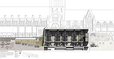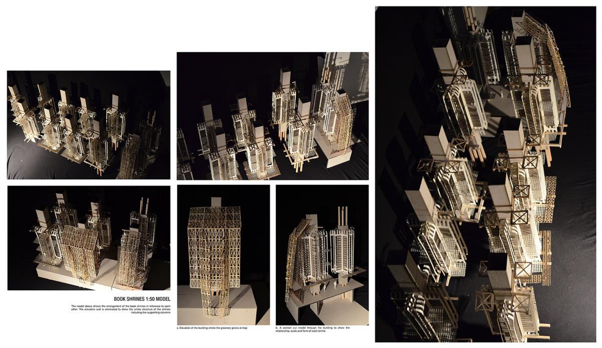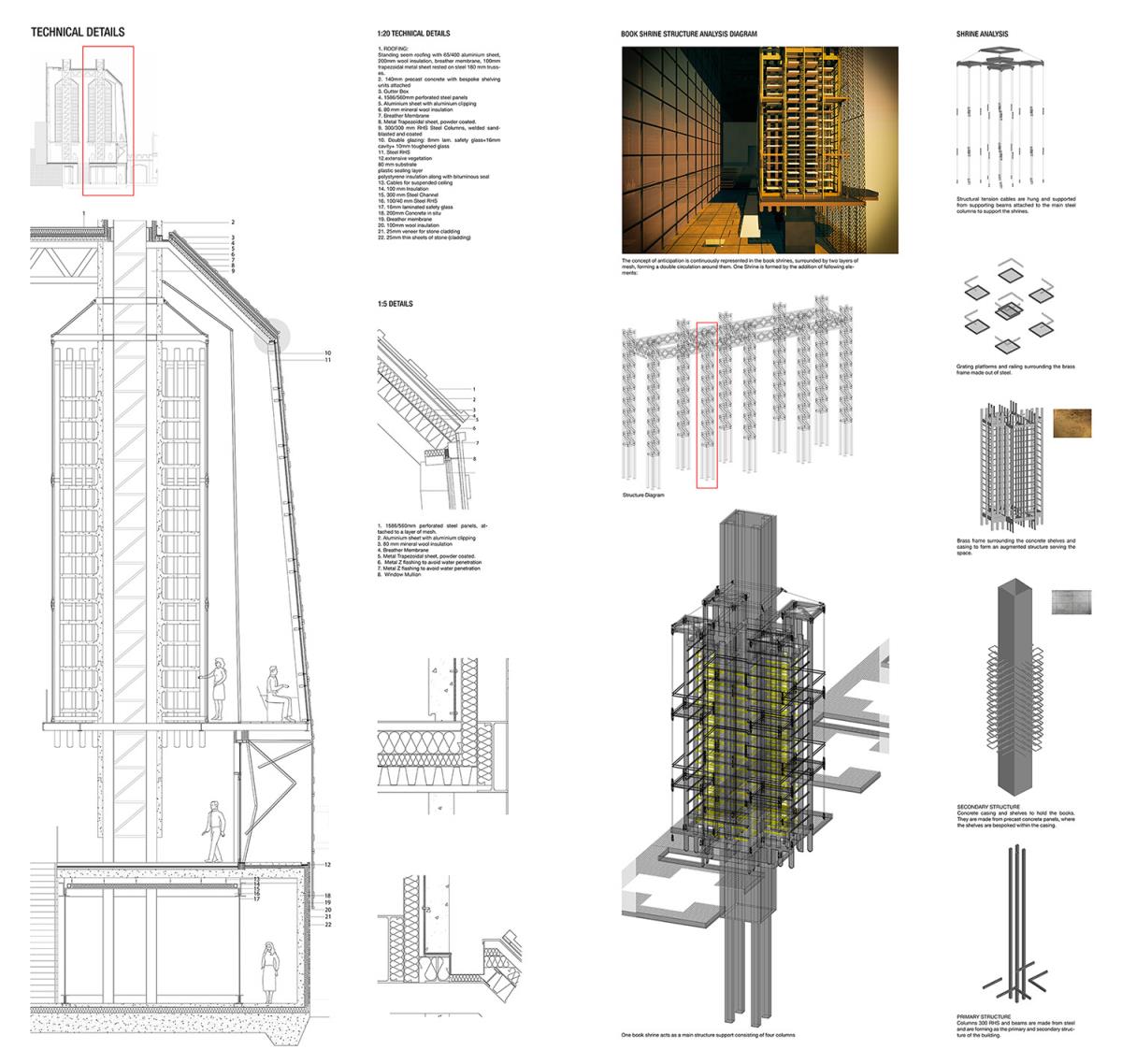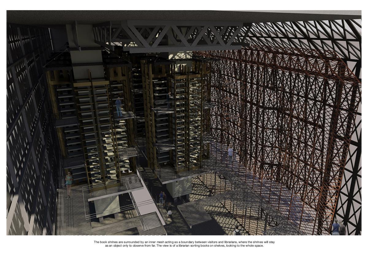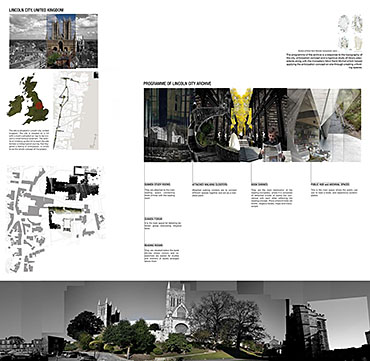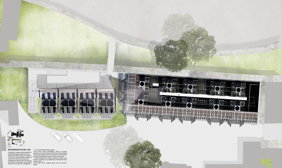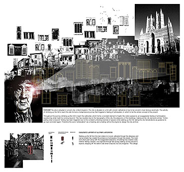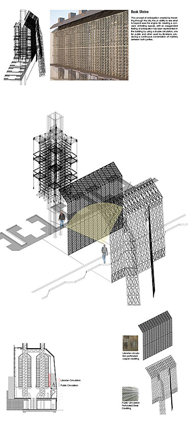 Lincoln City Book Archive Part 1 Project 2014 Sara Hesham De Montfort University | UK Lincoln city book archive is designed for preserving and storing religious books and manuscripts where scholars can pilgrim to attain knowledge. It is also can be accessed by the public for reference and attending lectures. The project builds upon a scheme of preservation and served spaces, where it is mainly applied in the 'Book Shrine' part of the building, where the space is only served by the librarians, with restriction for the public.The site is situated in Lincoln city, United kingdom. The city is on a hill with Lincoln cathedral on top to be Lincoln's most famous landmark. The activity of climbing up the hill to reach the site formed a metaphysical journey that triggered a feeling of anticipation, in which to be the whole concept of the project. The concept has developed from experiencing the topography of the city, the urban fabric and city fenestrations making all the city elements feel similar. Due to the unfolding exercise of spaces ,while walking up the hill, has triggered "Anticipating what is beyond", leaving the visitor uncertain with only one solution which is to explore the spaces more. Therefore the word "anticipation" as a meaning and a feeling will be the engine to design the city archive.The project manifests the literature piece "Unpacking My Library" by Walter Benjamin, in conjunction with a rigorous study of archive typologies and using the monastery of Mont Saint Michel as a main precedent to apply 'anticipation' within the journey in the spaces leading to the book shrines. While existing as a polemical entity, the project is an example of "served spaces" where the librarian are only allowed to be in contact with the shrines, serving the public where as the shrines would only be observed from far, creating an uncertain connection between the subject and the object, thus anticipation. Tutor(s) Kyle Henderson
