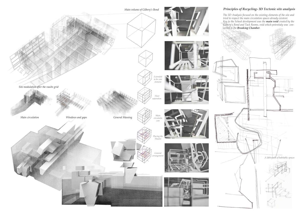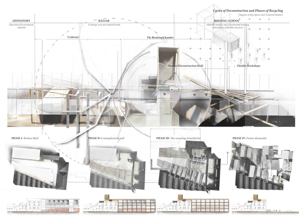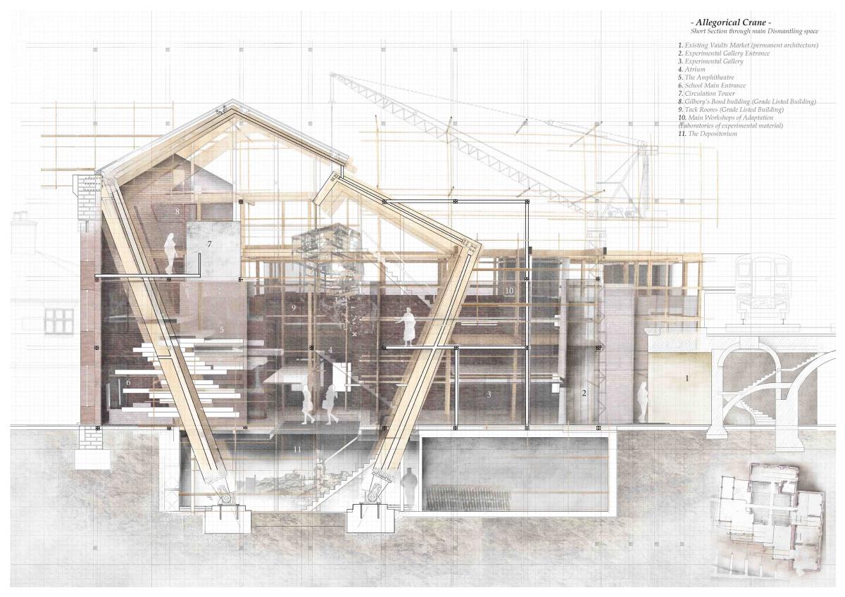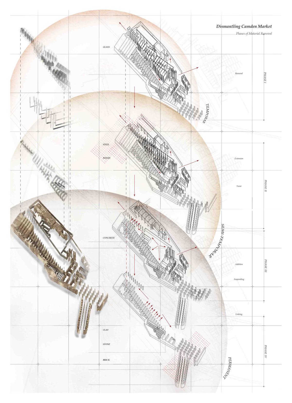 The School of Recycling & Experimental Building -Cycles of Architectural Re-Configuration- Part 1 Project 2014 Andreea-Laura Nica University of Westminster London | UK Most works of architecture are considered to be ‘finished’ upon the completion of building works. This however does not take into account issues of mobility and adaptability which are prerequisites for sustainability in a constantly changing environment. The concept of Recycling, which involves occupation, subsequent alterations, decoration and personalisation by users are key considerations for a building’s prolonged existence. Hence the ideas of spatial evolution and modification should be prioritised over demolition and ruin. This is especially important in London where land scarcity necessitates the need to deliver reusable spaces.The interest in recycling, building materials and flexible spaces are explored in the School of Recycling and Experimental Building, located in Camden Market. This site has been chosen for its strong relations to trading. The proposed scheme presents a six-stage programme, which sees the School as an educational platform that celebrates the notion of a recycling facility. The design proposal is composed around the notion of an ephemeral versus a permanent architecture. The School expands on the idea of a bazaar which records the surrounding activities in order to establish the development of future spatial requirements and programs. One key feature of the School is the Breaking Chamber, which is designed as an allegorical crane. This structure is placed in the middle of the proposal and is responsible for dismantling and reassembling the recycled construction materials. By accommodating the disassembling process and by re-considering the boundaries between private and public space, the historically rich Gilbey’s Bond will function dually as a theatre. This labyrinth of habitable spaces accommodates the construction courses in the School which include architectural workshops for material experimentation, galleries of recycled objects and the temporary depository. By enhancing the apparent layered and multi-faceted qualities of the existing site, the project is a design for disassembly and celebrates ideas of change and future adaptability for an improved built environment. The building platform is continuously shifting and adapting to new conditions, and the potential for new spaces and use are integral to the architecture. Tutor(s) Constance Lau
