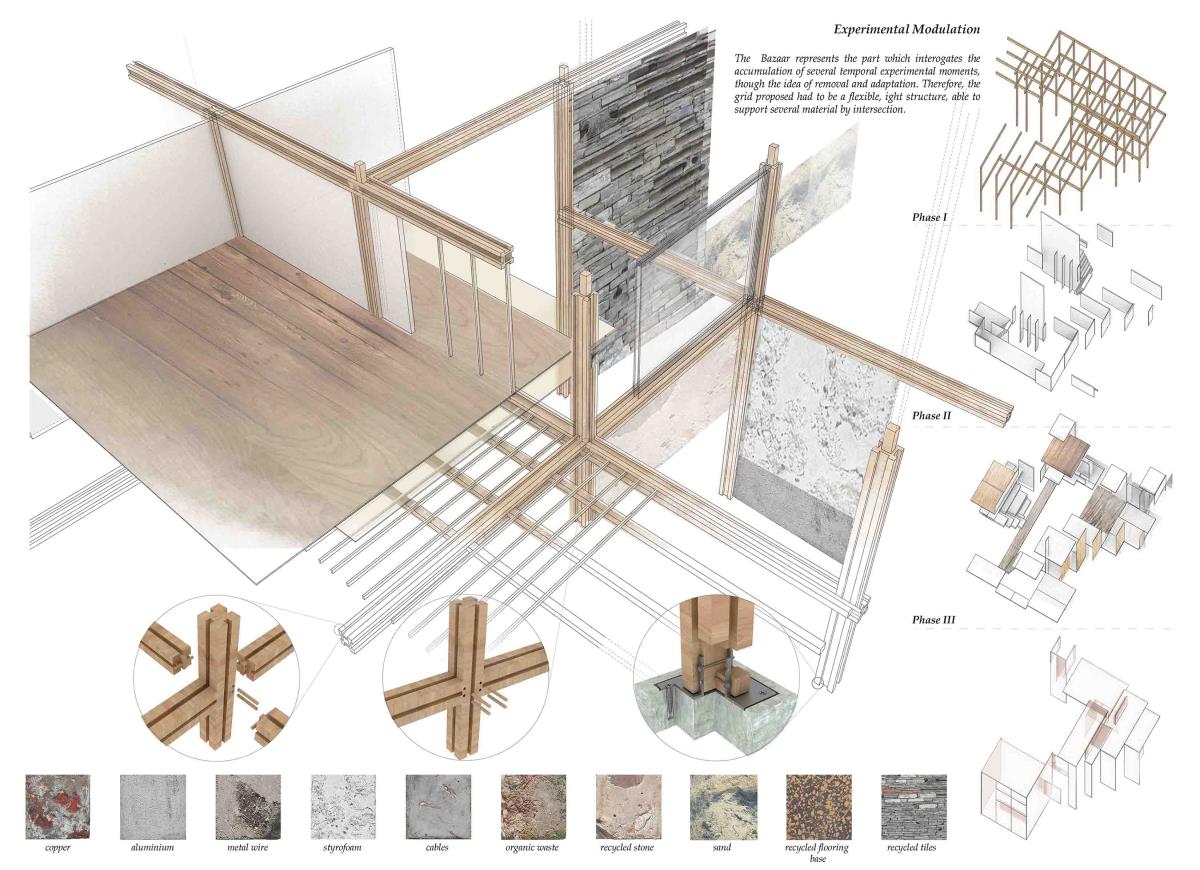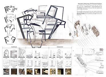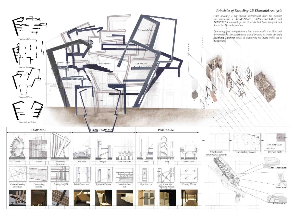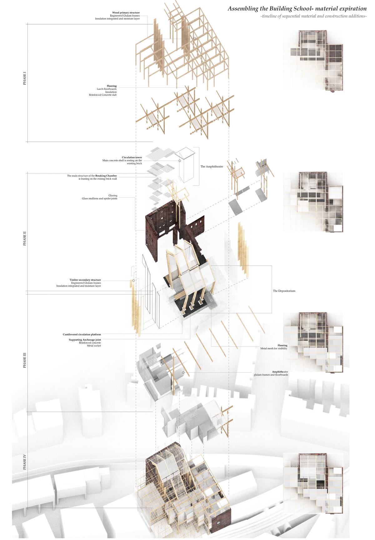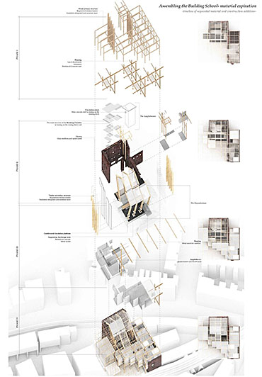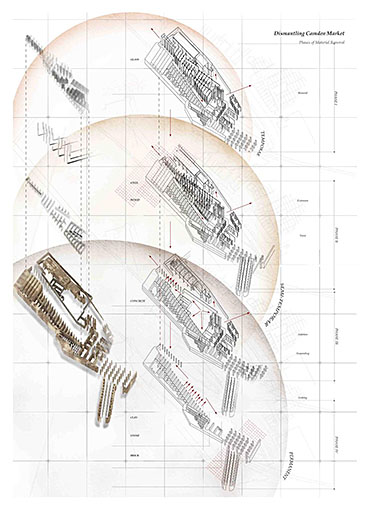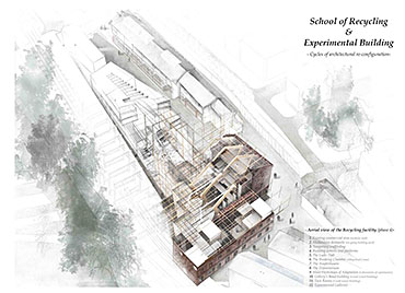 The School of Recycling & Experimental Building -Cycles of Architectural Re-Configuration- Part 1 Project 2014 Andreea-Laura Nica University of Westminster London | UK Most works of architecture are considered to be ‘finished’ upon the completion of building works. This however does not take into account issues of mobility and adaptability which are prerequisites for sustainability in a constantly changing environment. The concept of Recycling, which involves occupation, subsequent alterations, decoration and personalisation by users are key considerations for a building’s prolonged existence. Hence the ideas of spatial evolution and modification should be prioritised over demolition and ruin. This is especially important in London where land scarcity necessitates the need to deliver reusable spaces.The interest in recycling, building materials and flexible spaces are explored in the School of Recycling and Experimental Building, located in Camden Market. This site has been chosen for its strong relations to trading. The proposed scheme presents a six-stage programme, which sees the School as an educational platform that celebrates the notion of a recycling facility. The design proposal is composed around the notion of an ephemeral versus a permanent architecture. The School expands on the idea of a bazaar which records the surrounding activities in order to establish the development of future spatial requirements and programs. One key feature of the School is the Breaking Chamber, which is designed as an allegorical crane. This structure is placed in the middle of the proposal and is responsible for dismantling and reassembling the recycled construction materials. By accommodating the disassembling process and by re-considering the boundaries between private and public space, the historically rich Gilbey’s Bond will function dually as a theatre. This labyrinth of habitable spaces accommodates the construction courses in the School which include architectural workshops for material experimentation, galleries of recycled objects and the temporary depository. By enhancing the apparent layered and multi-faceted qualities of the existing site, the project is a design for disassembly and celebrates ideas of change and future adaptability for an improved built environment. The building platform is continuously shifting and adapting to new conditions, and the potential for new spaces and use are integral to the architecture. Tutor(s) Constance Lau