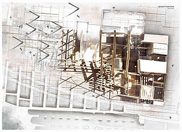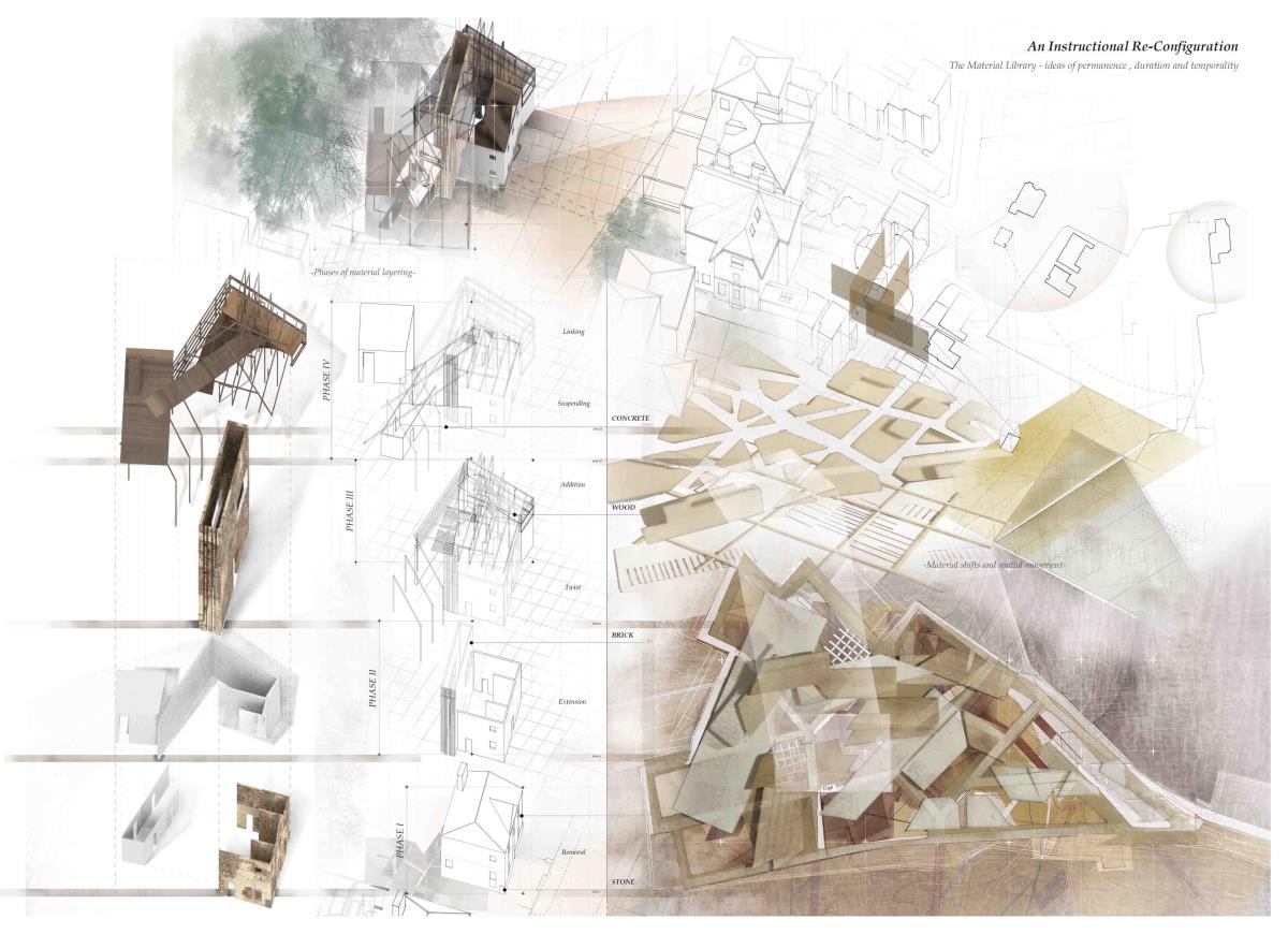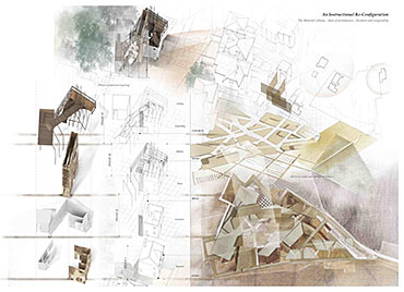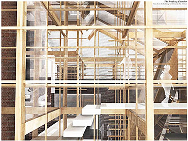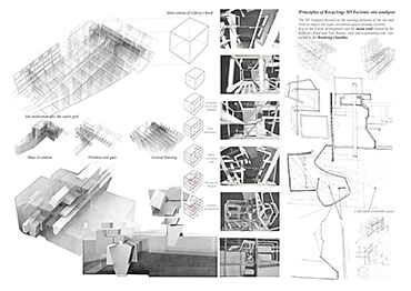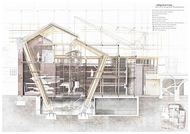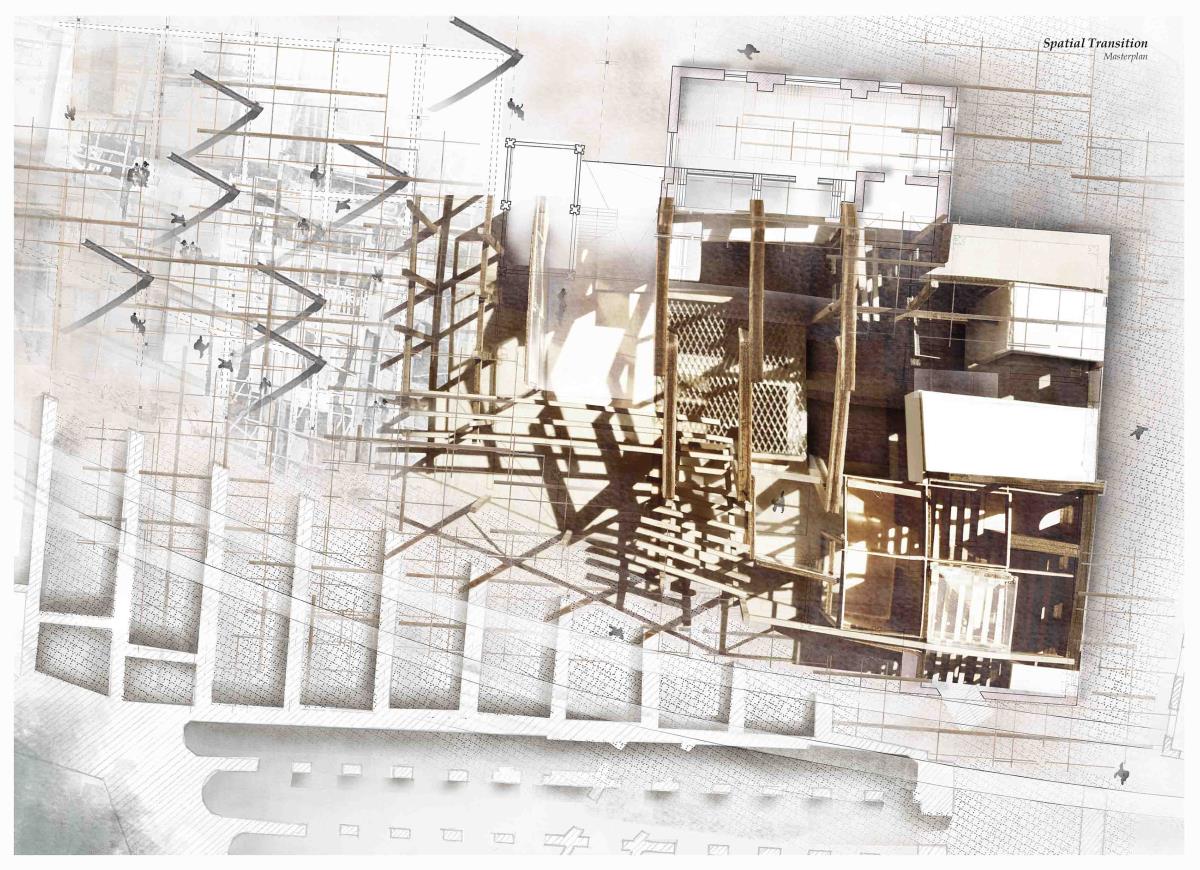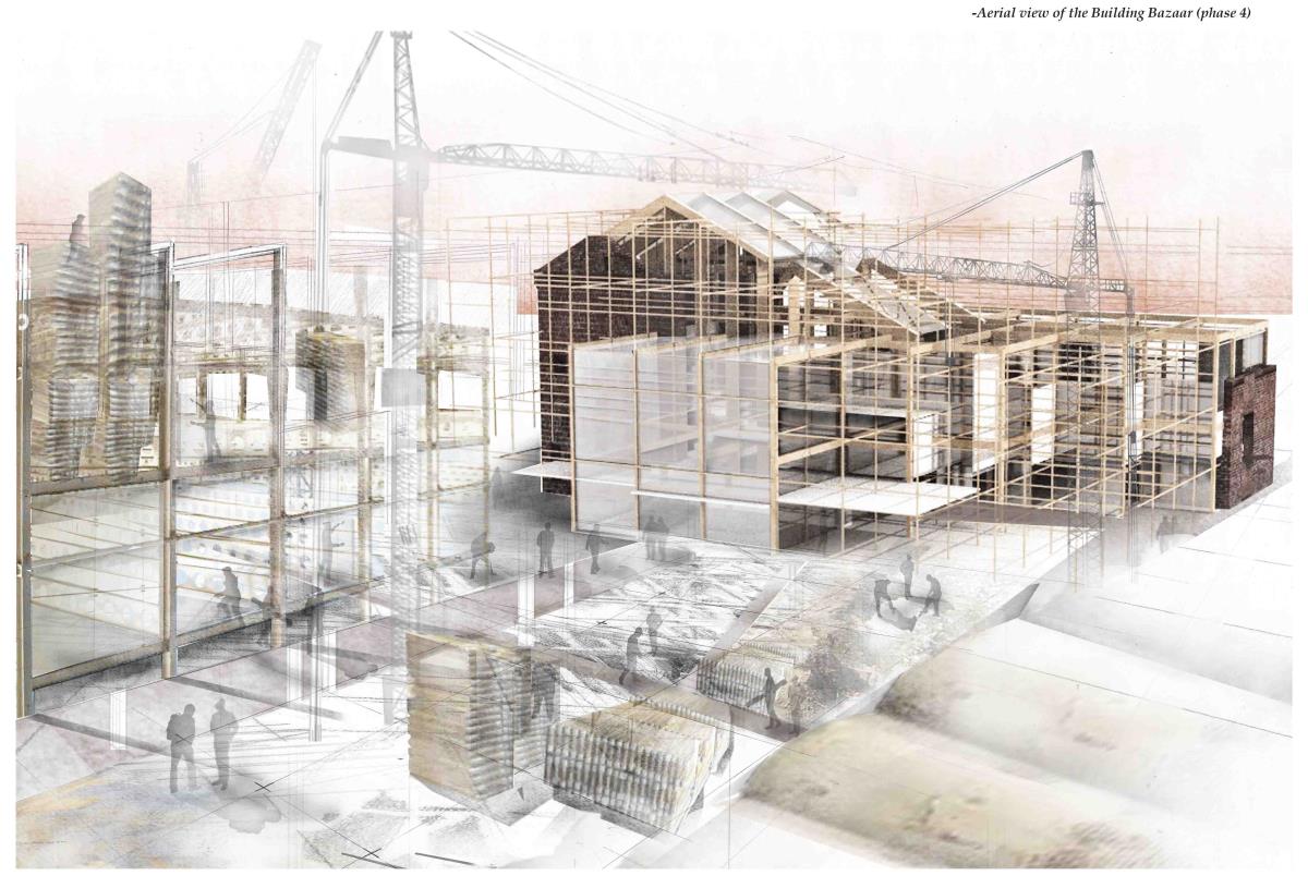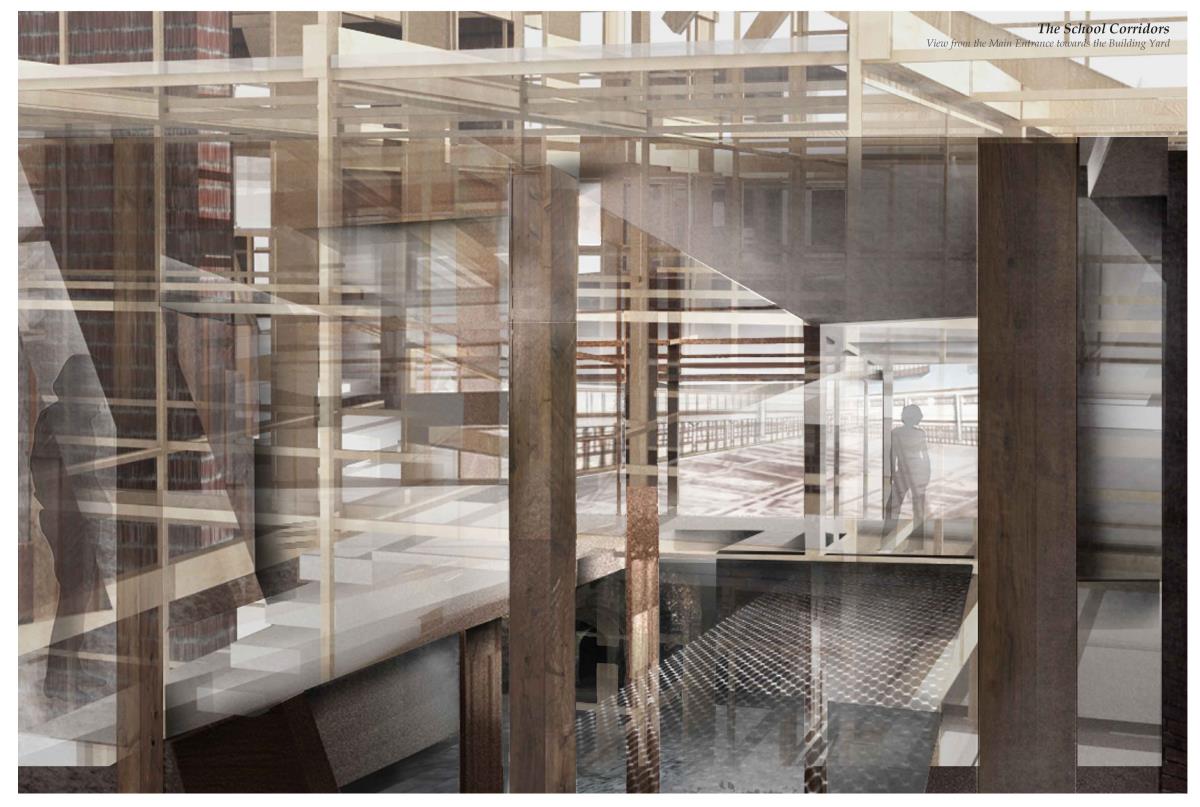 The School of Recycling & Experimental Building -Cycles of Architectural Re-Configuration- Part 1 Project 2014 Andreea-Laura Nica University of Westminster London | UK Most works of architecture are considered to be ‘finished’ upon the completion of building works. This however does not take into account issues of mobility and adaptability which are prerequisites for sustainability in a constantly changing environment. The concept of Recycling, which involves occupation, subsequent alterations, decoration and personalisation by users are key considerations for a building’s prolonged existence. Hence the ideas of spatial evolution and modification should be prioritised over demolition and ruin. This is especially important in London where land scarcity necessitates the need to deliver reusable spaces.The interest in recycling, building materials and flexible spaces are explored in the School of Recycling and Experimental Building, located in Camden Market. This site has been chosen for its strong relations to trading. The proposed scheme presents a six-stage programme, which sees the School as an educational platform that celebrates the notion of a recycling facility. The design proposal is composed around the notion of an ephemeral versus a permanent architecture. The School expands on the idea of a bazaar which records the surrounding activities in order to establish the development of future spatial requirements and programs. One key feature of the School is the Breaking Chamber, which is designed as an allegorical crane. This structure is placed in the middle of the proposal and is responsible for dismantling and reassembling the recycled construction materials. By accommodating the disassembling process and by re-considering the boundaries between private and public space, the historically rich Gilbey’s Bond will function dually as a theatre. This labyrinth of habitable spaces accommodates the construction courses in the School which include architectural workshops for material experimentation, galleries of recycled objects and the temporary depository. By enhancing the apparent layered and multi-faceted qualities of the existing site, the project is a design for disassembly and celebrates ideas of change and future adaptability for an improved built environment. The building platform is continuously shifting and adapting to new conditions, and the potential for new spaces and use are integral to the architecture. Tutor(s) Constance Lau