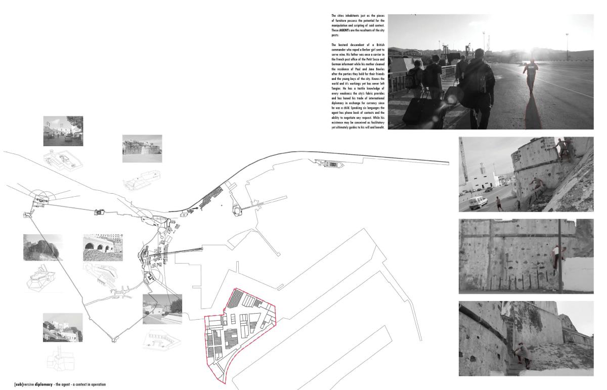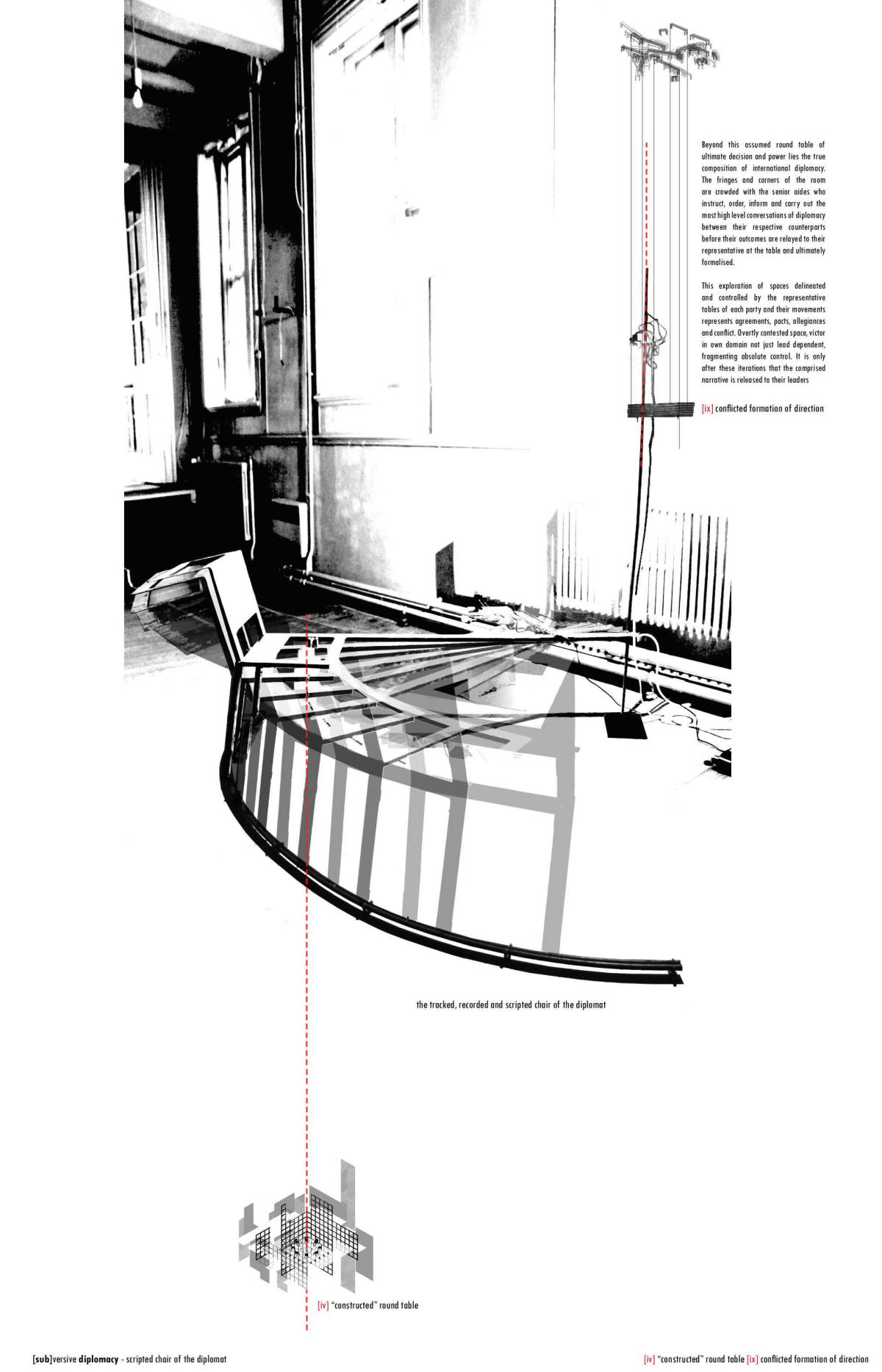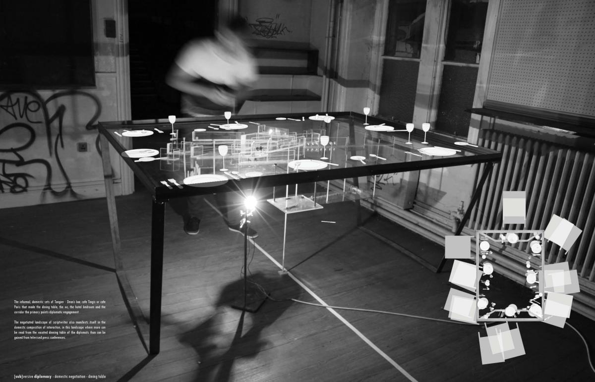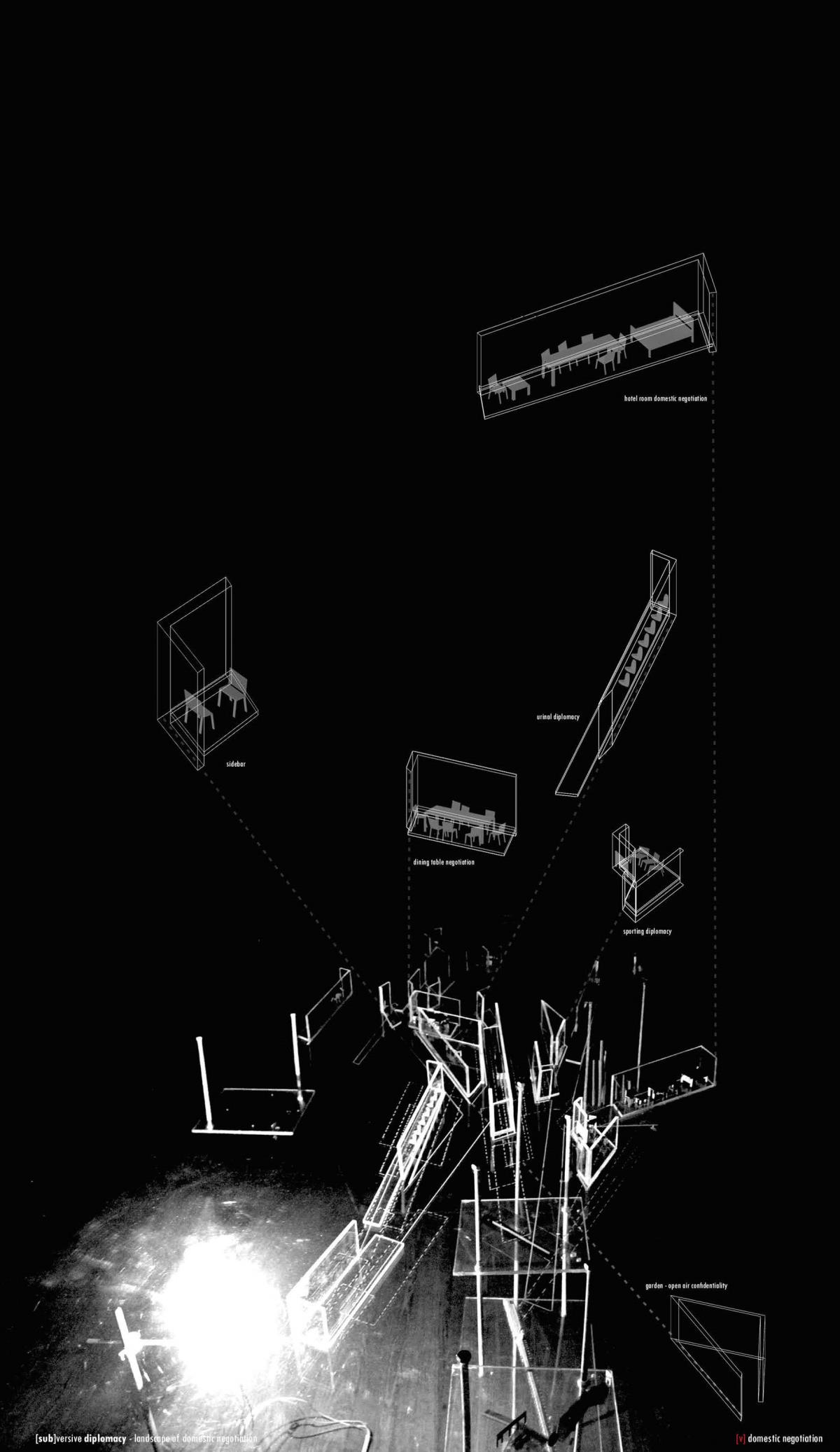 [sub]versive diplomacy Part 2 Project 2014 Alan Macilwraith University College Cork | Ireland Set in the tax-free zone of the now decentralised port of Tangier, Morocco the city and project act as a meeting ground between Europe and Africa. This long contested geographic stronghold had experienced the colonisation of the Portuguese, Spanish and British before its shared control by six European powers in the mid-20th century in its period as International Zone (Interzone). With Europe’s links to the west and North Africa’s links to the emerging Middle East, Tangier is poised once again on the boundaries of global powers. The site through its legal designation and perceived sovereign annex dictates the landscape suitable for the staging of the acts of international diplomacy. Responding to the suspended 40th G8 Summit to be held in Sochi, Russia the project aims to stage the meeting of the now G7 in this renewed Interzone.As a political proposition I have sought to form the spacial unseen of modern international diplomacy, and to reveal by a critical exploration that beyond what is represented in the media. Using architecture as the device to expose this unseen layer, the project aims to extract the worlds and influences of the diplomatic teams of aids and scriptwriters from the media shadow of the global leaders. Developing from the city’s historical fabric of meeting points of espionage in its cafes, bars and post offices the project explores operations in the domestic / everyday spaces, the real points of global diplomacy, the landscape in which the characteristics of the resultant agent of the city are deployed.The project explores the potential of furniture pieces to script and influence future scenarios, once cast aside by one composition they once again provide themselves for further iterations. Dispelling assumed hierarchies, the middle scale is eroded as the pieces of furniture begin to take on the physical operations of the global. While the materiality of this landscape may appear transparent, it is in the reflections and layerings of this most theatrical world of the domestic sets of diplomacy that the intent of this project is realised. Tutor(s) Jason O'Shaughnessy