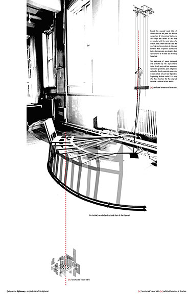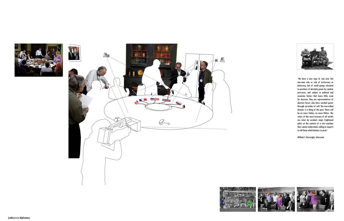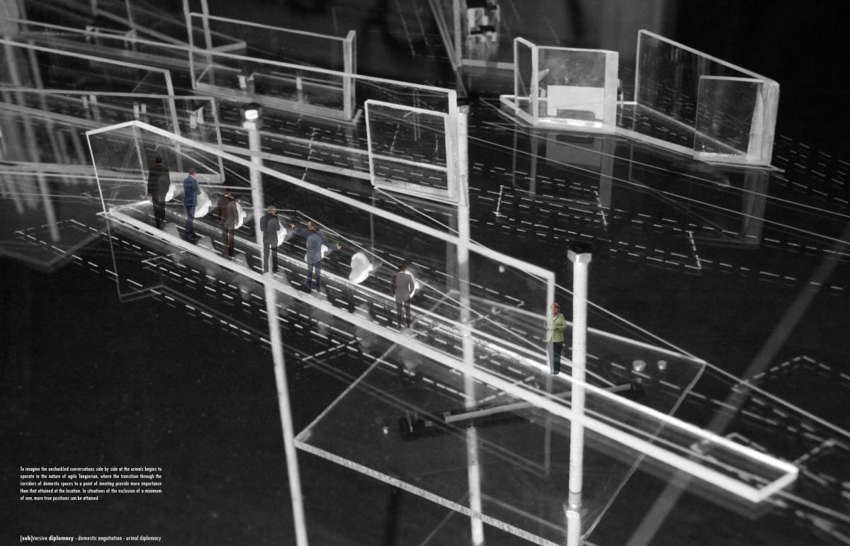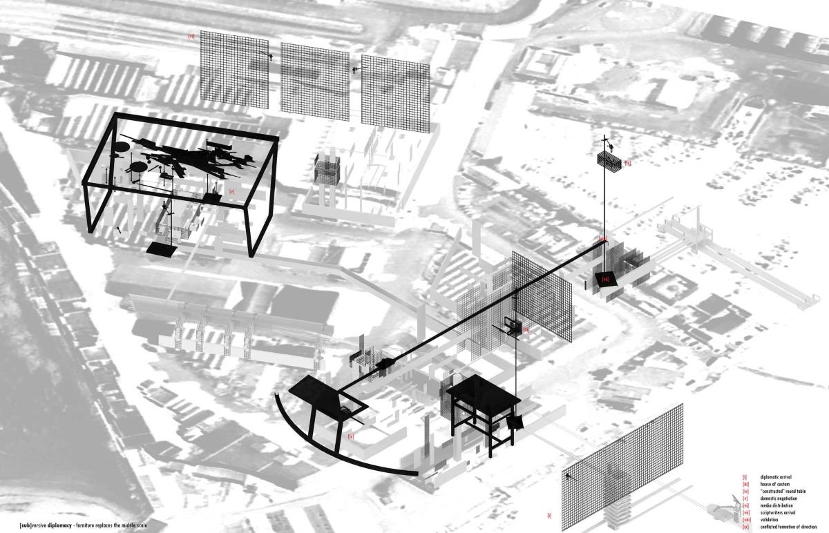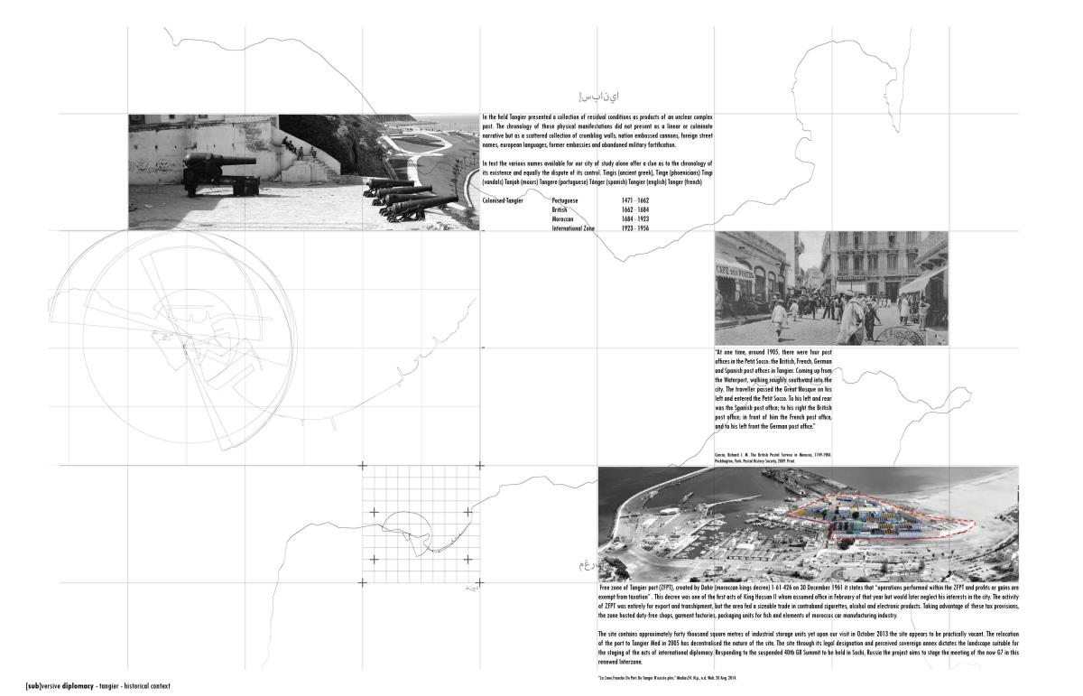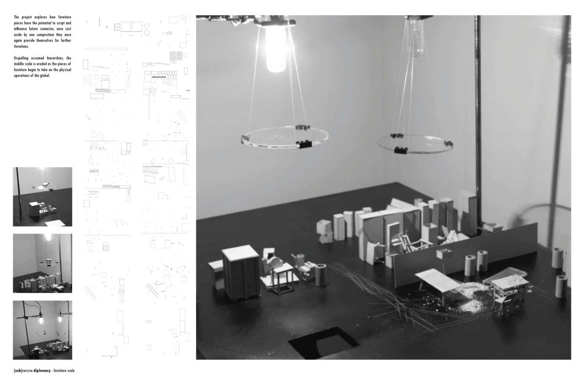 [sub]versive diplomacy Part 2 Project 2014 Alan Macilwraith University College Cork | Ireland Set in the tax-free zone of the now decentralised port of Tangier, Morocco the city and project act as a meeting ground between Europe and Africa. This long contested geographic stronghold had experienced the colonisation of the Portuguese, Spanish and British before its shared control by six European powers in the mid-20th century in its period as International Zone (Interzone). With Europe’s links to the west and North Africa’s links to the emerging Middle East, Tangier is poised once again on the boundaries of global powers. The site through its legal designation and perceived sovereign annex dictates the landscape suitable for the staging of the acts of international diplomacy. Responding to the suspended 40th G8 Summit to be held in Sochi, Russia the project aims to stage the meeting of the now G7 in this renewed Interzone.As a political proposition I have sought to form the spacial unseen of modern international diplomacy, and to reveal by a critical exploration that beyond what is represented in the media. Using architecture as the device to expose this unseen layer, the project aims to extract the worlds and influences of the diplomatic teams of aids and scriptwriters from the media shadow of the global leaders. Developing from the city’s historical fabric of meeting points of espionage in its cafes, bars and post offices the project explores operations in the domestic / everyday spaces, the real points of global diplomacy, the landscape in which the characteristics of the resultant agent of the city are deployed.The project explores the potential of furniture pieces to script and influence future scenarios, once cast aside by one composition they once again provide themselves for further iterations. Dispelling assumed hierarchies, the middle scale is eroded as the pieces of furniture begin to take on the physical operations of the global. While the materiality of this landscape may appear transparent, it is in the reflections and layerings of this most theatrical world of the domestic sets of diplomacy that the intent of this project is realised. Tutor(s) Jason O'Shaughnessy