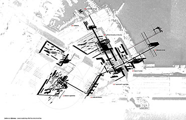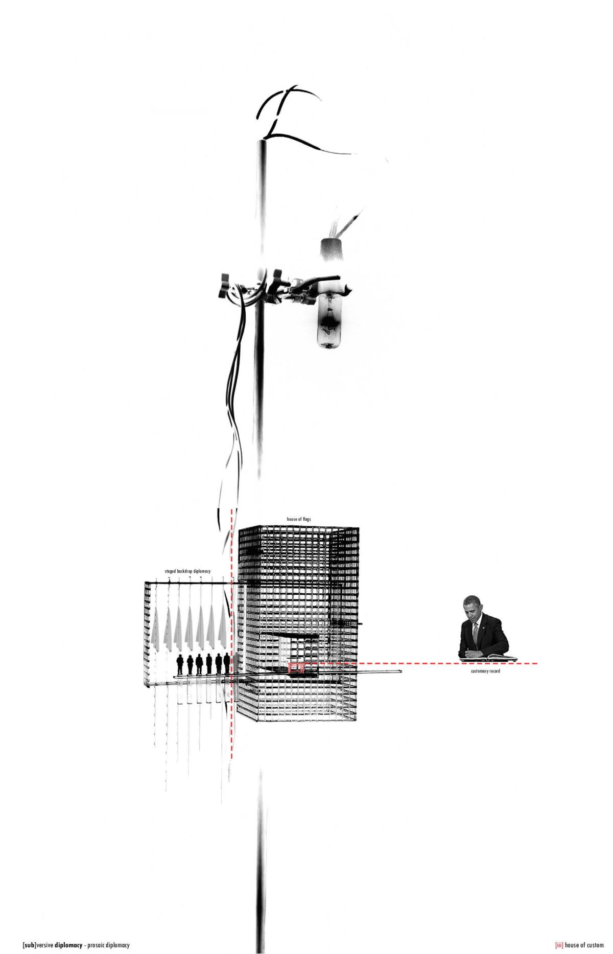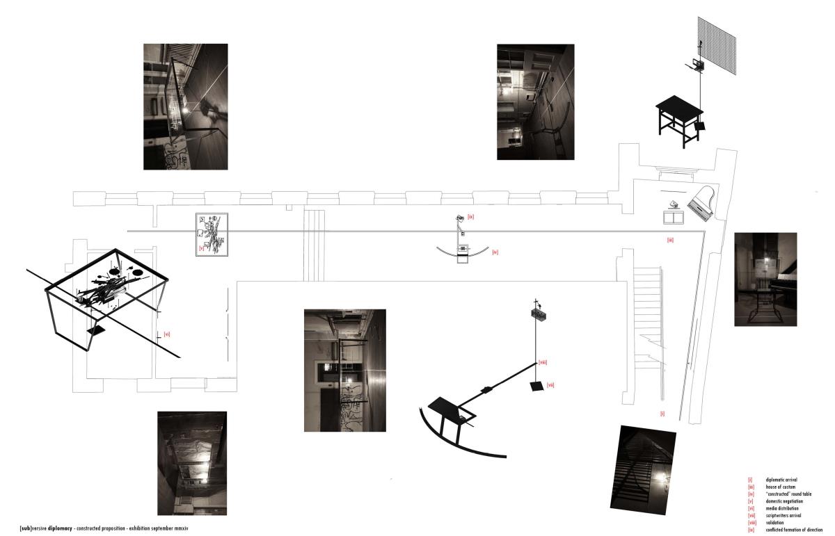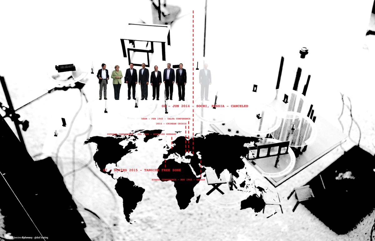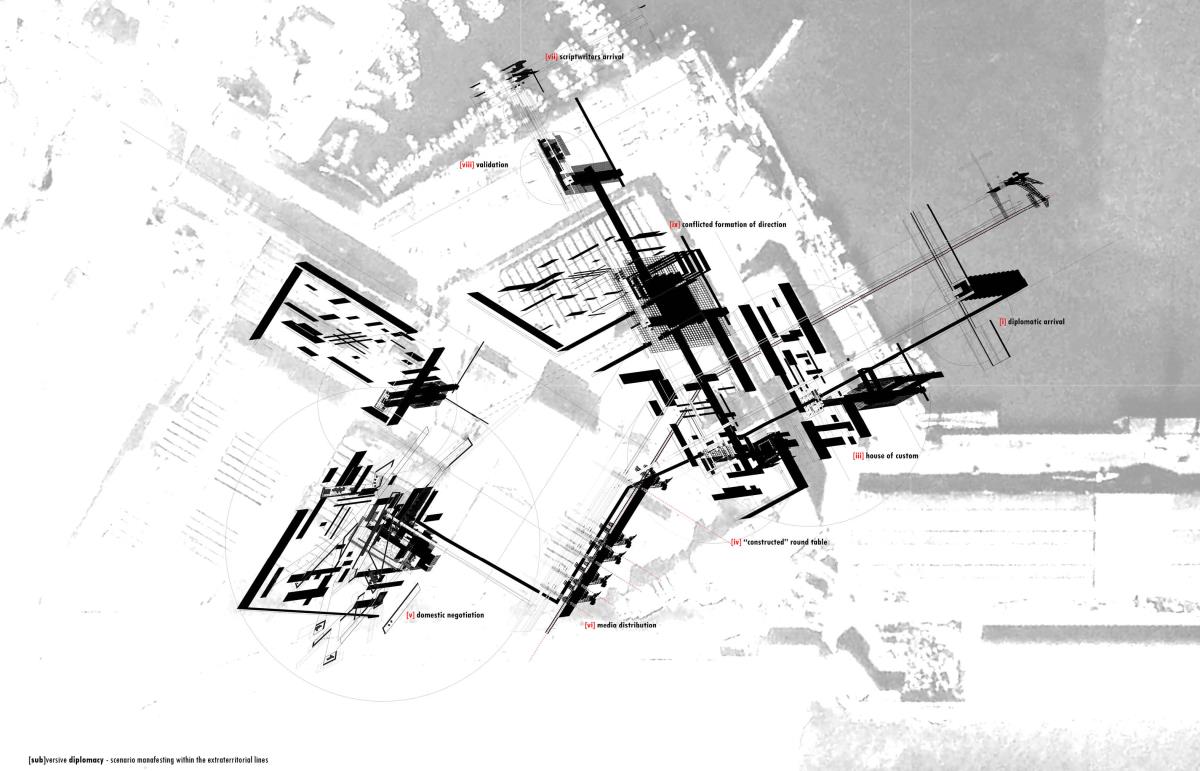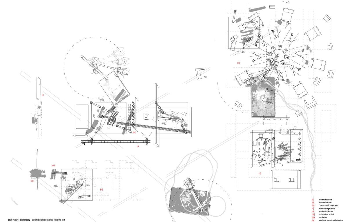 [sub]versive diplomacy Part 2 Project 2014 Alan Macilwraith University College Cork | Ireland Set in the tax-free zone of the now decentralised port of Tangier, Morocco the city and project act as a meeting ground between Europe and Africa. This long contested geographic stronghold had experienced the colonisation of the Portuguese, Spanish and British before its shared control by six European powers in the mid-20th century in its period as International Zone (Interzone). With Europe’s links to the west and North Africa’s links to the emerging Middle East, Tangier is poised once again on the boundaries of global powers. The site through its legal designation and perceived sovereign annex dictates the landscape suitable for the staging of the acts of international diplomacy. Responding to the suspended 40th G8 Summit to be held in Sochi, Russia the project aims to stage the meeting of the now G7 in this renewed Interzone.As a political proposition I have sought to form the spacial unseen of modern international diplomacy, and to reveal by a critical exploration that beyond what is represented in the media. Using architecture as the device to expose this unseen layer, the project aims to extract the worlds and influences of the diplomatic teams of aids and scriptwriters from the media shadow of the global leaders. Developing from the city’s historical fabric of meeting points of espionage in its cafes, bars and post offices the project explores operations in the domestic / everyday spaces, the real points of global diplomacy, the landscape in which the characteristics of the resultant agent of the city are deployed.The project explores the potential of furniture pieces to script and influence future scenarios, once cast aside by one composition they once again provide themselves for further iterations. Dispelling assumed hierarchies, the middle scale is eroded as the pieces of furniture begin to take on the physical operations of the global. While the materiality of this landscape may appear transparent, it is in the reflections and layerings of this most theatrical world of the domestic sets of diplomacy that the intent of this project is realised. Tutor(s) Jason O'Shaughnessy