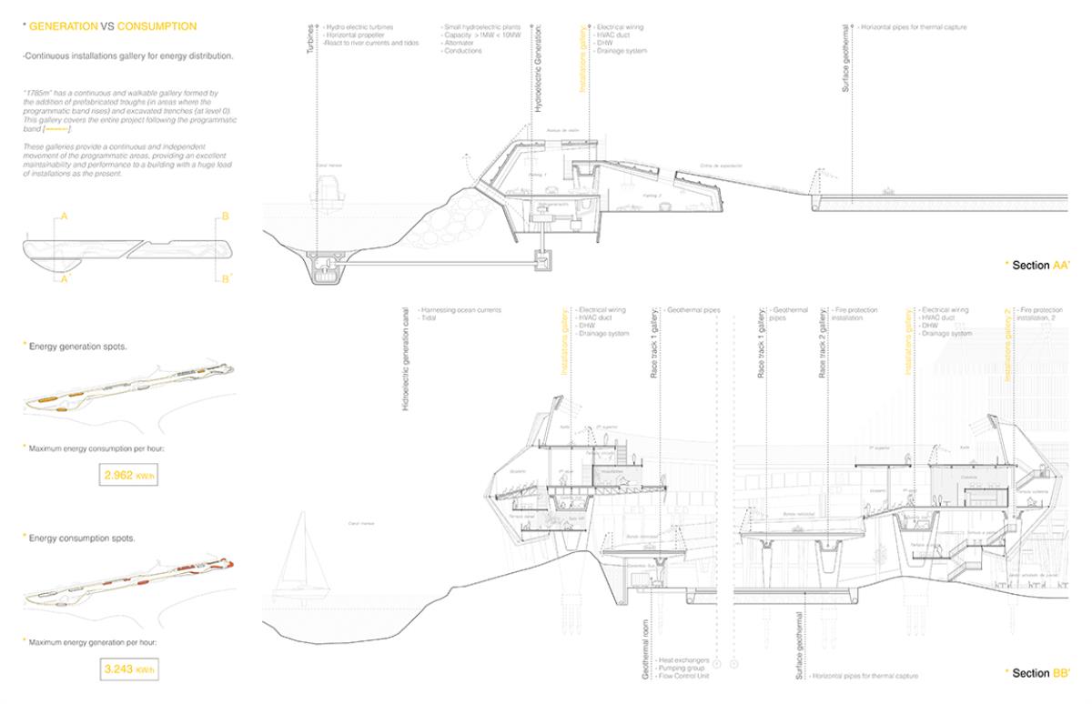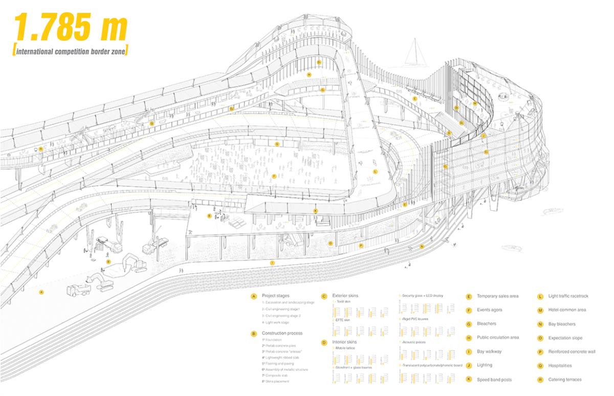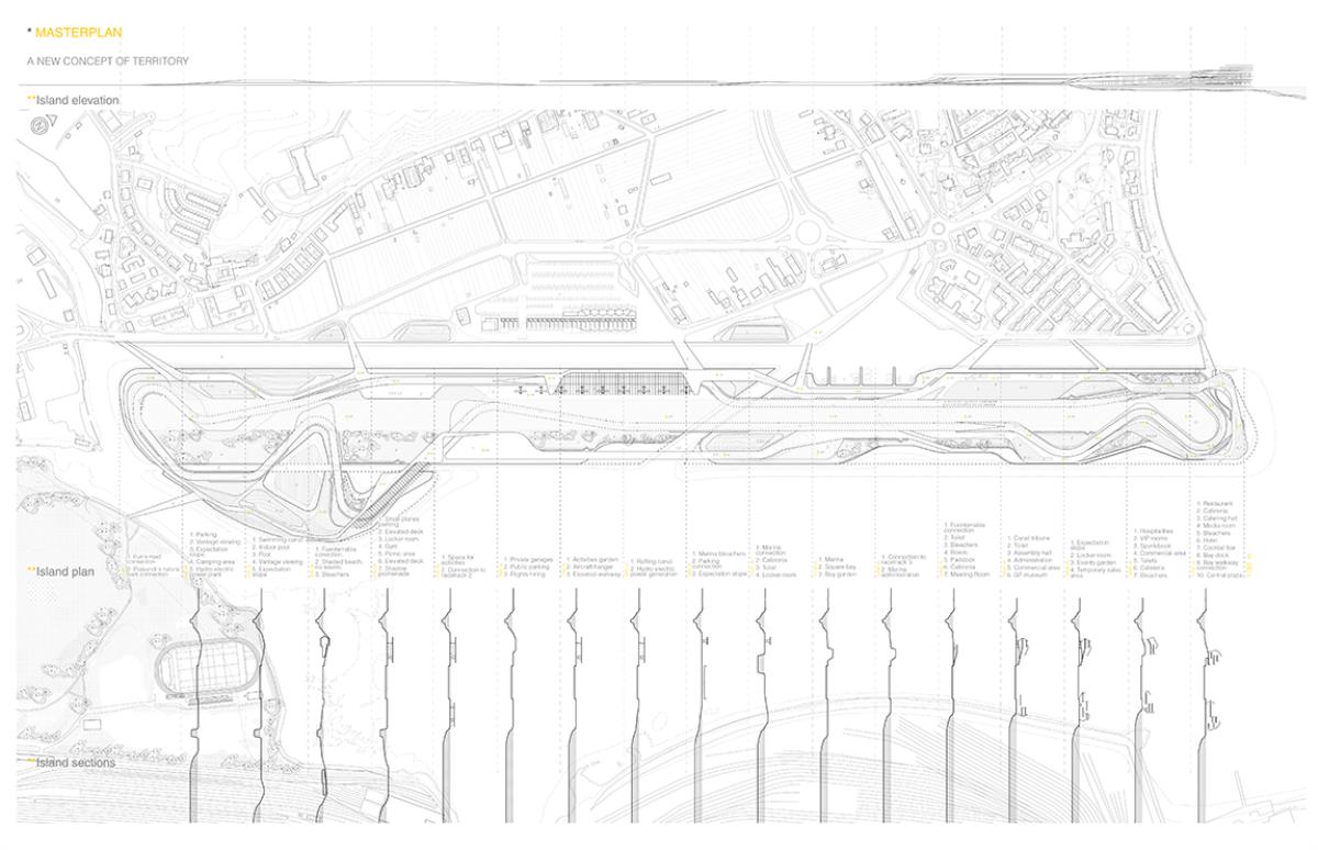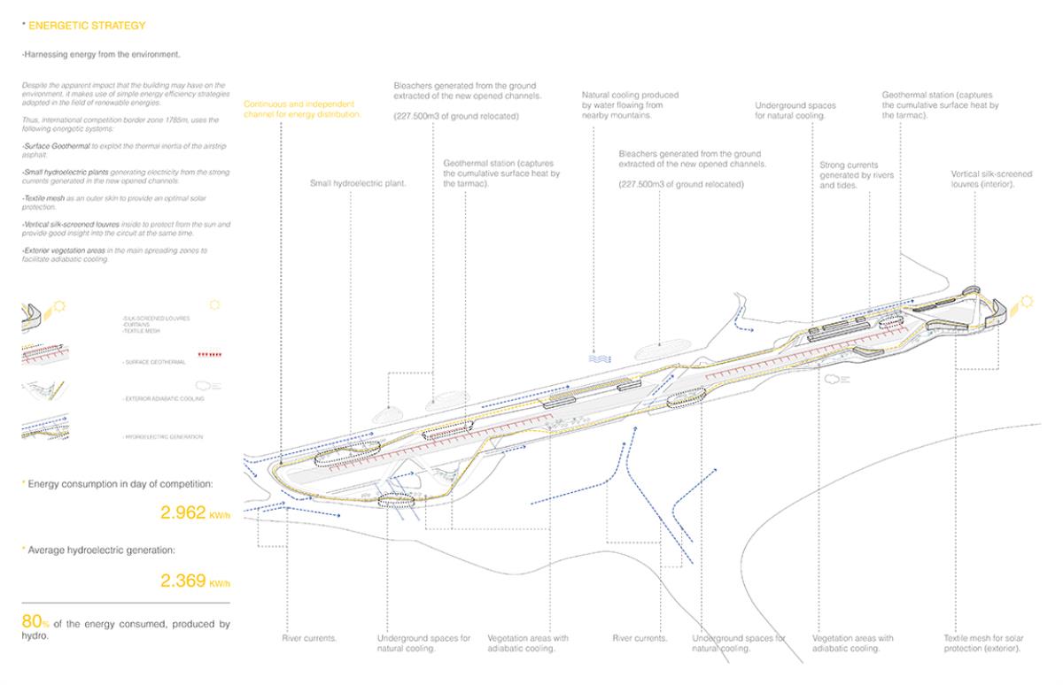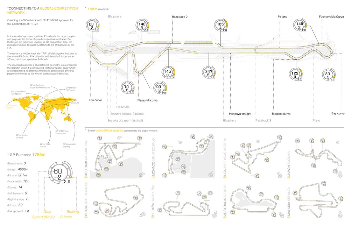 In accordance with this analysis is where project 1785m becomes a reality, turning itself into a new and powerful experience gatherer, capable of offering that hybrid and complex idle offer that works as a point of attraction for both local and global tourism. It manages all this by taking advantage and extracting all the economical, cultural and environmental factors of the environment to reach a sustainable development in the short and long term. The old airport will now be converted into an international island that has been conceived for speed competitions, a space fitted with water channels for sporting competitions such as rowing, sailing, etc. Indoor and open air pools, hangars for gliding, a runway 1km long for small planes. A multi-use track for go karting, cycling and skating. And as a culmination to the project it offers a 4000m track with ''FIA'' official approval for the celebration of F1 GP.